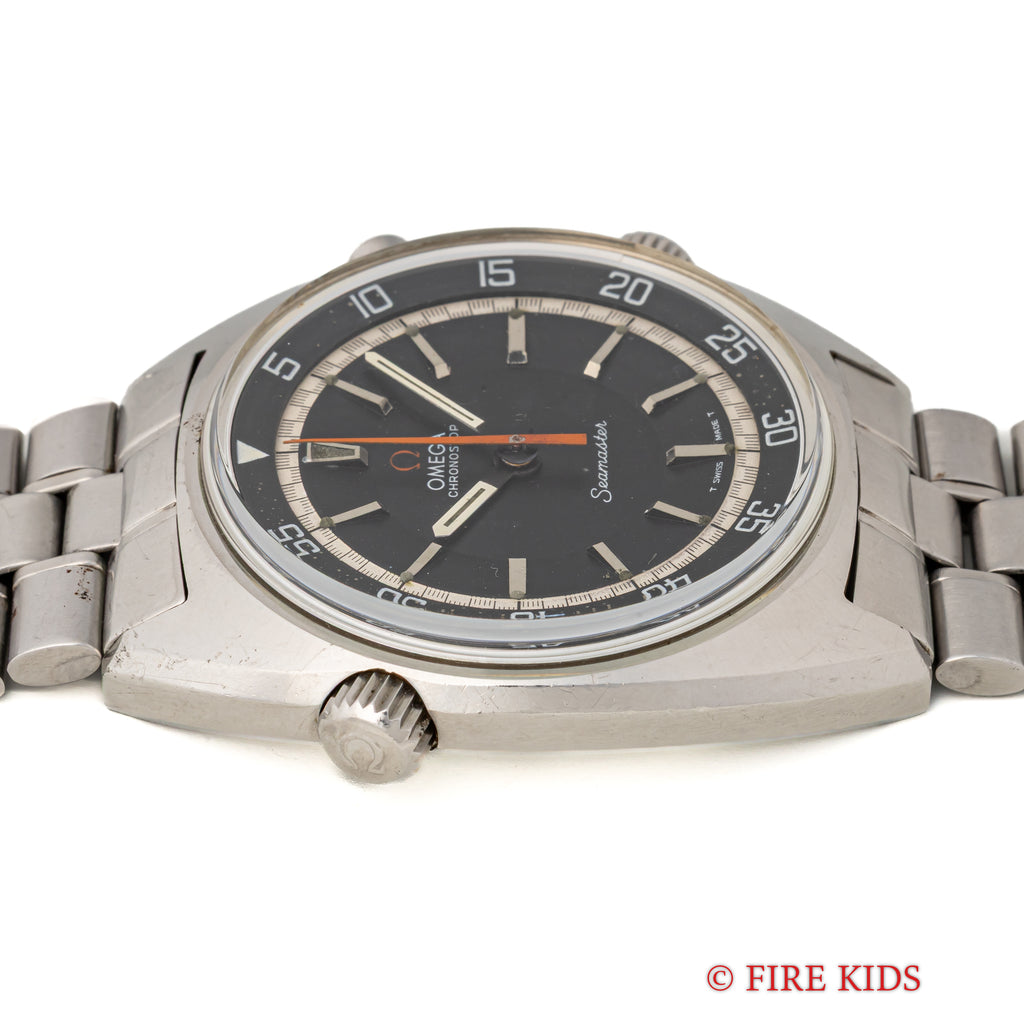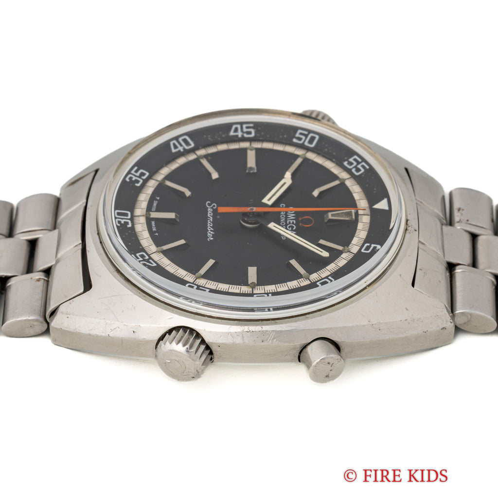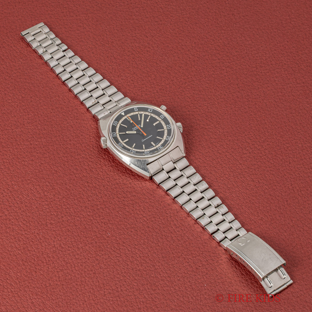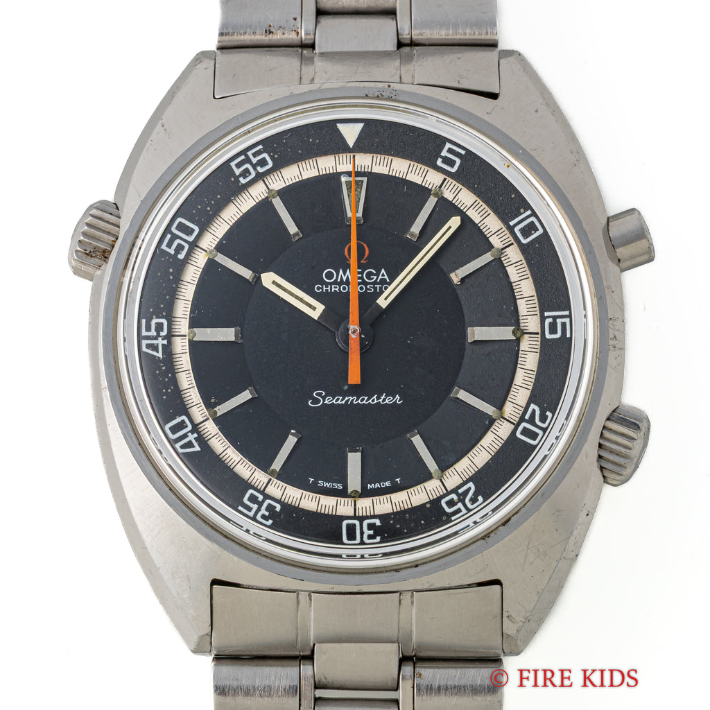 オメガ クロノストップ 手巻き Cal.865 1969年製 純正ブレス付きです。回転式インナーベゼルを備えたオメガならではの手の込んだ機械式ワンプッシュクロノ搭載の魅力あふれる一本です。ブラックダイヤルは年代なりの経年はありますが良い雰囲気です。オレンジの針が良いアクセントになっています。ムーブメントはスピードマスタープロフェショナルに採用された861を簡略化したCal.865を搭載した簡易式クロノグラフで、プッシャーを1回押すとオレンジの針がスタート、もう1回押すとストップ、離すとリセットされます。手巻きや針回しの操作感はスムースです。純正ブレス付きです。