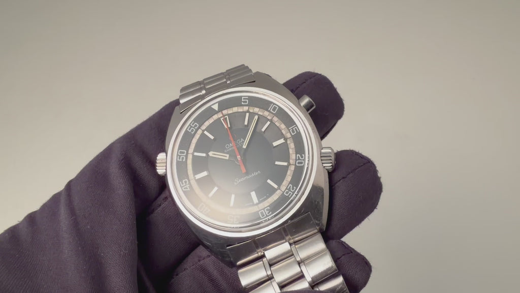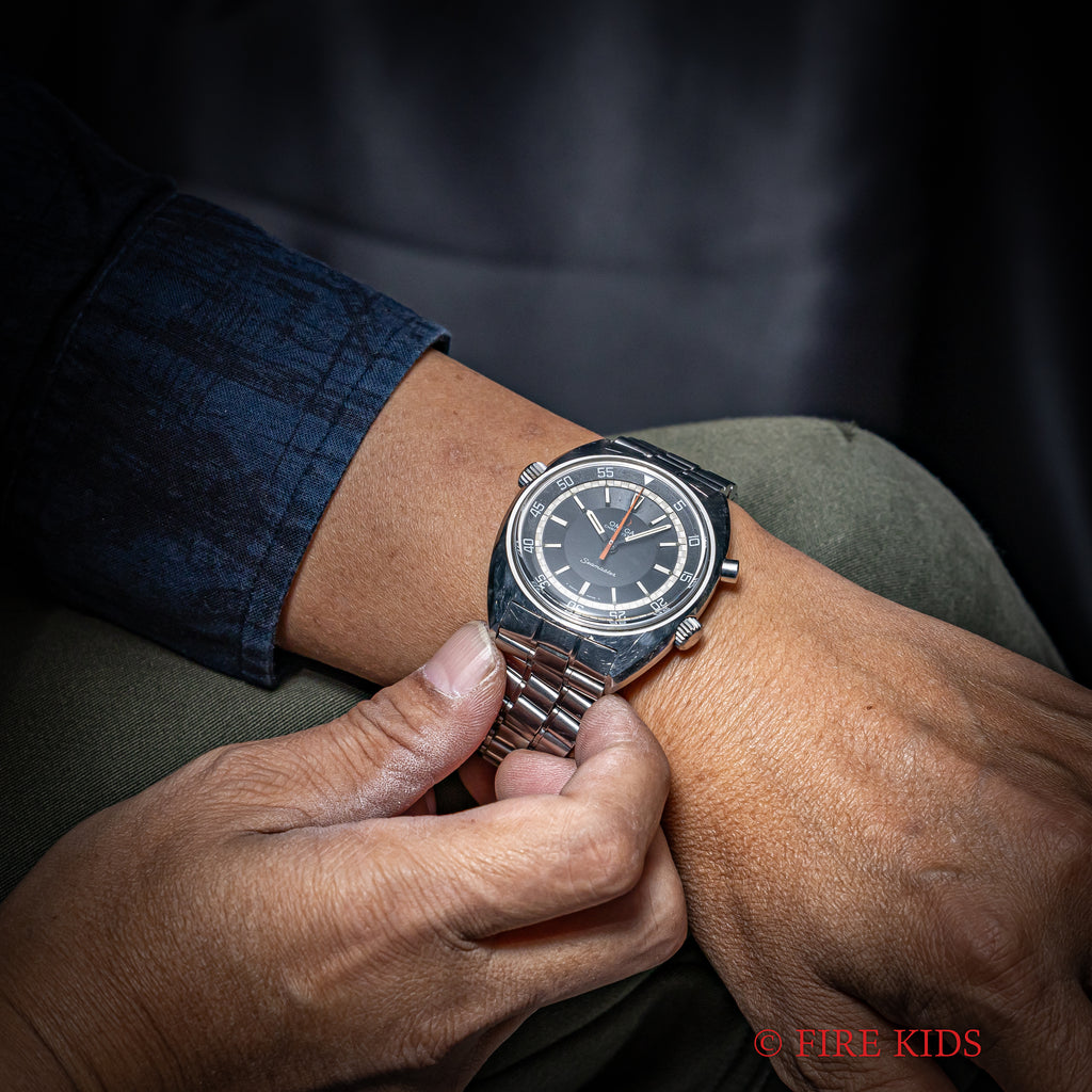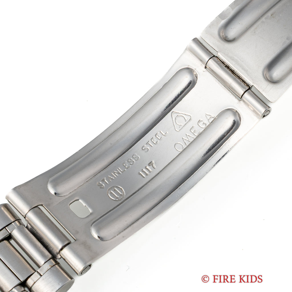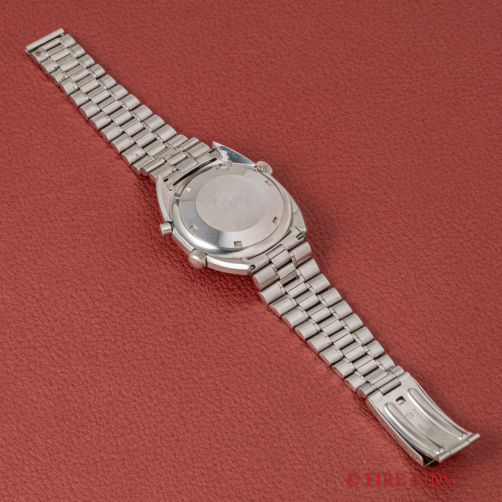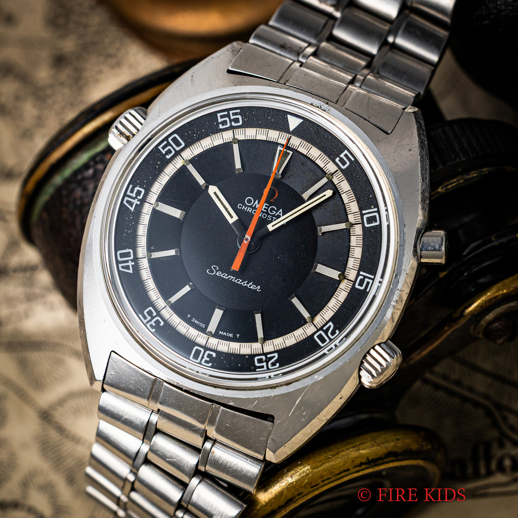 オメガ クロノストップ 手巻き Cal.865 1969年製 純正ブレス付きです。回転式インナーベゼルを備えたオメガならではの手の込んだ機械式ワンプッシュクロノ搭載の魅力あふれる一本です。ブラックダイヤルは年代なりの経年はありますが良い雰囲気です。オレンジの針が良いアクセントになっています。ムーブメントはスピードマスタープロフェショナルに採用された861を簡略化したCal.865を搭載した簡易式クロノグラフで、プッシャーを1回押すとオレンジの針がスタート、もう1回押すとストップ、離すとリセットされます。手巻きや針回しの操作感はスムースです。純正ブレス付きです。