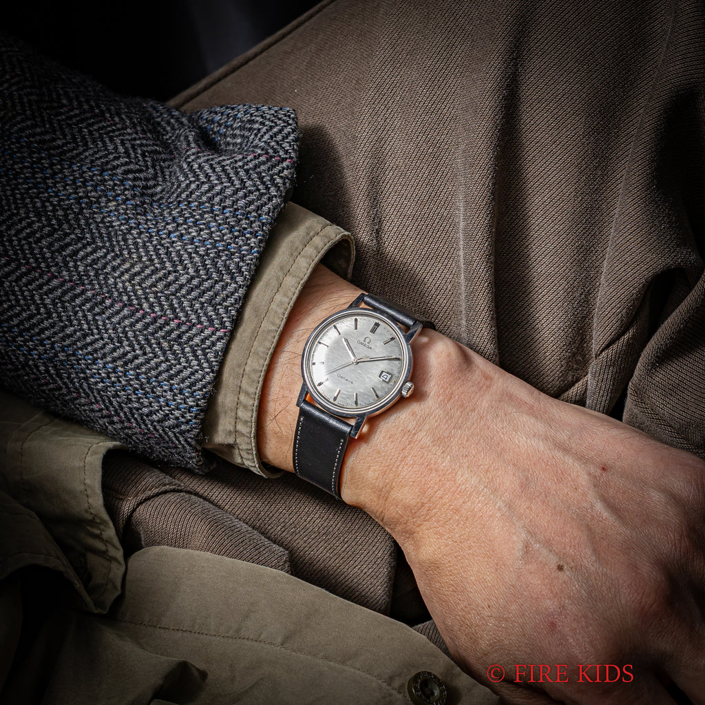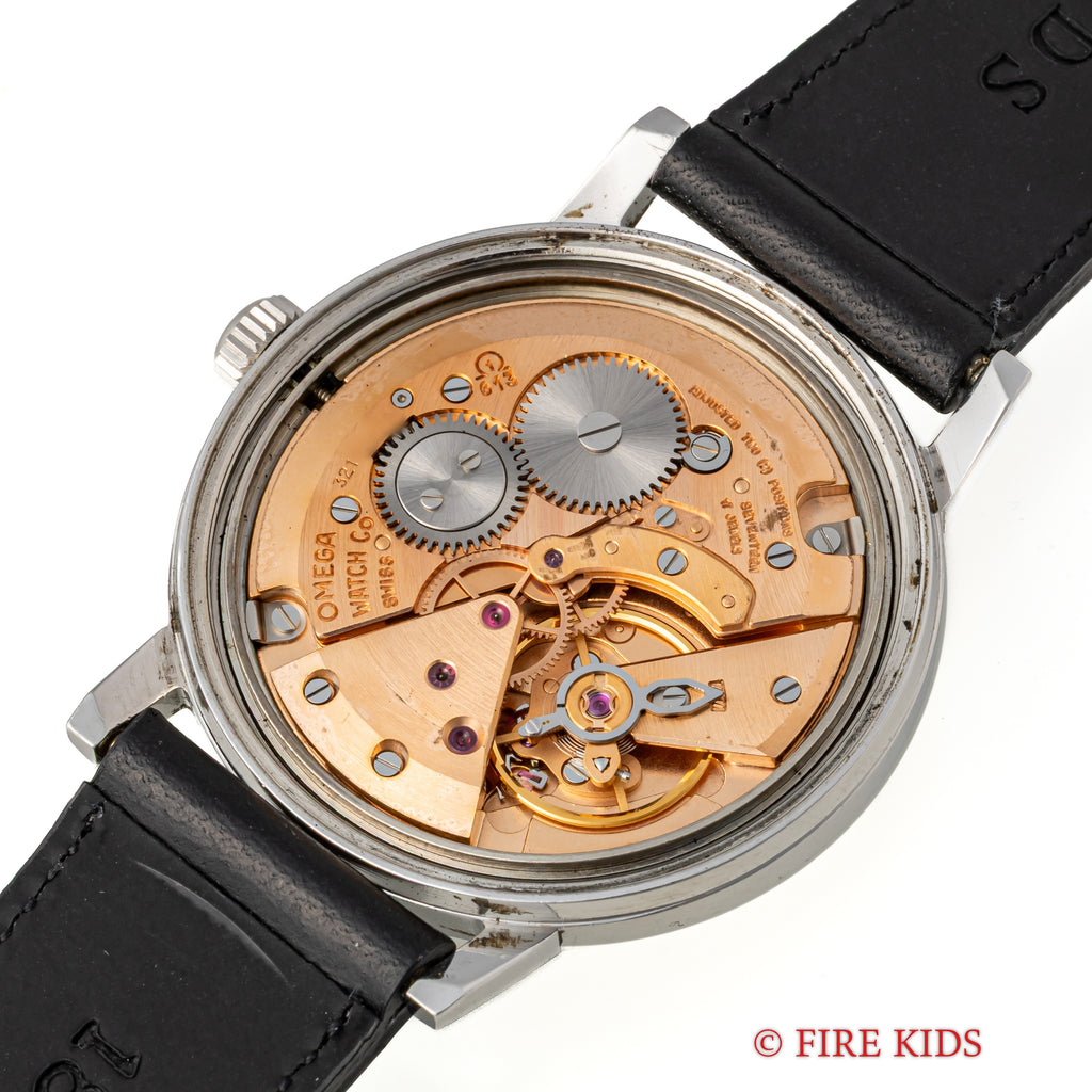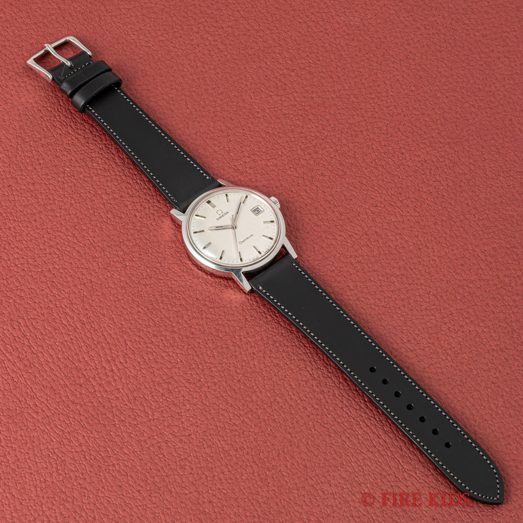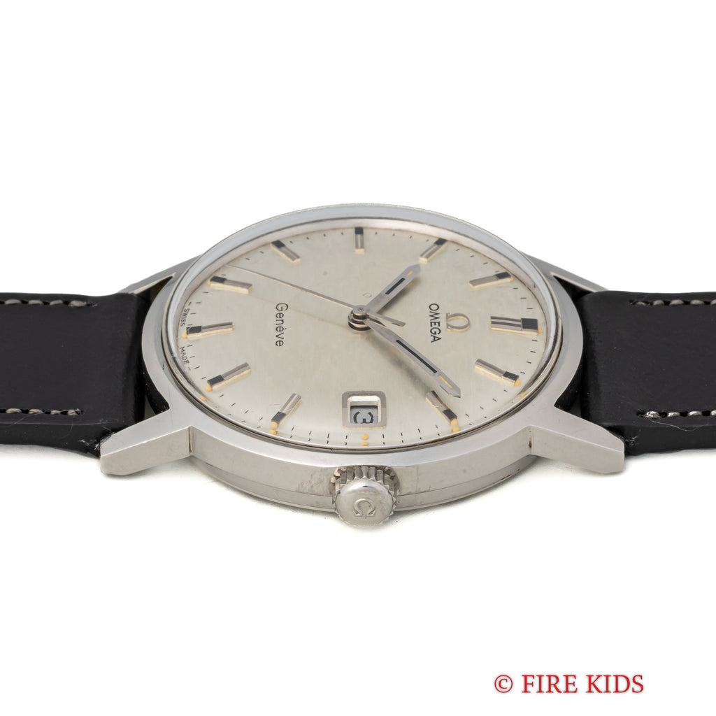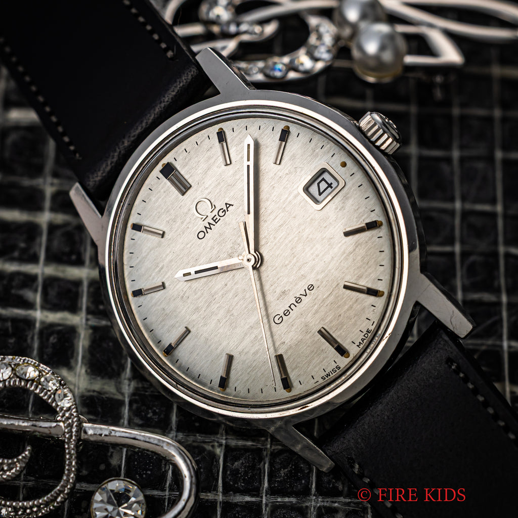 オメガ ジュネーブ 1970年製 変わり文字盤 手巻き Cal.613です。モザイクともブリックとも何とも形容しがたいシルバーのダイヤルは中々見る機会の無い良い一本です。文字盤、ケースともに多少の経年、小傷程度です。二段引きでクイックチェンジ機能付きのCal.613を搭載しています。ファイアーキッズオリジナルのブッテーロカーフレザーを合わせています。