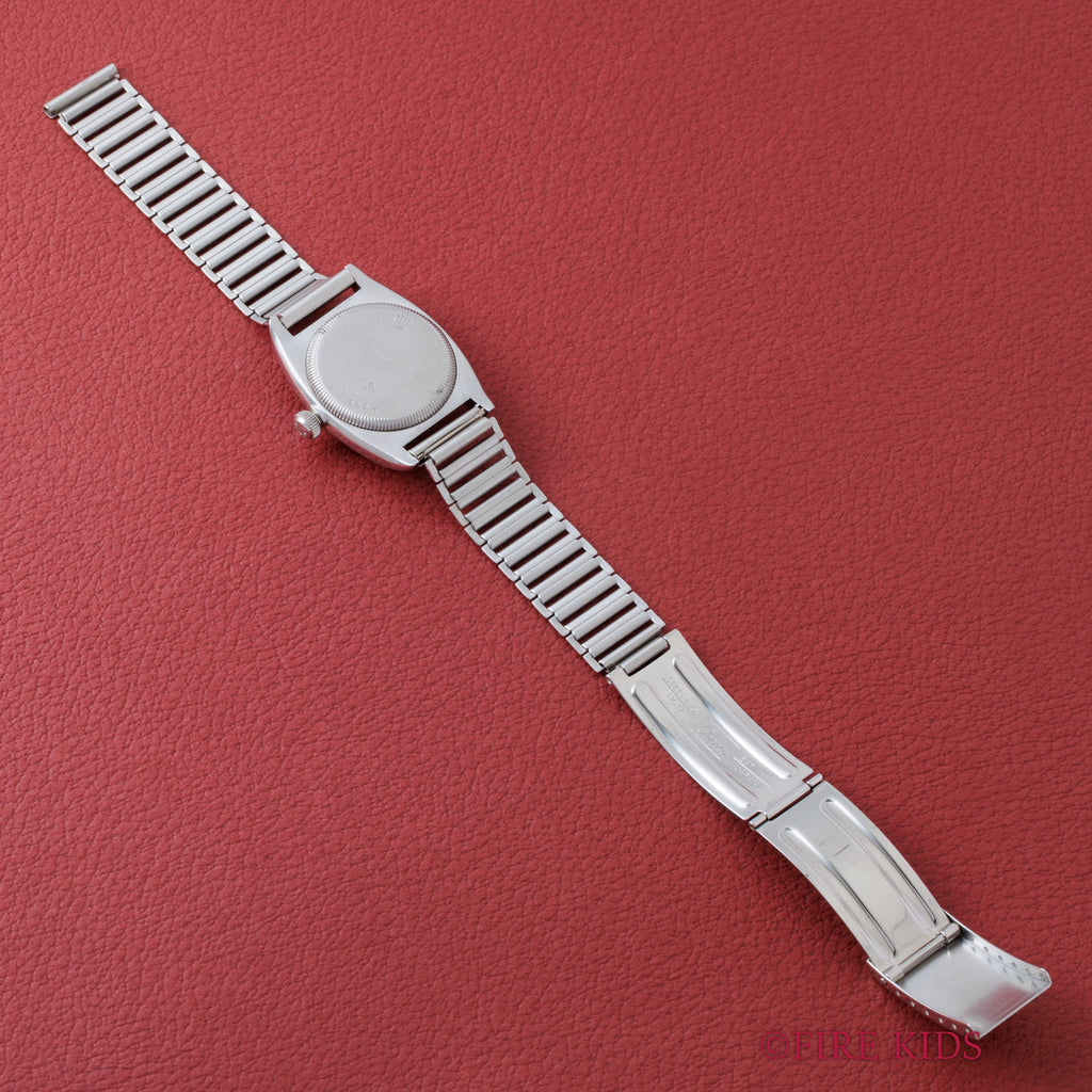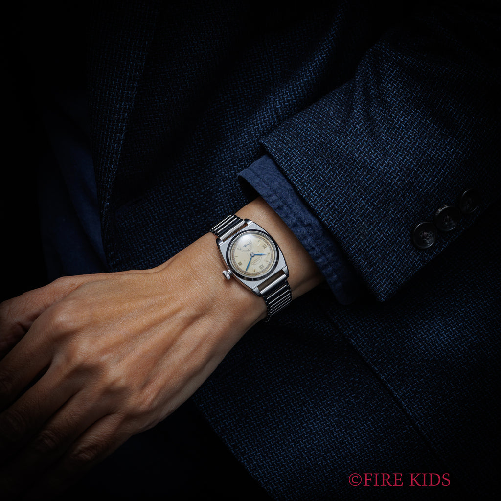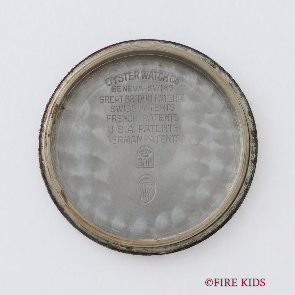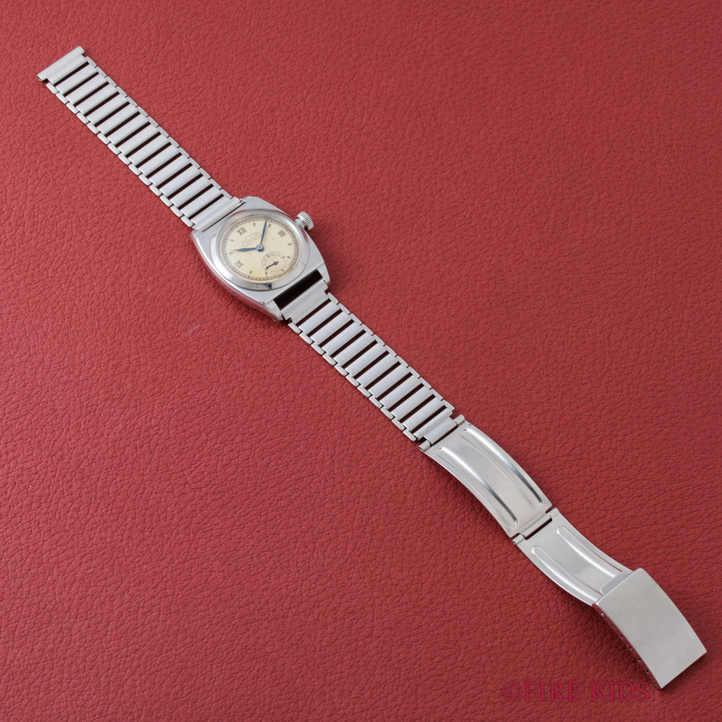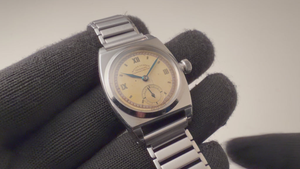 1940年に製造されたロレックスの手巻きオイスターモデル、「バイセロイ」です。このモデルは、まだ防水時計が一般的でなかった時代に発明されたオイスターケースとねじ込みリューズを装備。当時のパテントリューズが保存活用されています。さらに、高精度を証明するクロノメーターをクリアしたムーブメントを搭載。文字盤は通称「目の眼ダイヤル」と呼ばれる二段構成のデザインを持ち、クラシックなスモールセコンド(スモセコ)が配置されます。ロレックスの歴史的な基礎を築いた、堅牢かつ風格ある一本です。社外のバンブータイプのブレスが付いてます。
