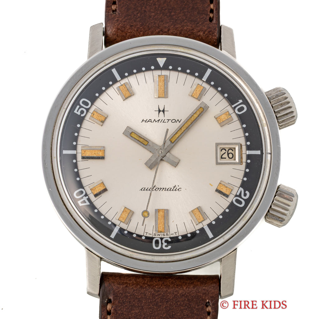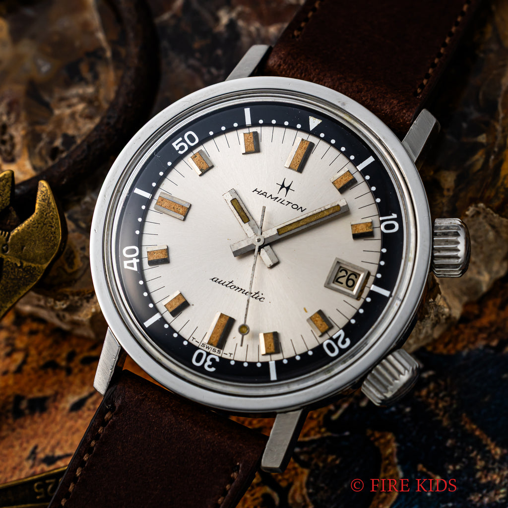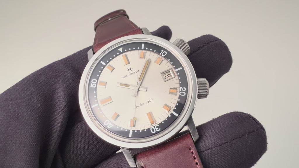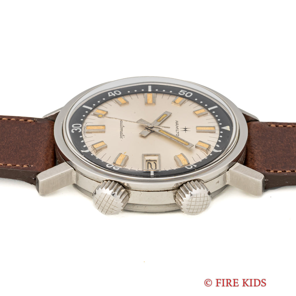 ハミルトンアクアデイト600 1960年代 36㎜スーパーコンプレッサーケース 自動巻 インナー回転ベゼルの入荷になります。近年価格が高騰しているEPSA社のスーパーコンプレッサーケースを採用した1960年代のダイバーウォッチです。36mm(リューズ別)サイズのコンパクトなダイバーズウオッチでリューズが二つ付いており、4時側でムーブメントの操作、2時側でインナー内転リングを回すことができます。シルバーダイアルにブラックのインナー内転リングのツートーンダイアルがカッコ良く、オリジナルの文字盤は経年変化の出た良い雰囲気の色合いになっております。ベルトファイアーキッズオリジナル、イタリアンレザーのブッテーロ(裏面ラバー)が取り付けられています。