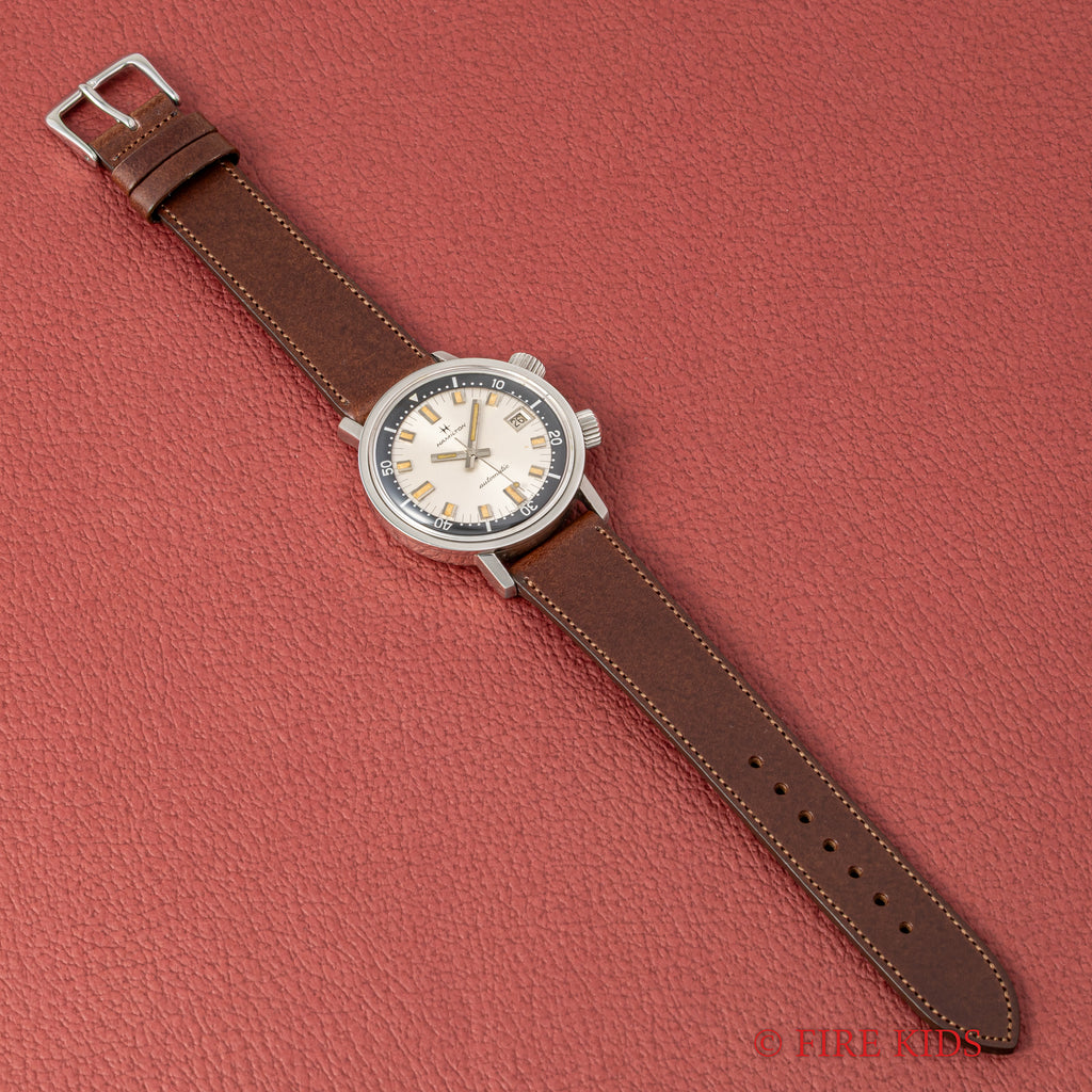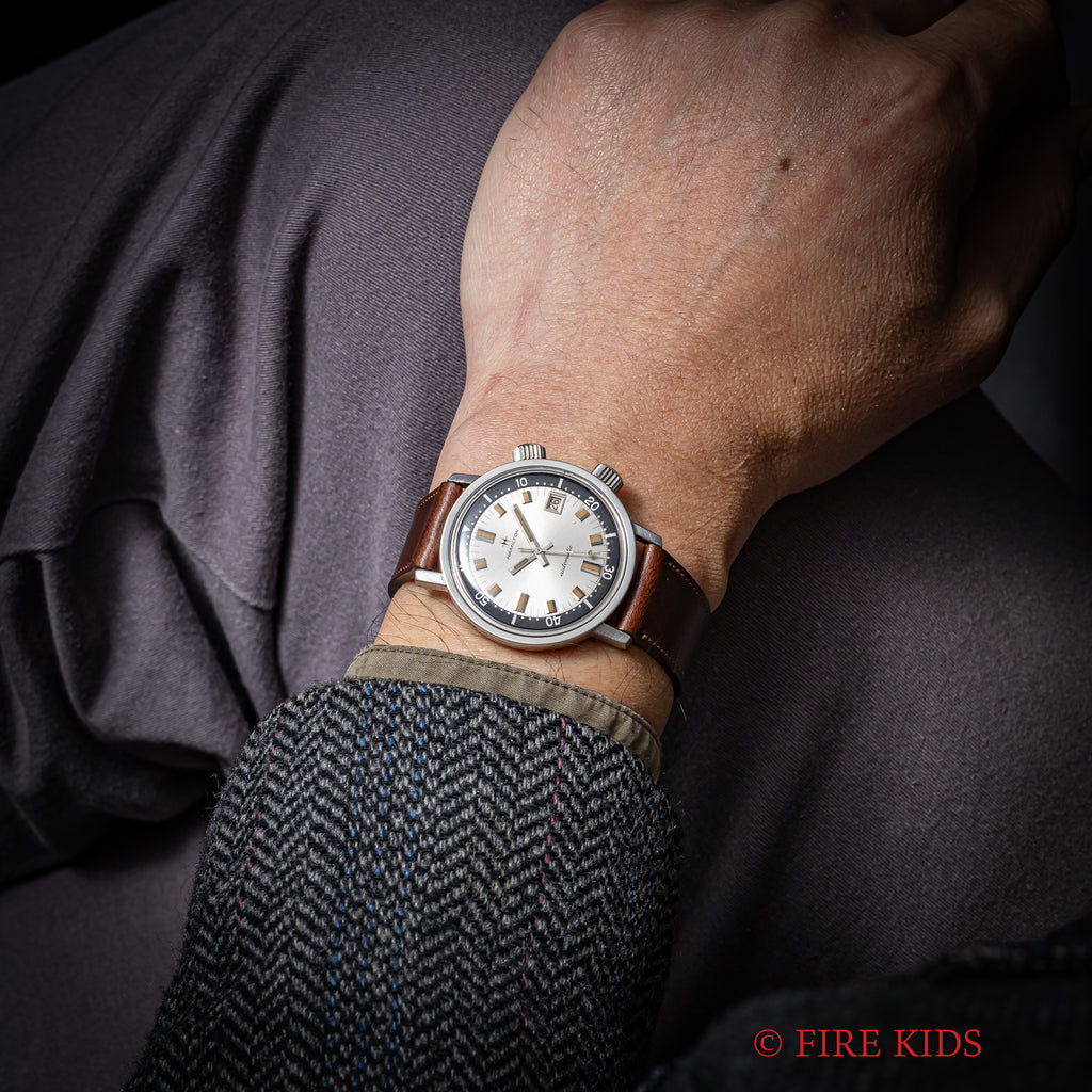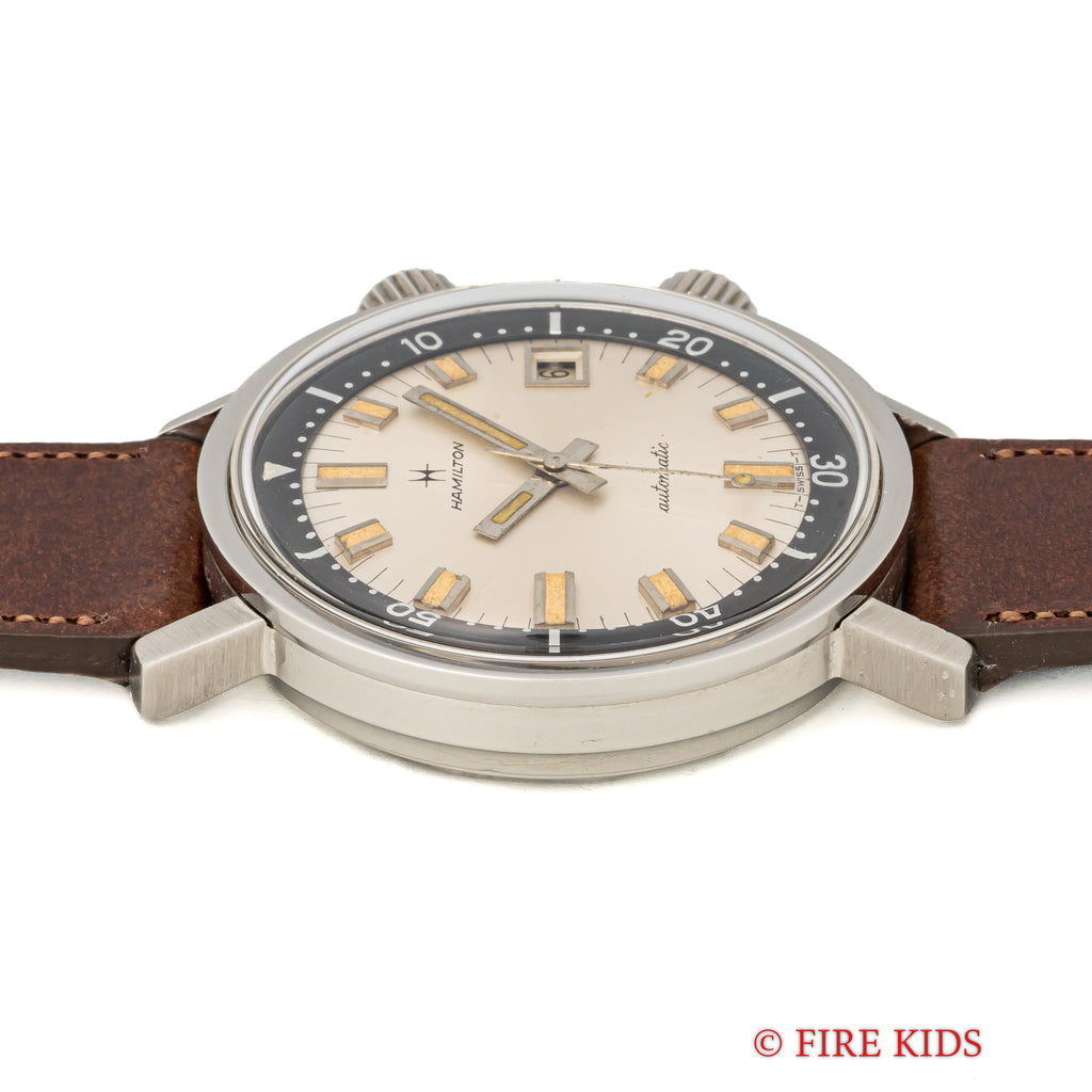 ハミルトンアクアデイト600 1960年代 36㎜スーパーコンプレッサーケース 自動巻 インナー回転ベゼルの入荷になります。近年価格が高騰しているEPSA社のスーパーコンプレッサーケースを採用した1960年代のダイバーウォッチです。36mm(リューズ別)サイズのコンパクトなダイバーズウオッチでリューズが二つ付いており、4時側でムーブメントの操作、2時側でインナー内転リングを回すことができます。シルバーダイアルにブラックのインナー内転リングのツートーンダイアルがカッコ良く、オリジナルの文字盤は経年変化の出た良い雰囲気の色合いになっております。ベルトファイアーキッズオリジナル、イタリアンレザーのブッテーロ(裏面ラバー)が取り付けられています。