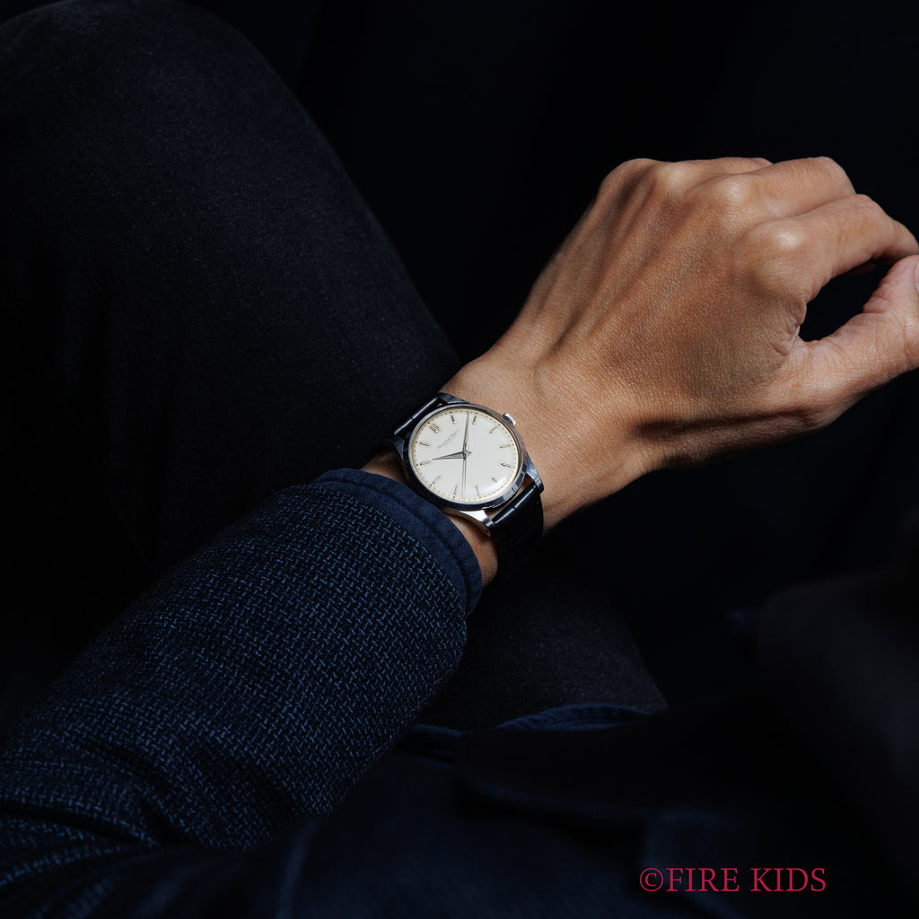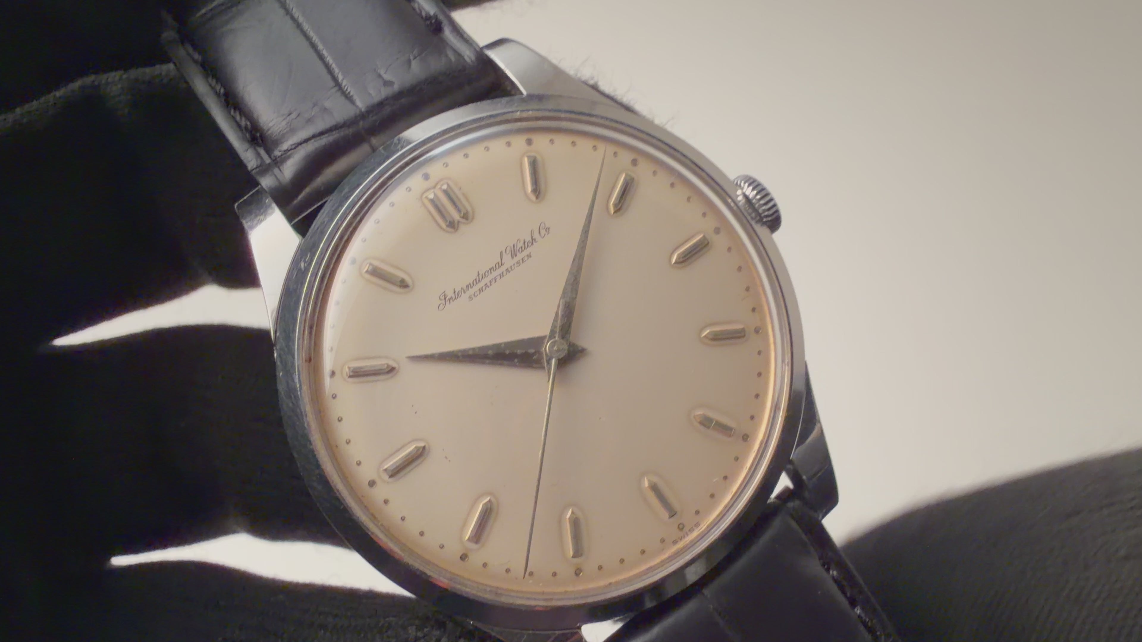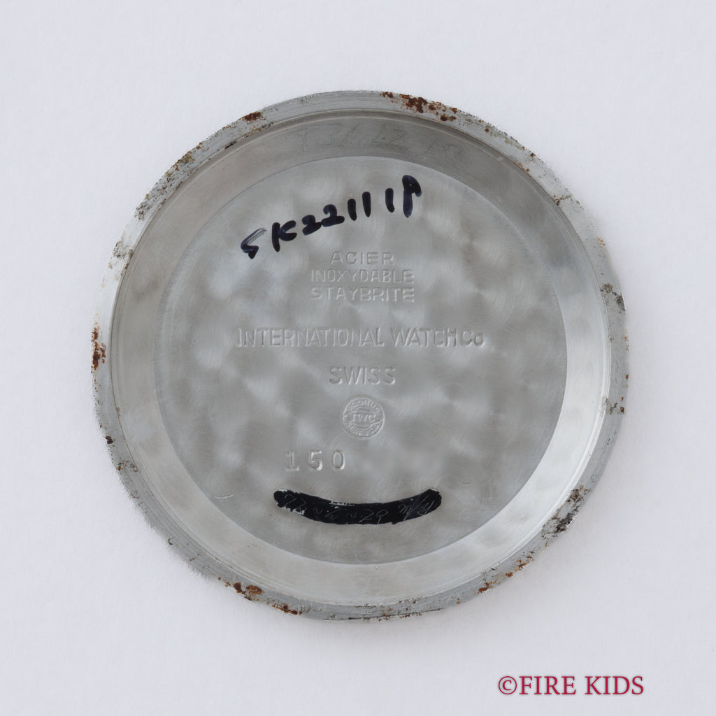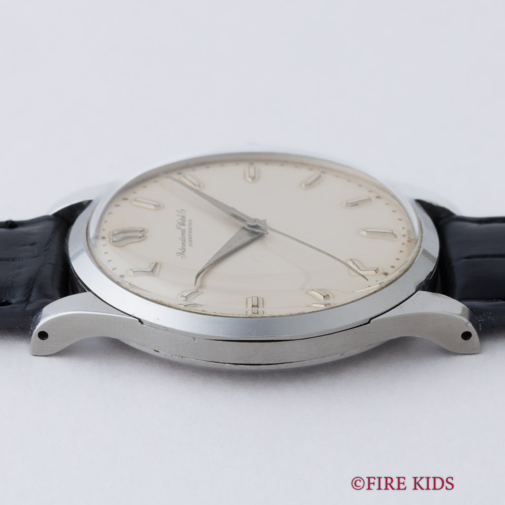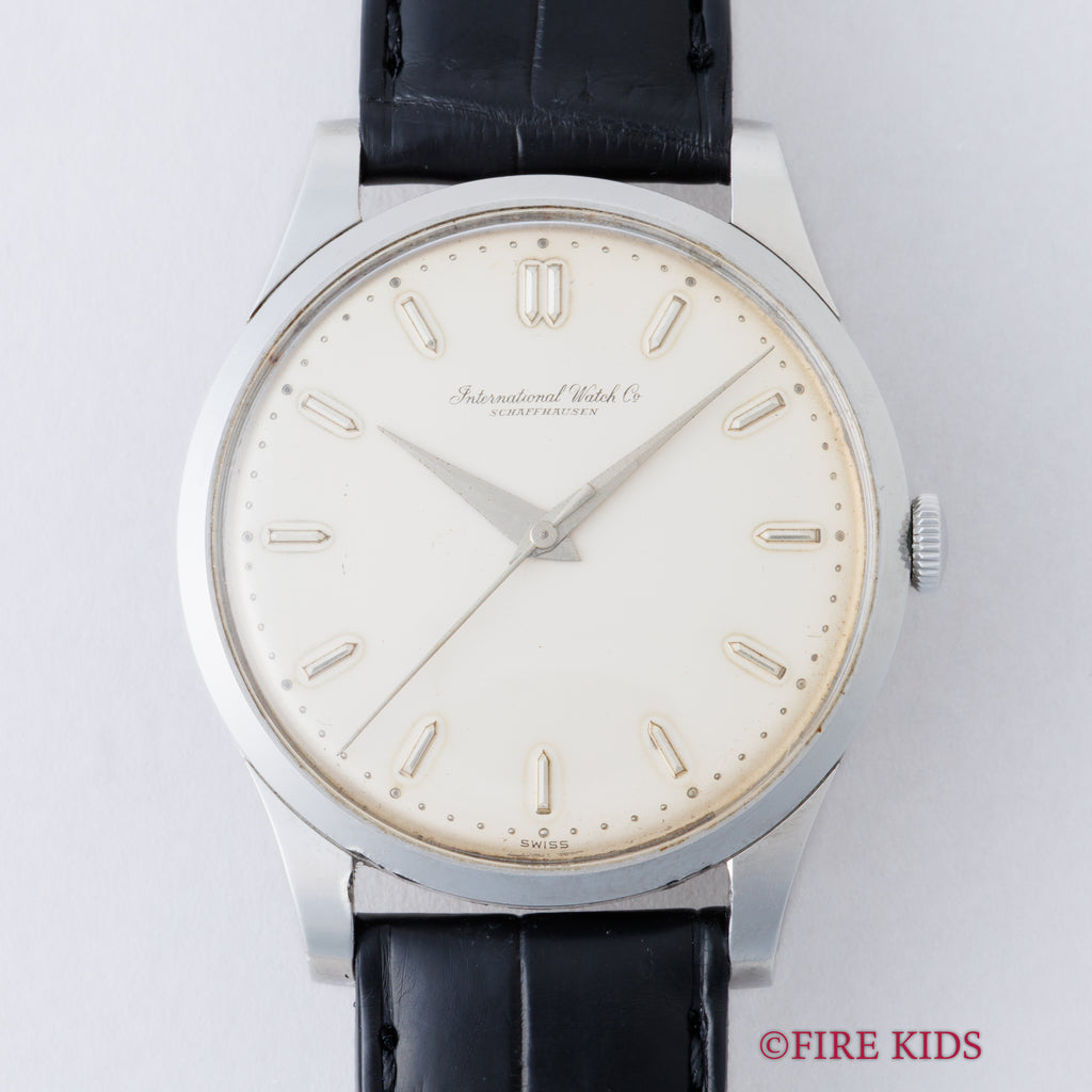 インターナショナルウォッチカンパニー1958年製 ラウンド手巻モデルです。搭載キャリバーはマークⅪに採用されている事でも有名な手巻きの名機Cal.89。ケースはシンプルなラウンド型で、IWCらしい質実剛健さを感じる一本です。文字盤は砲弾インデックス、パールドットの組み合わせに全体が経年変化したヴィンテージらしい雰囲気になっています。ケースは小傷はありますが大きなダメージはございません。手巻きや針回しの操作はスムーズです。ファイアーキッズオリジナルクロコダイル革ベルトを合わせています。