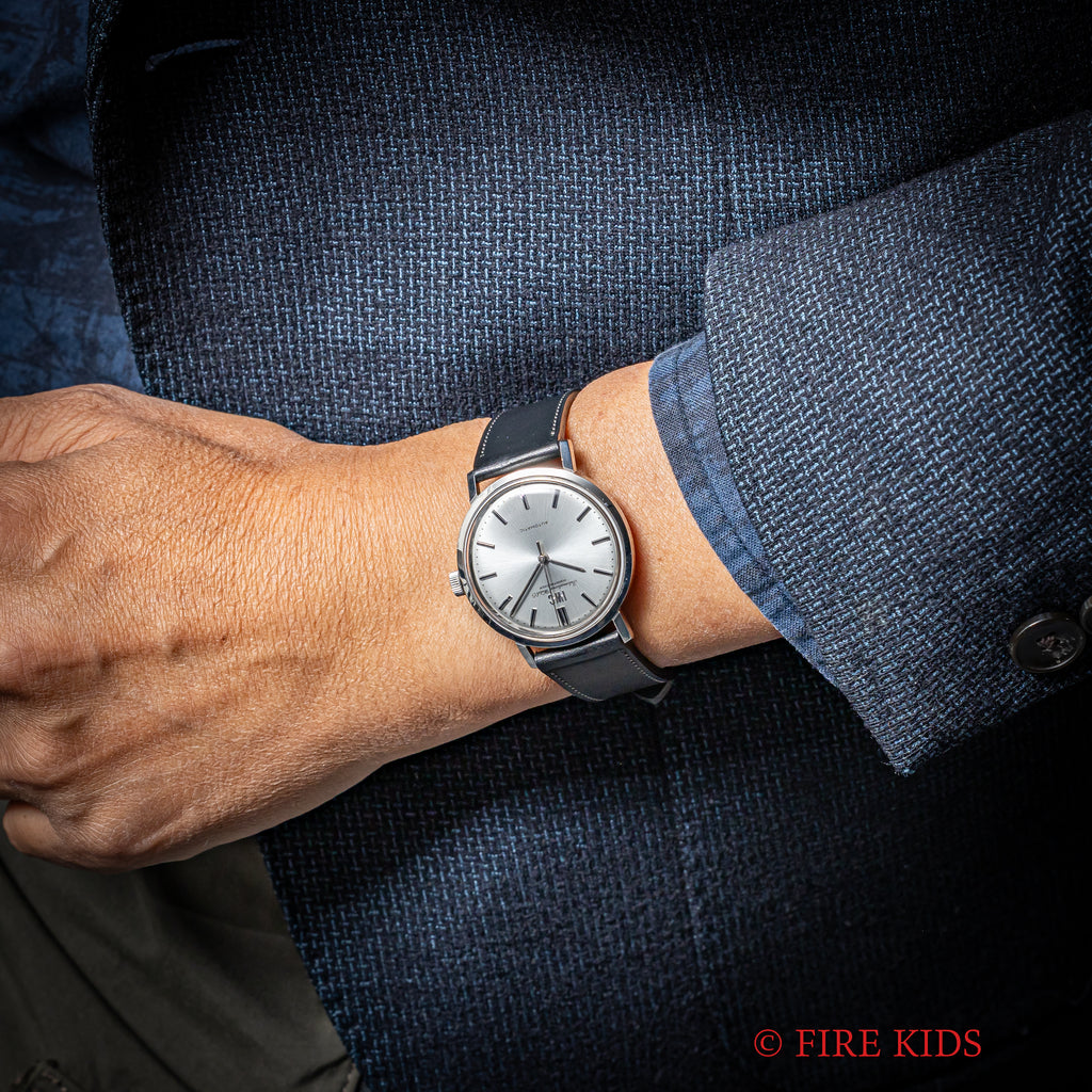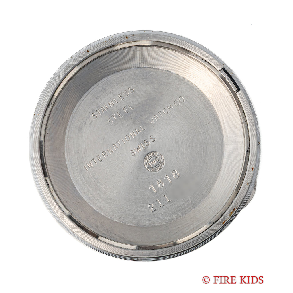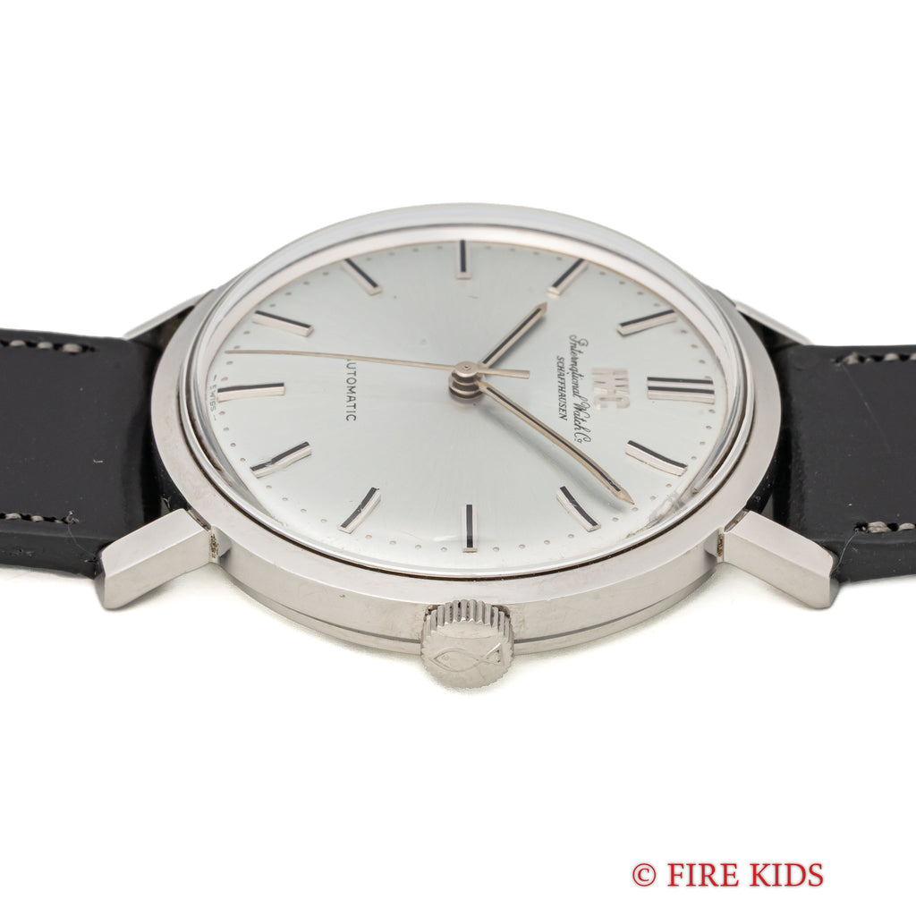 IWC ラウンドケース 1975年製 Ref.1818 ペラトン式自動巻き Cal.854Bです。ノンデイト自動巻きのペラトン式自動巻きCal.854Bを搭載しています。珍しいアイスブルーダイヤルです。サイズは35mmとカジュアル・ビジネスで使いやすいサイズです。 ケースは全体に小さなキズはありますが大きなダメージはありません。ファイアーキッズオリジナルのブッテーロカーフレザーを合わせています。