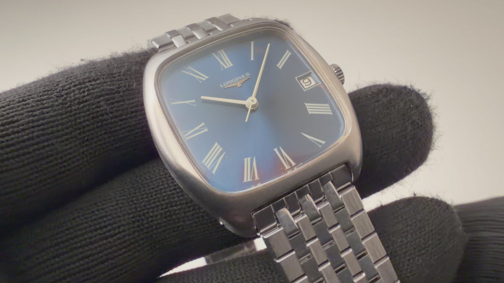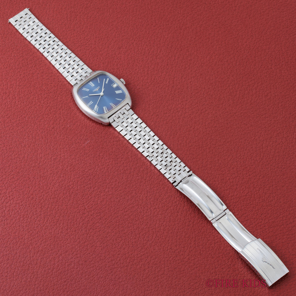 ロンジン トノーケース ブルーローマンダイヤル 純正ブレス付き ハイビート手巻き Cal.6952 ゼロハック機能です。トノー型ケースに鮮やかなブルーダイヤルが目を惹く一本。Cal.6952を搭載し、ゼロハック機能というリューズ二段引きすると12時位置で秒針が停止する面白い機能を持っています。純正ブレス付きです。裏シールも若干残っています。