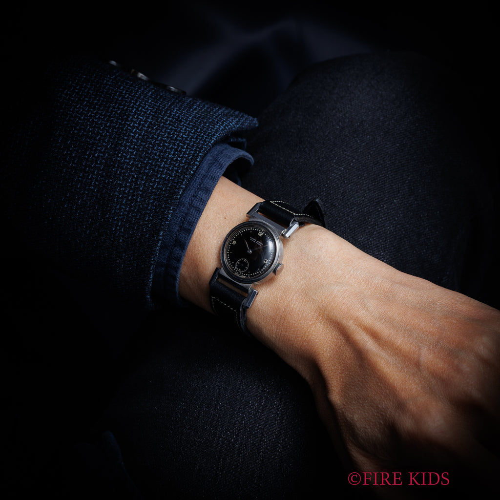 ユリスナルダン 1930年代製 フレキシブルラグ ブラックミラーダイヤル 手巻きです。ブラックミラーダイヤルにリーフハンド、スモールセコンド、可動式のラグとヴィンテージの魅力が詰まった一本です。小振りですがラグが長いので存在感がしっかりあります。ダイヤル、ケースともにこの年代としては綺麗なコンディションです。パリス管式で、社外のオープンエンドの革ベルトを合わせています。