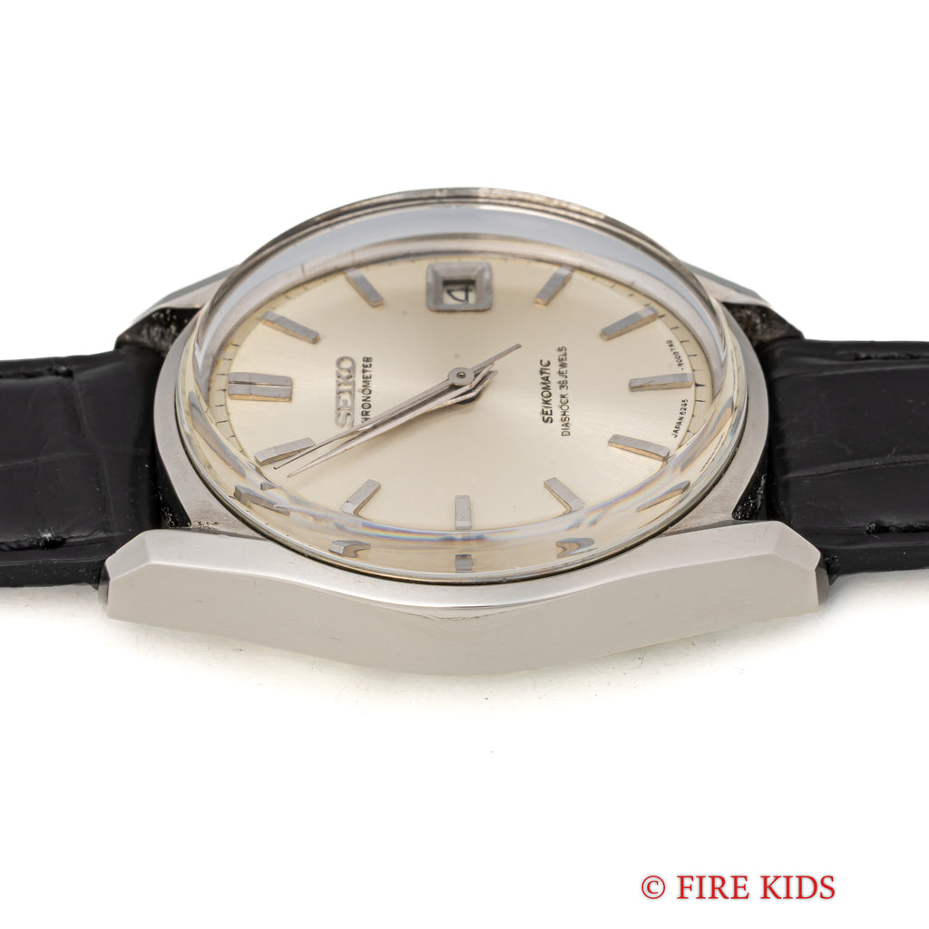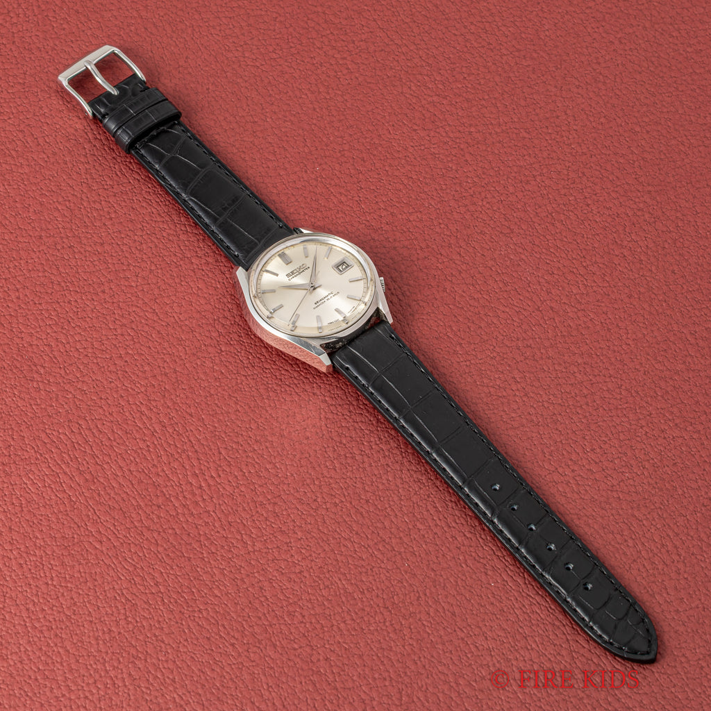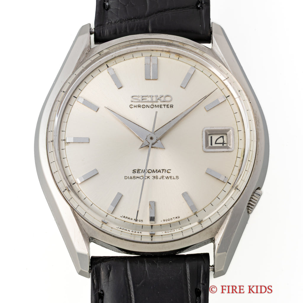 セイコーマチック クロノメーター 1966年製 Ref.6245-9000 獅子メダリオンの入荷になります。4時位置にリューズを配置したスッキリとしたデザインが印象的です。文字盤は年代なりの経年は見受けられます。ケースは小傷はございますが大きなダメージはございません。裏ブタの獅子メダリオンも健在です。ムーブメントは62グランドセイコーにも搭載されているCal.6245Aを搭載、手巻き無しで自動巻きのみですが巻き上げの効率は良いマジックレバーを採用しています。針回しの操作はスムーズです。ファイアーキッズオリジナルのクロコダイル革ベルトを合わせています。