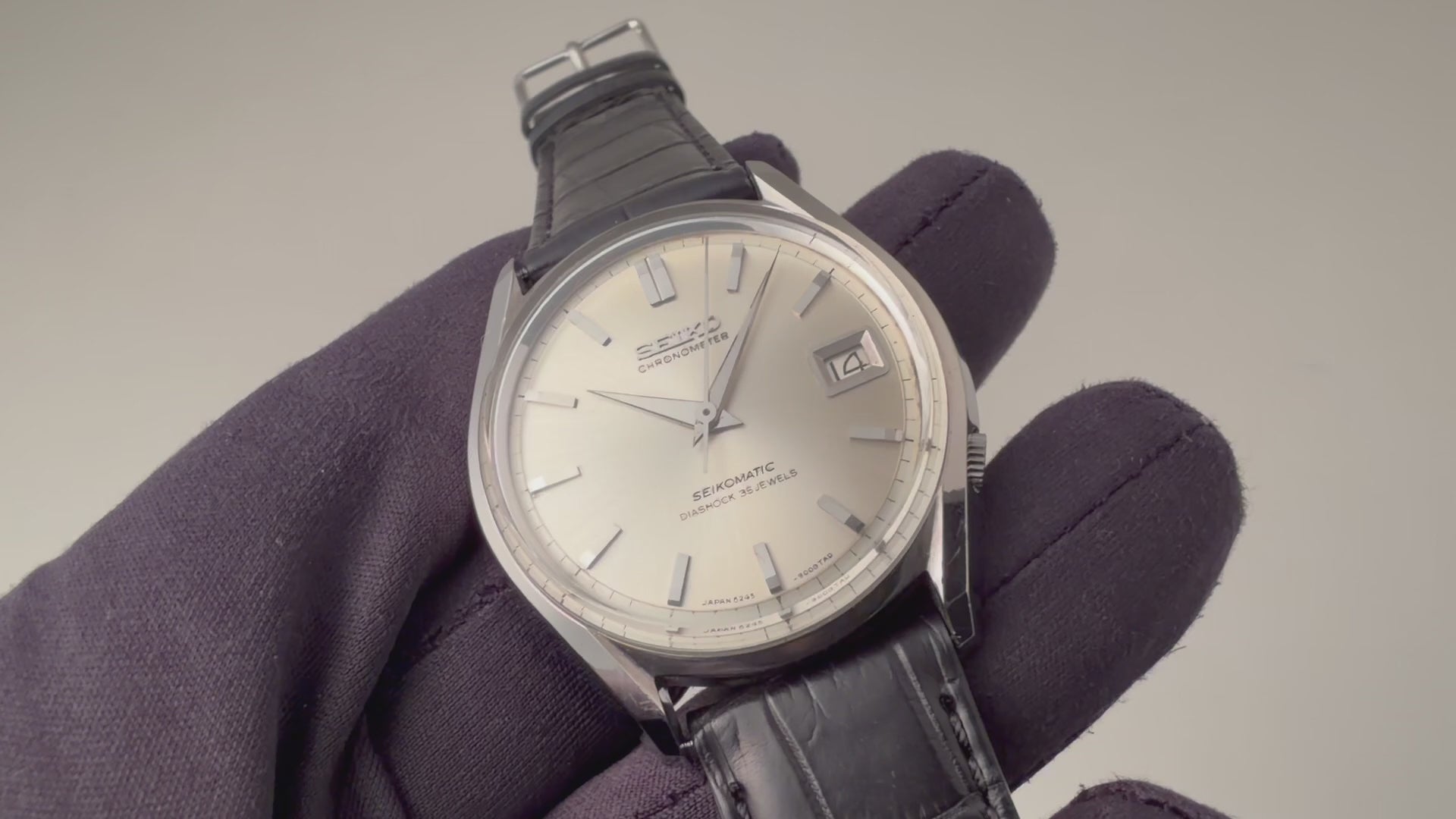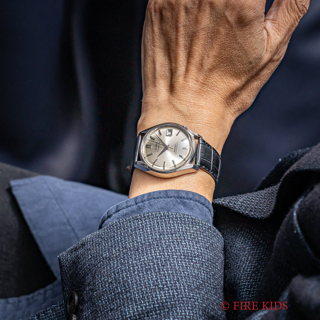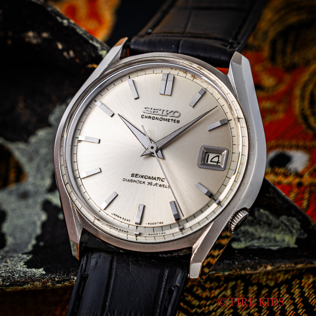 セイコーマチック クロノメーター 1966年製 Ref.6245-9000 獅子メダリオンの入荷になります。4時位置にリューズを配置したスッキリとしたデザインが印象的です。文字盤は年代なりの経年は見受けられます。ケースは小傷はございますが大きなダメージはございません。裏ブタの獅子メダリオンも健在です。ムーブメントは62グランドセイコーにも搭載されているCal.6245Aを搭載、手巻き無しで自動巻きのみですが巻き上げの効率は良いマジックレバーを採用しています。針回しの操作はスムーズです。ファイアーキッズオリジナルのクロコダイル革ベルトを合わせています。