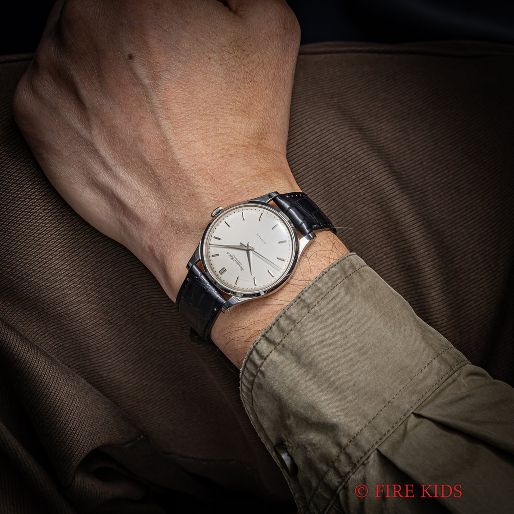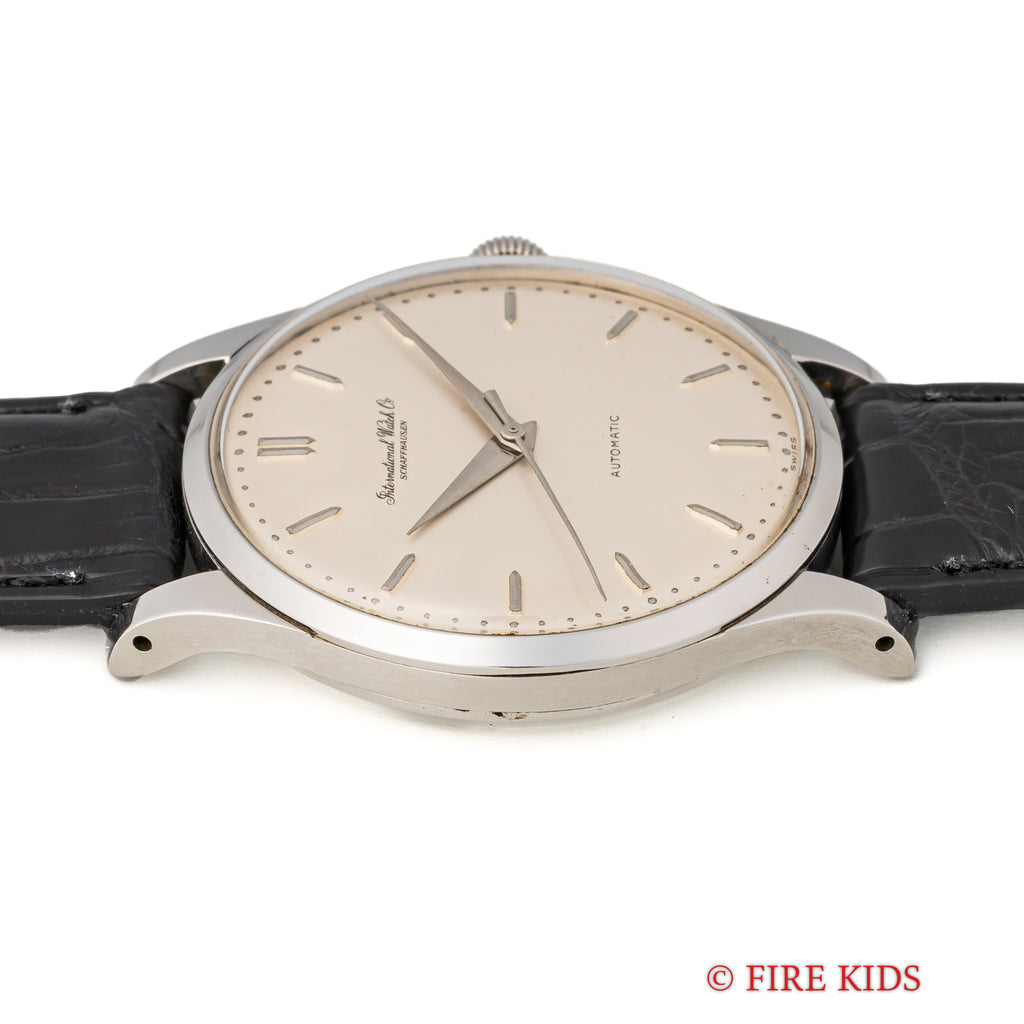 インターナショナルウォッチカンパニー ラウンドケース 1960年製 ペラトン式自動巻き Cal.853 ノンデイトの入荷になります。奇をてらわないシンプルなデザインはインターナショナルの代名詞でもあり、真摯な時計作りはビギナーからマニアまで幅広い人気があります。アイボリーの文字盤も程よい焼け具合で雰囲気も良いです。ムーブメントはペラトン式自動巻きのCal.853を搭載。ケースは小傷はございますが大きなダメージはございません。手巻きや針回しの操作はスムースです。ベルトはファイアーキッズオリジナルのクロコダイル革ベルトが取り付けられています。