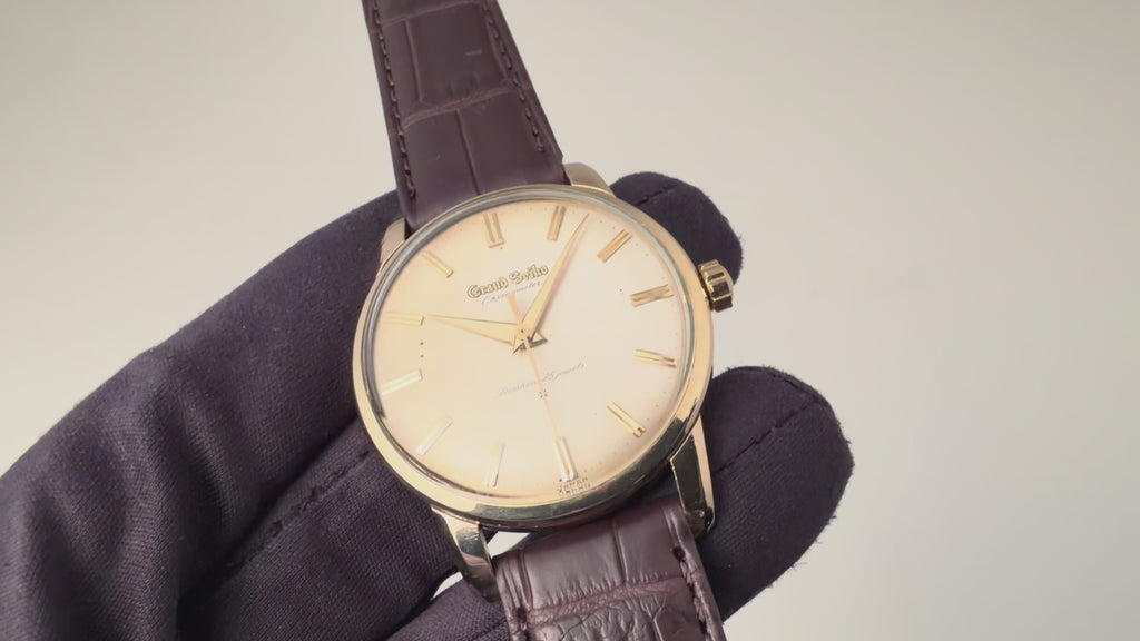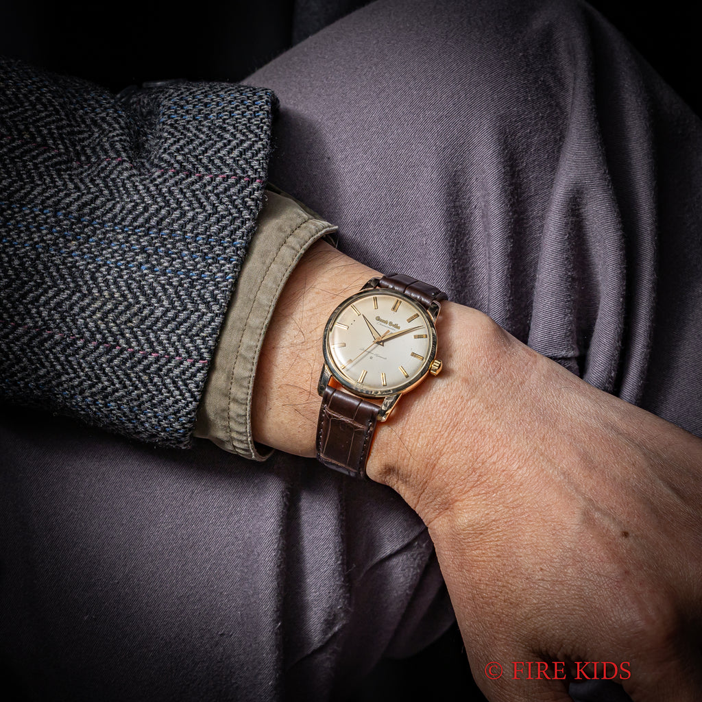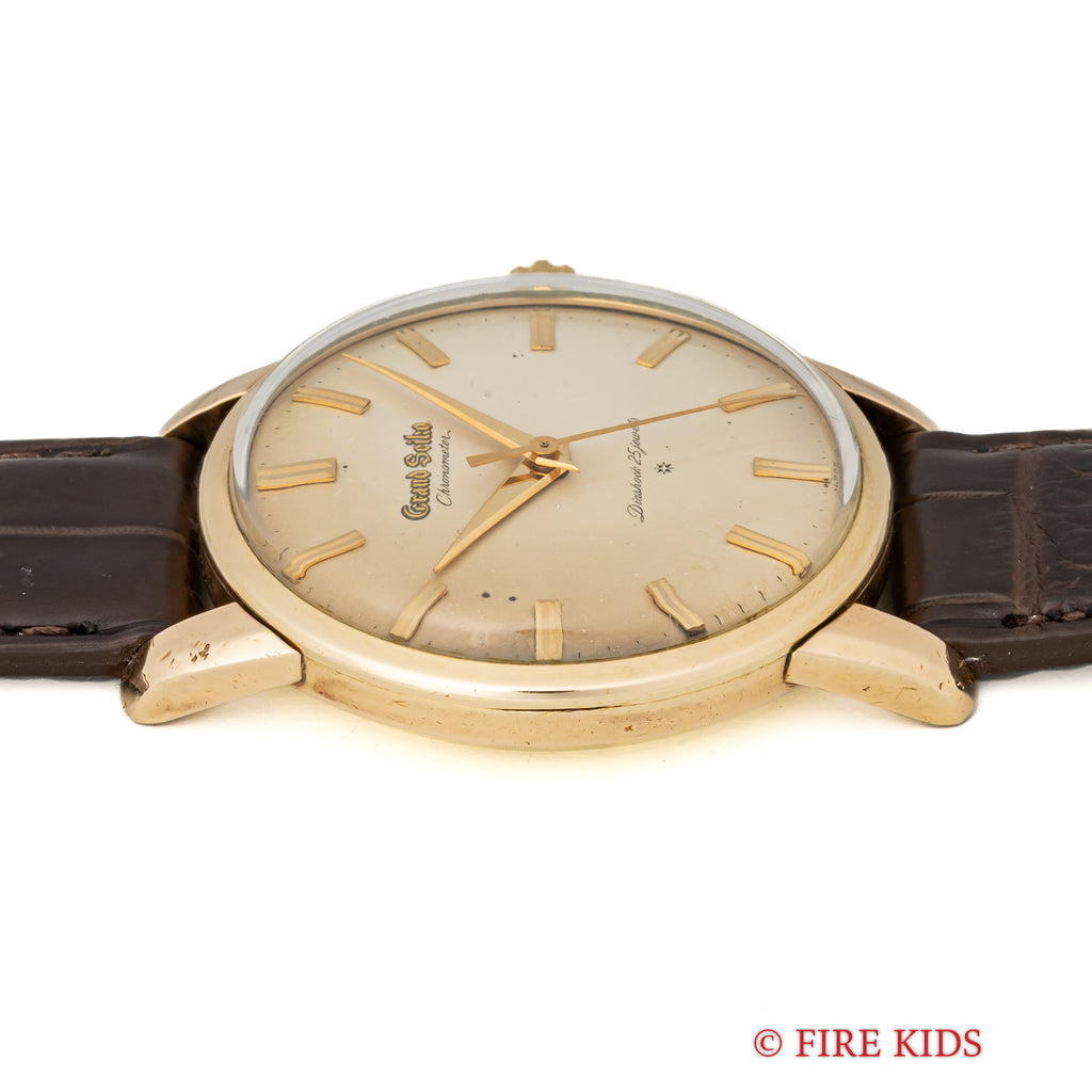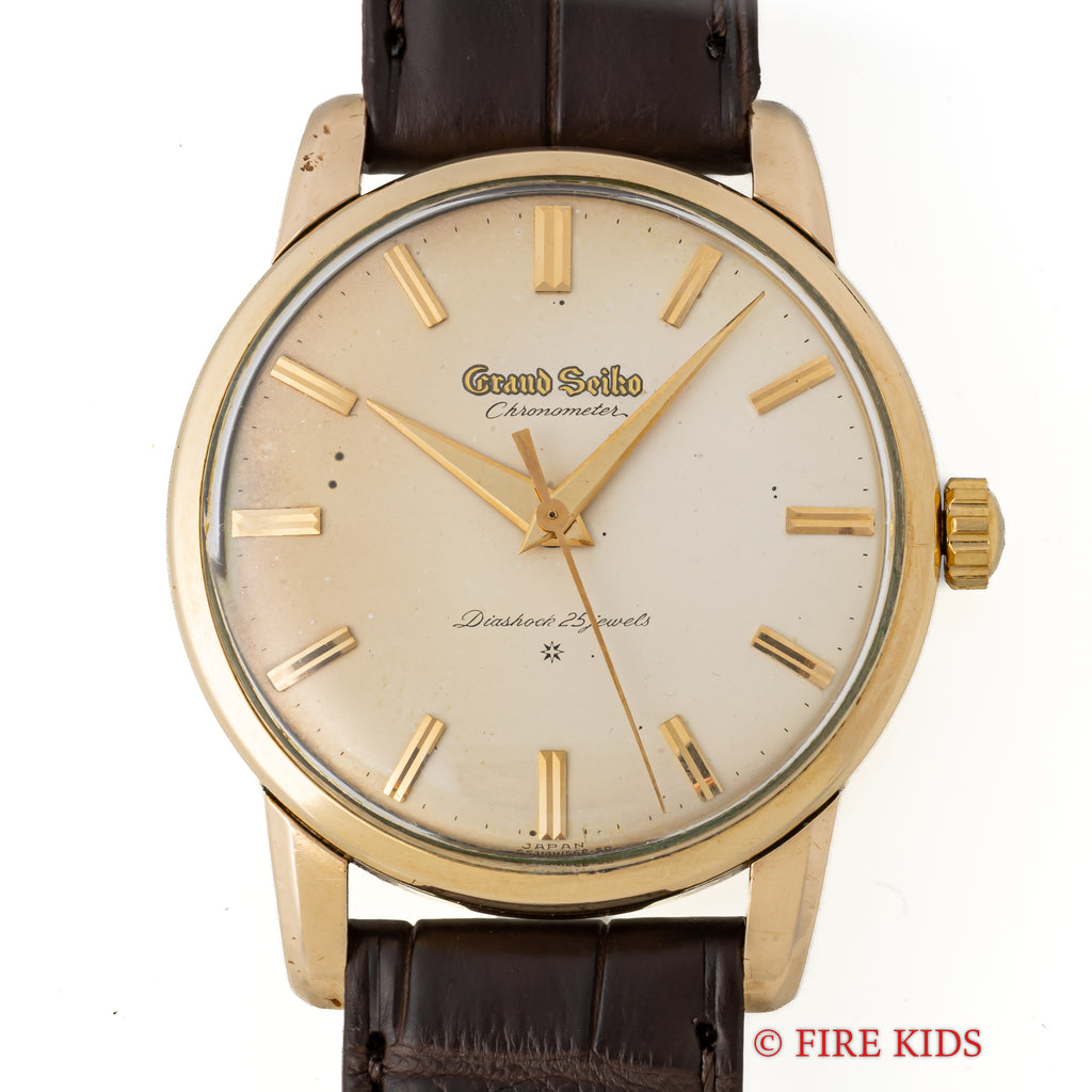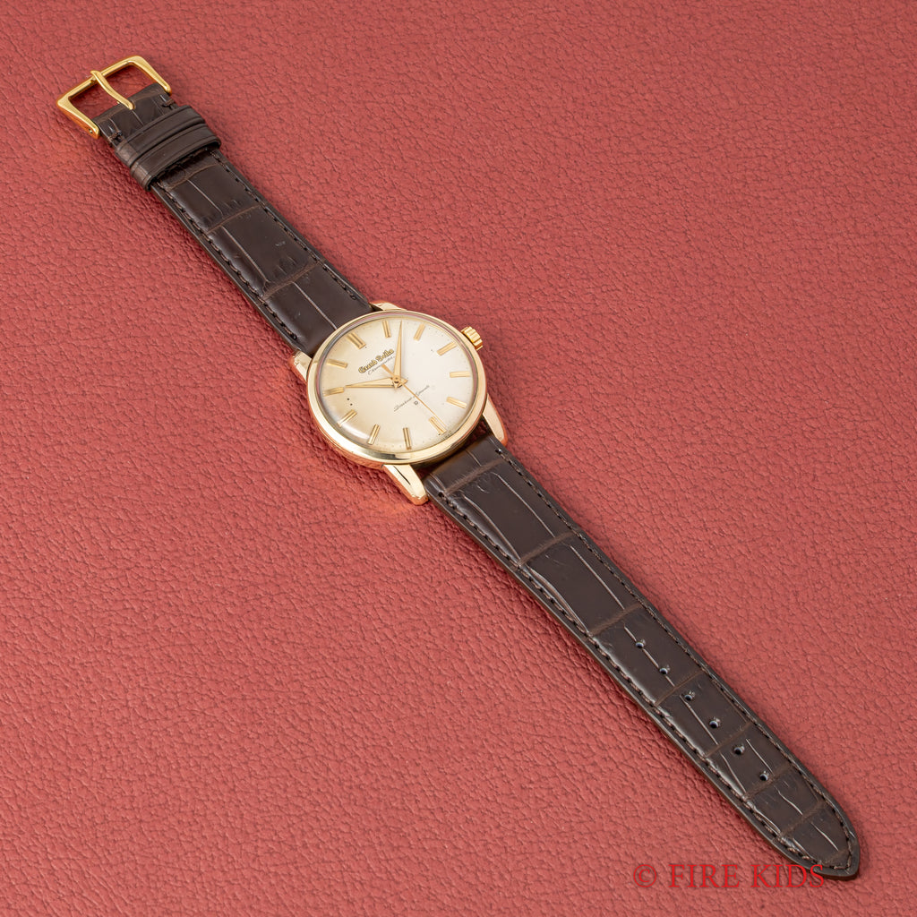 グランドセイコー ファーストモデル 1963年製 Ref.J14070 GS パティーナダイヤルの入荷になります。文字盤9時側が日焼けしてヴィンテージ感がある1本です。グランドセイコー1stモデルは、1960年から1963年の3年間だけ製造され、こちらの文字盤は、後期型で『GRAND SEIKO』の文字がアップライト仕様のものになります。ダイヤルの4時位置に経年変化が見られますが、概ね良好なコンディションです。14金80ミクロンの金張りケースは、大きなダメージもなく、ライオンメダリオンはしっかり残っています。手巻きや針回しの操作には問題ありません。ベルトはファイアーキッズオリジナル、クロコダイル革ベルトが取り付けられています。