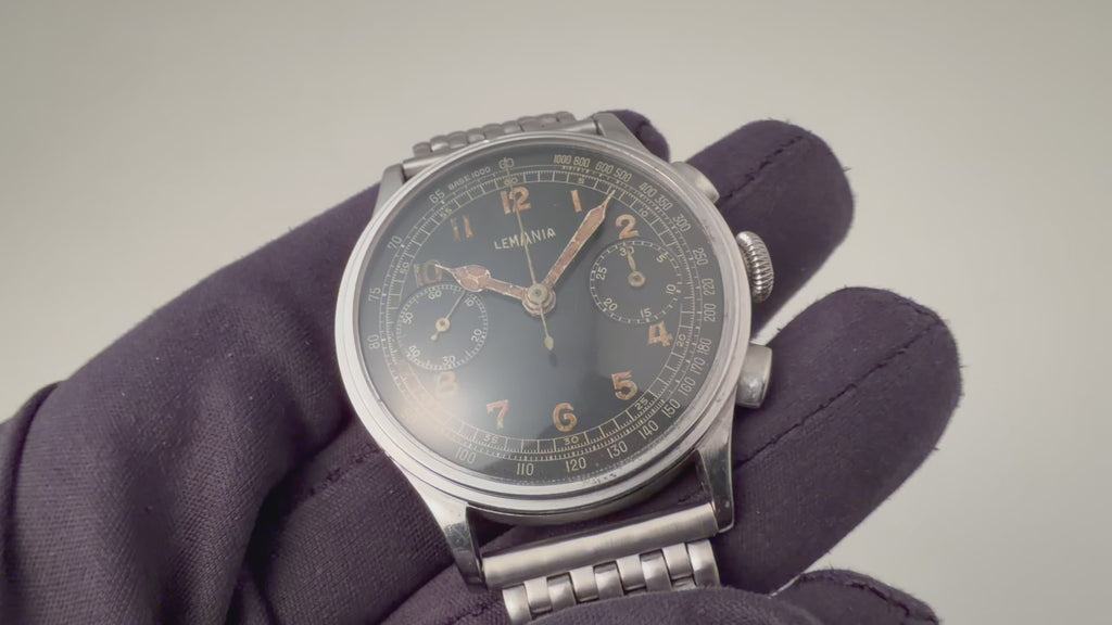 レマニア 37㎜ビッグケース 2レジスター クロノグラフ 1940年代製 手巻き Cal.15TL ステップベゼルの入荷になります。ステップベゼルにブラックアラビアダイヤル、コブラハンドと時代を感じる組み合わせです。針の夜光は入れ直しされていますがダイヤルはオリジナルで雰囲気は良いです。様々な動きを組みたレマニアの中でも大型ムーブメントの15TLを搭載し、機械に合わせましたた37mm径ケースは迫力があります。手巻きや針回し、クロノファンクションはスムースです。ベルトは社外の雰囲気の合うステンレスブレスが取り付けられています。