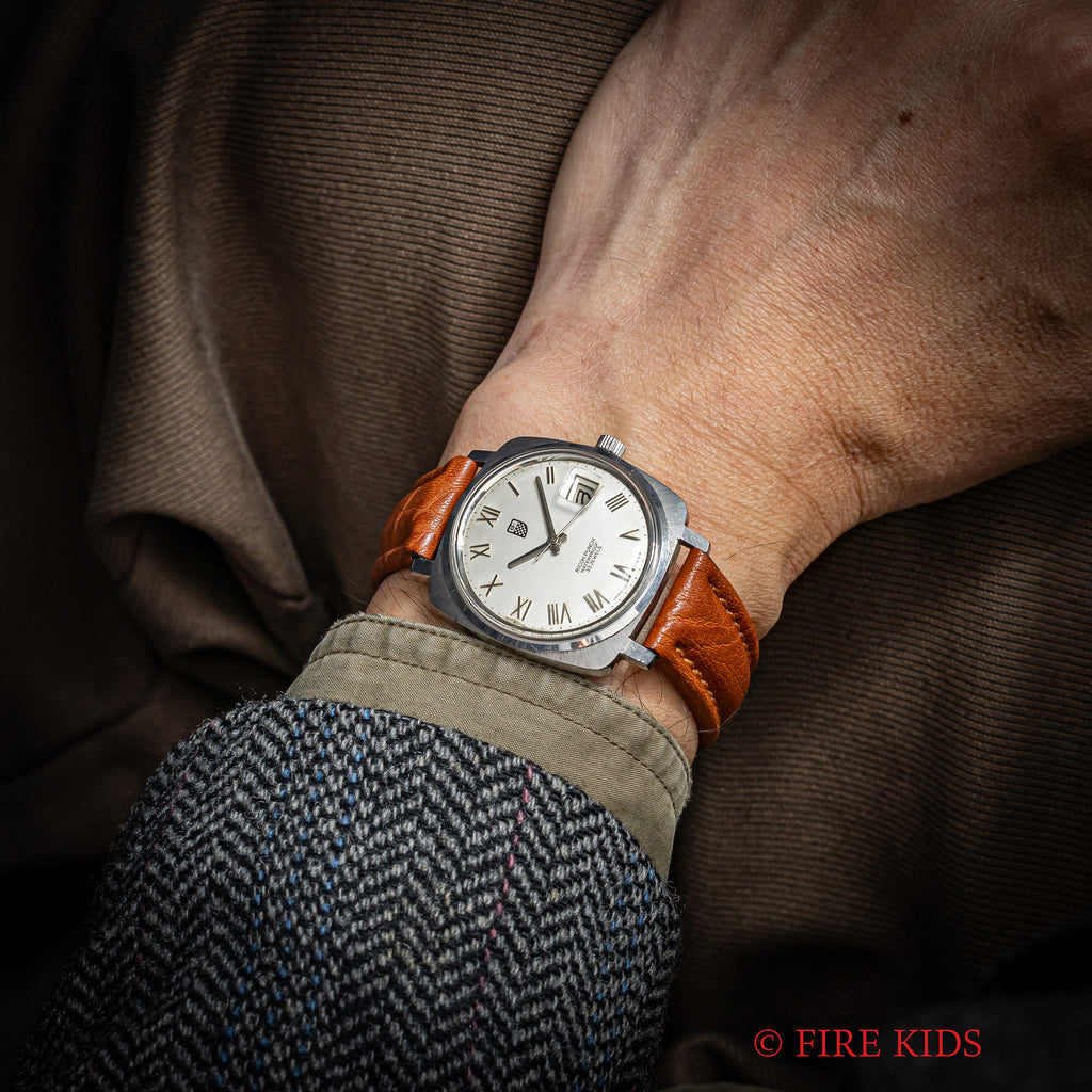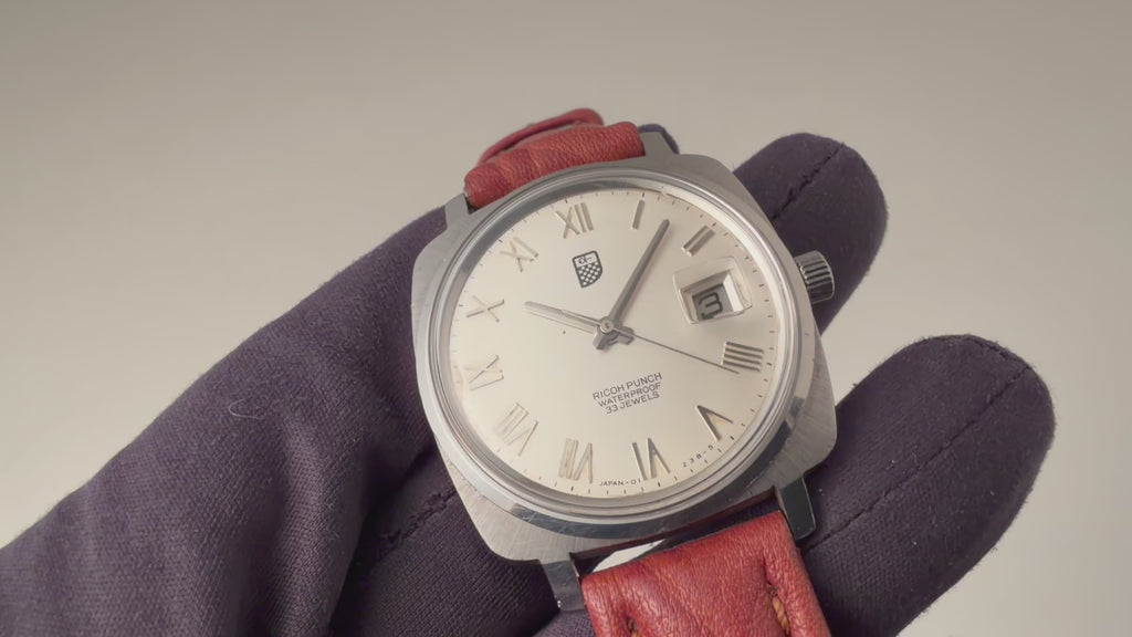 1970年代製 リコー 平凡パンチ 自動巻きモデルが入荷しました。1964年から1988年まで刊行された雑誌「平凡パンチ」とのコラボモデルです。文字盤は経年によるダメージが見られますが、12時下に平凡パンチのロゴが入り、時代を感じさせるレアな1本です。スクリューバックのケースは、製造当時のヘアライン仕上げがそのまま残り、裏ブタには平凡パンチのロゴが刻まれています。ムーブメントは33石の自動巻きムーブメントを搭載。ベルトは社外の革ベルトが取り付けられています。