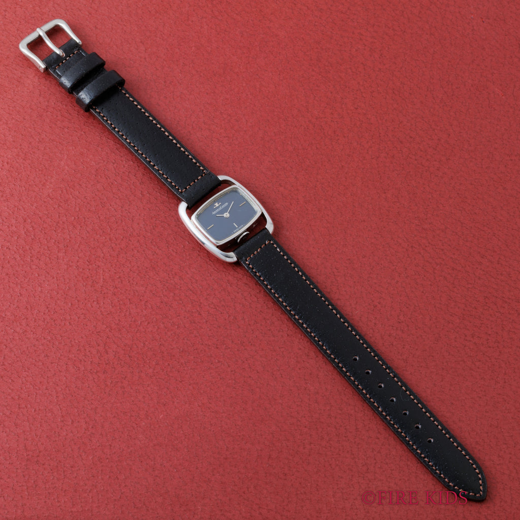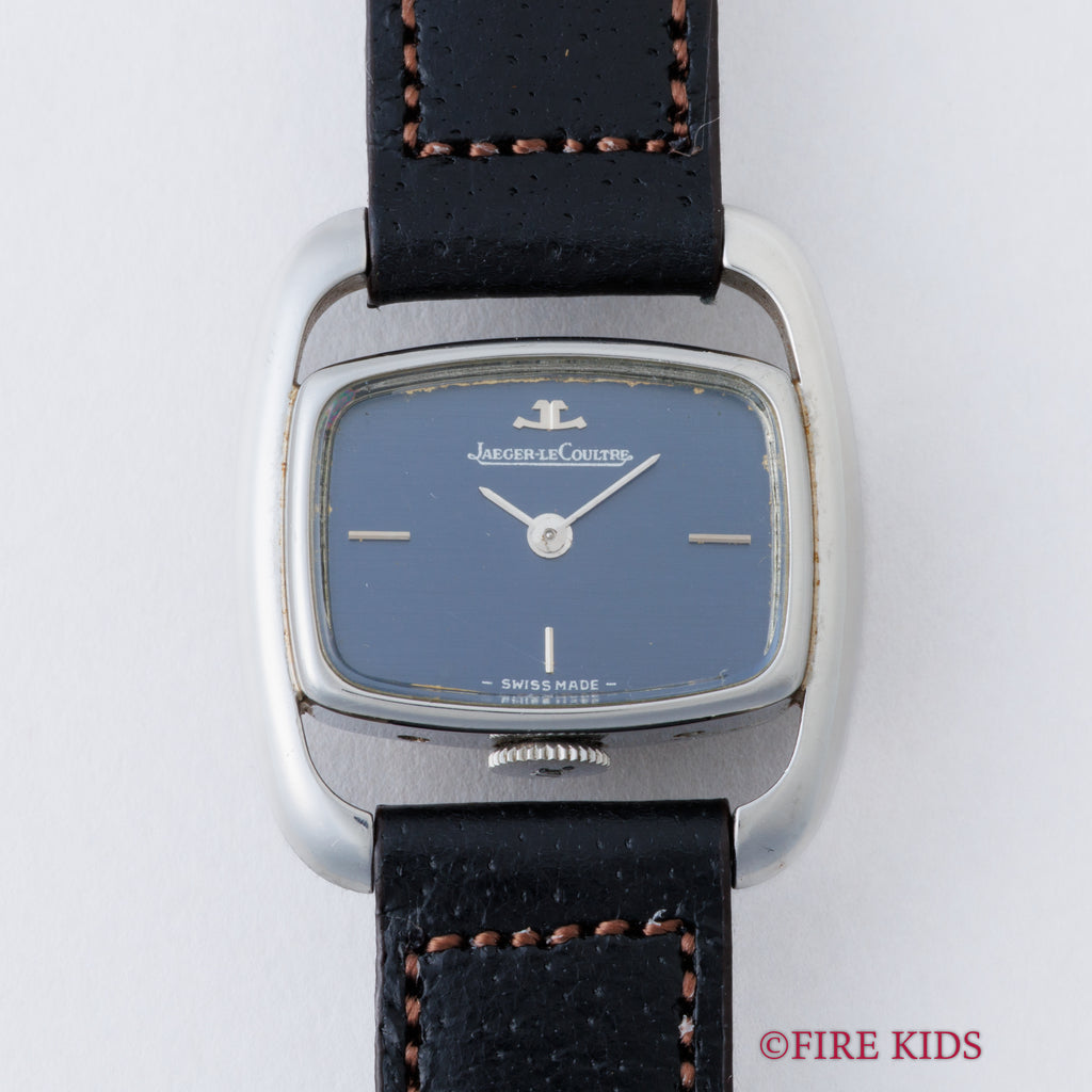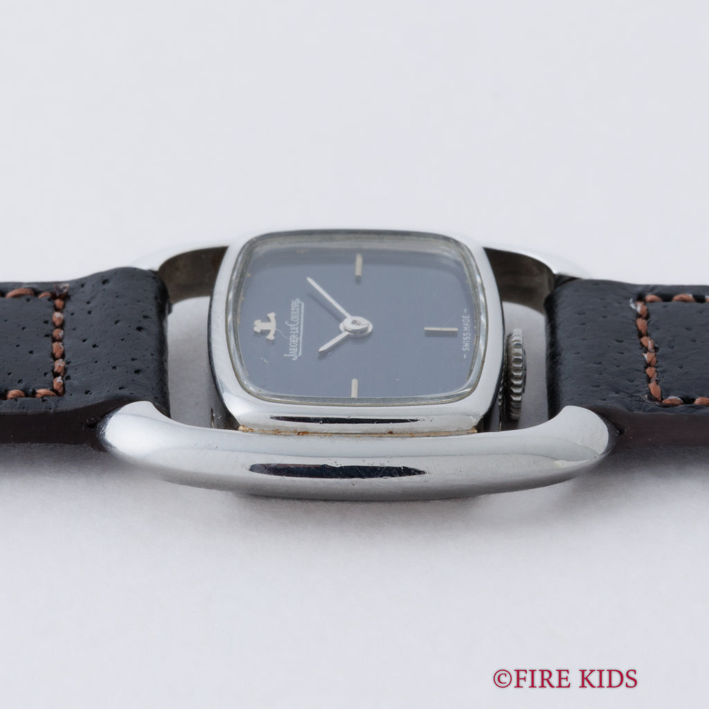 ジャガールクルト レディースウォッチ エトリエ 1980年代製 ホワイトローマンダイヤルです。エルメス(HERMES)が馬具の鐙(エトリエ)をモチーフにデザインしたと言われているモデルで独特のケースにネイビーダイヤルがお洒落です。小さい時計で6時位置リューズですので、やや手巻きがしづらい所はありますがデザイン重視といったところでしょうか。文字盤は若干経年がございますが大きなダメージはありません。ケースは良好なコンディションです。ベルトはアキュレイトフォルムのレザーベルトが取り付けられています。