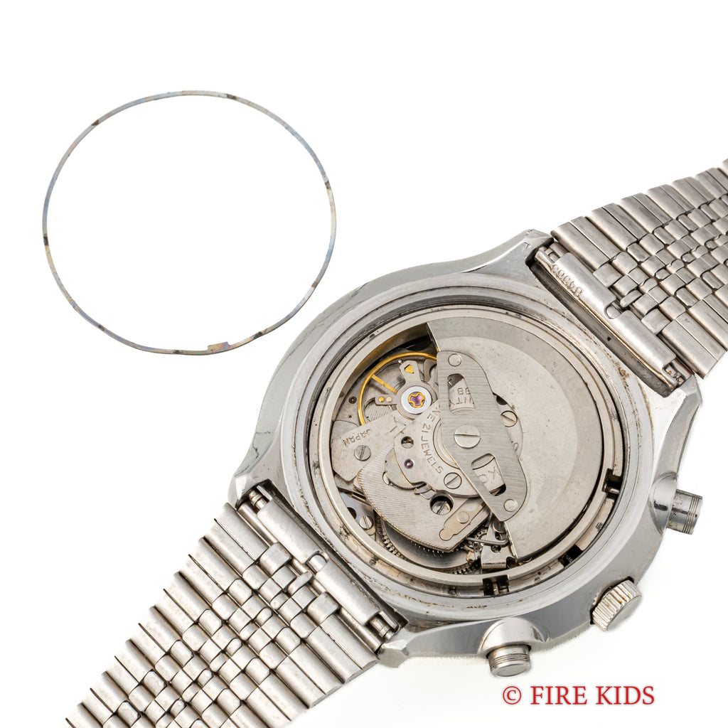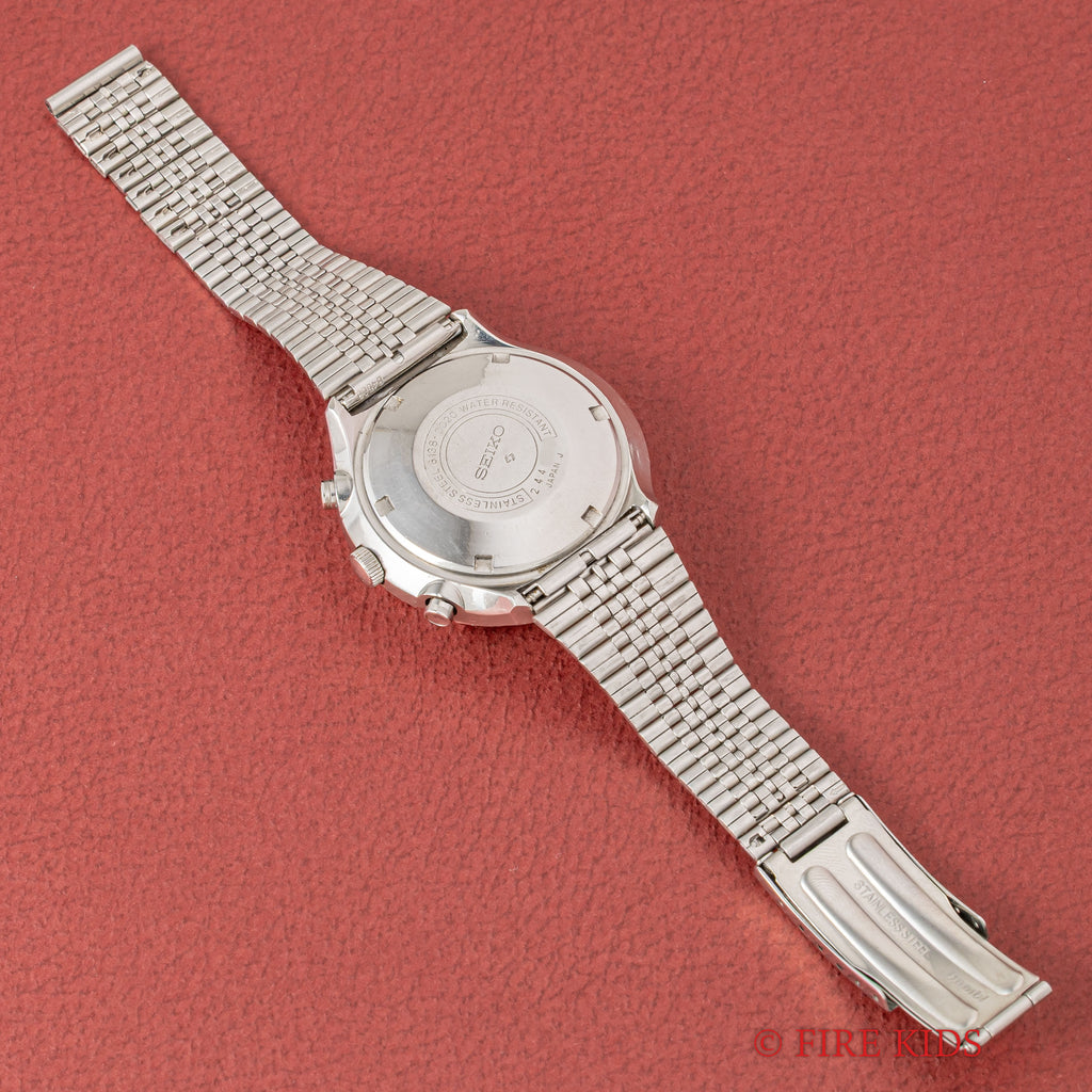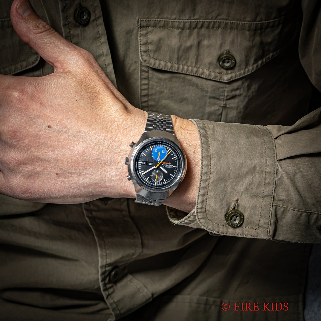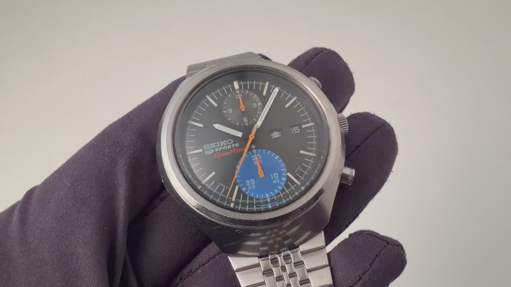 セイコー 1972年製 5スポーツ スピードタイマー Ref.6138-0020 クロノグラフ 純正ブレスの入荷になります。当時の若者向けに作られたセイコー5スポーツのクロノグラフモデルです。縦目の2レジスタークロノグラフで、文字盤全体にポツポツとした経年変化はありますが、雰囲気を損なうようなものではございません。機械は自動巻きのクロノグラフムーブメント6138Bを搭載、曜日は日英表記のデイデイトで、早送り機能付きです。オメガのフライトマスターを彷彿とさせるケースには小傷がありますが、磨きの少ない状態です。社外のブレス付きです。