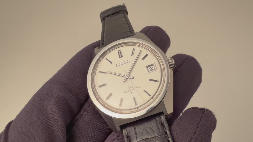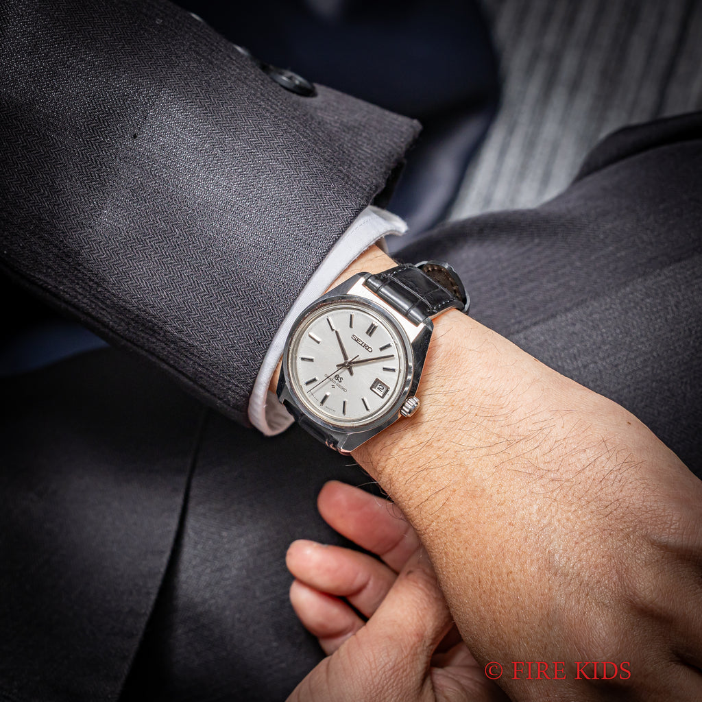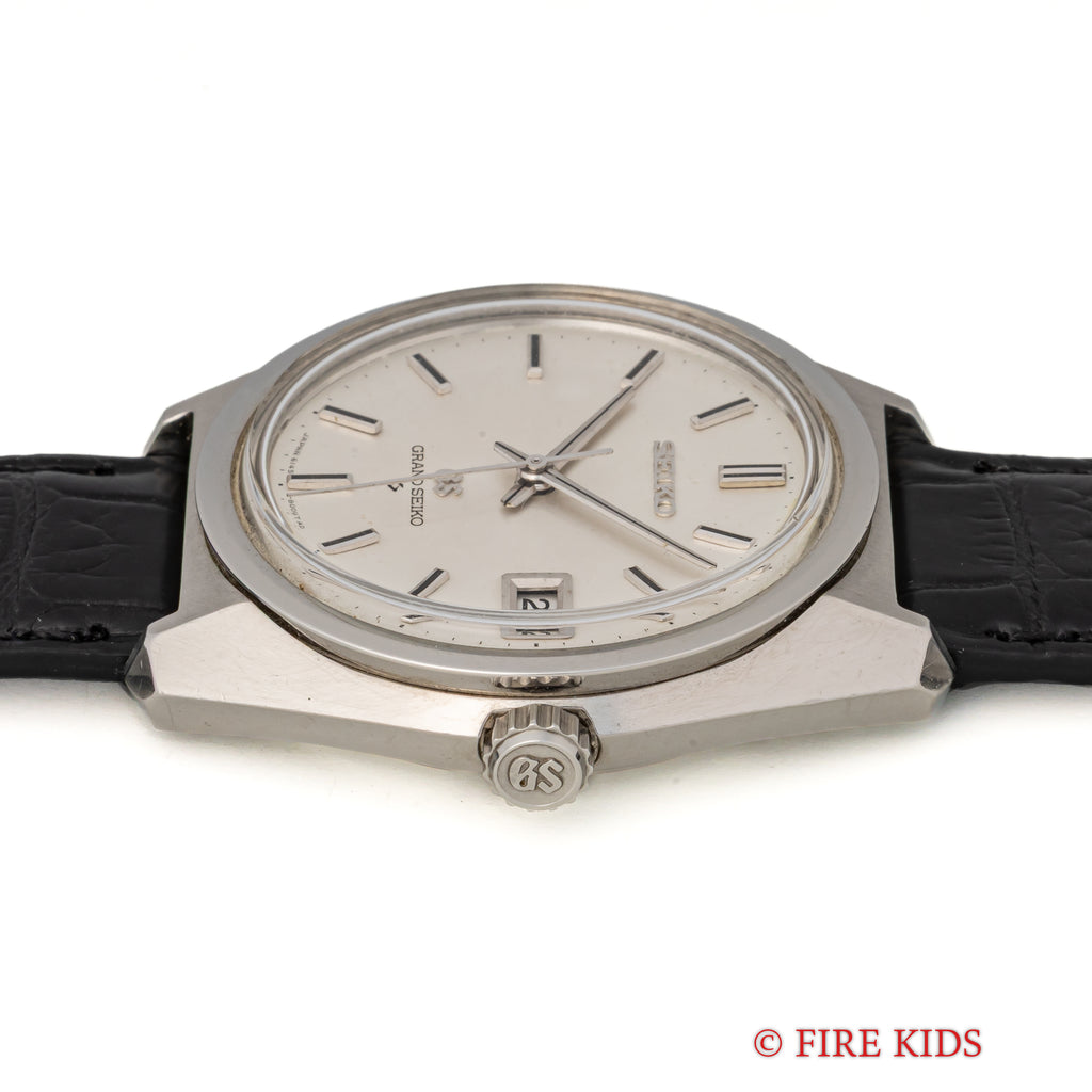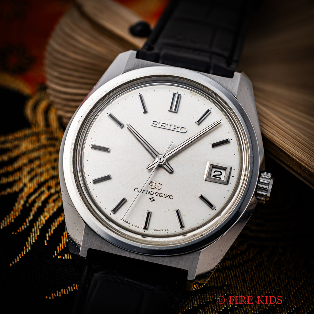 グランドセイコー 61GS最初期モデル 1967年製 10振動自動巻き 36000 Ref.6145-8000の入荷になります。グランドセイコー初の10振動自動巻モデルとして販売された61GSの最初期型で「AUTOMATIC」「36000」の表記が無くGSのマークの下に「GRAND SEIKO」の表記が特徴です。ローターにも「GRAND SEIKO」の刻印があります。文字盤はシミ等無く綺麗です。ケースは小傷が見られますが大きなダメージはありません。手巻きや針回しの操作はスムースです。ベルトはファイアーキッズオリジナルのクロコダイル革ベルトが取り付けられています。