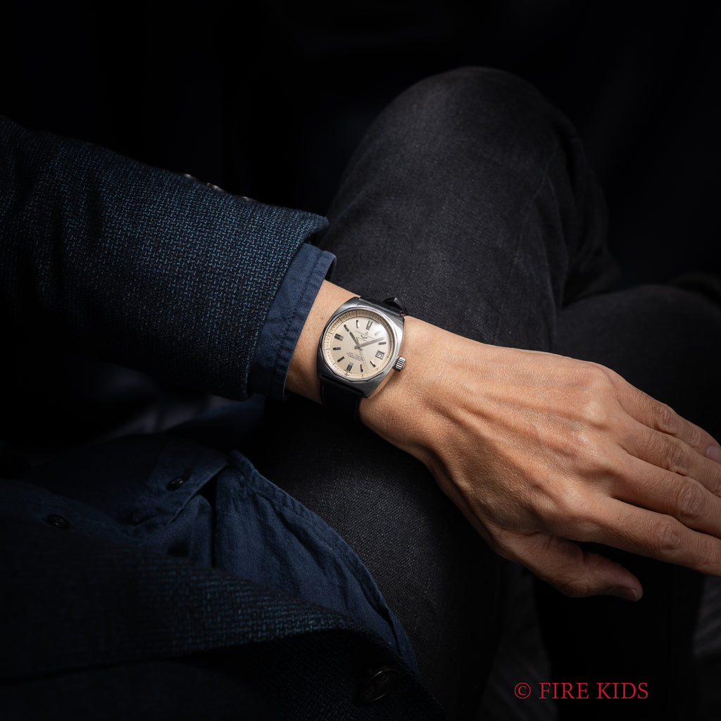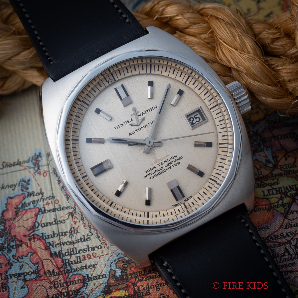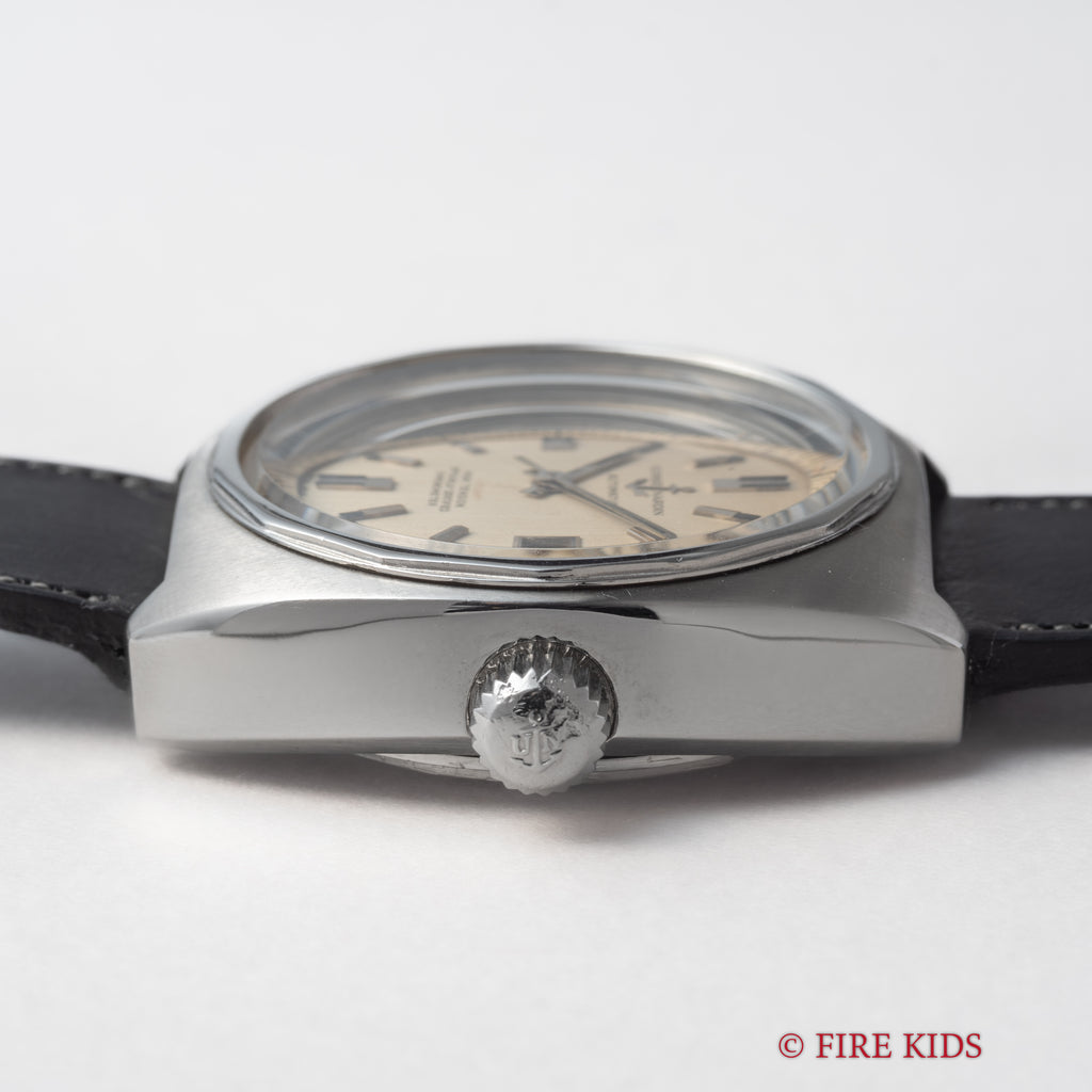 ユリスナルダン クロノメーター ハイテンション 1960年代製 自動巻 純正尾錠付の入荷になります。ユリスナルダンはマリンクロノメーターが有名なスイスの名門です。ヘアライン仕上げのシルバーダイヤルは、シンプルで飽きの来ないデザインです。スーパーコンプレッサーケースを彷彿させる重厚なケースは、多角形のベゼルが目を引きます。ケース全体に若干の仕上げは感じますが、雰囲気を損なうようなものではありません。ムーブメントは自動巻きクロノメーターを搭載、手巻きや針回しの操作はスムーズです。ベルトはファイアーキッズオリジナル、イタリアンレザーのブッテーロ(裏面ラバー)に純正尾錠が取り付けられています。