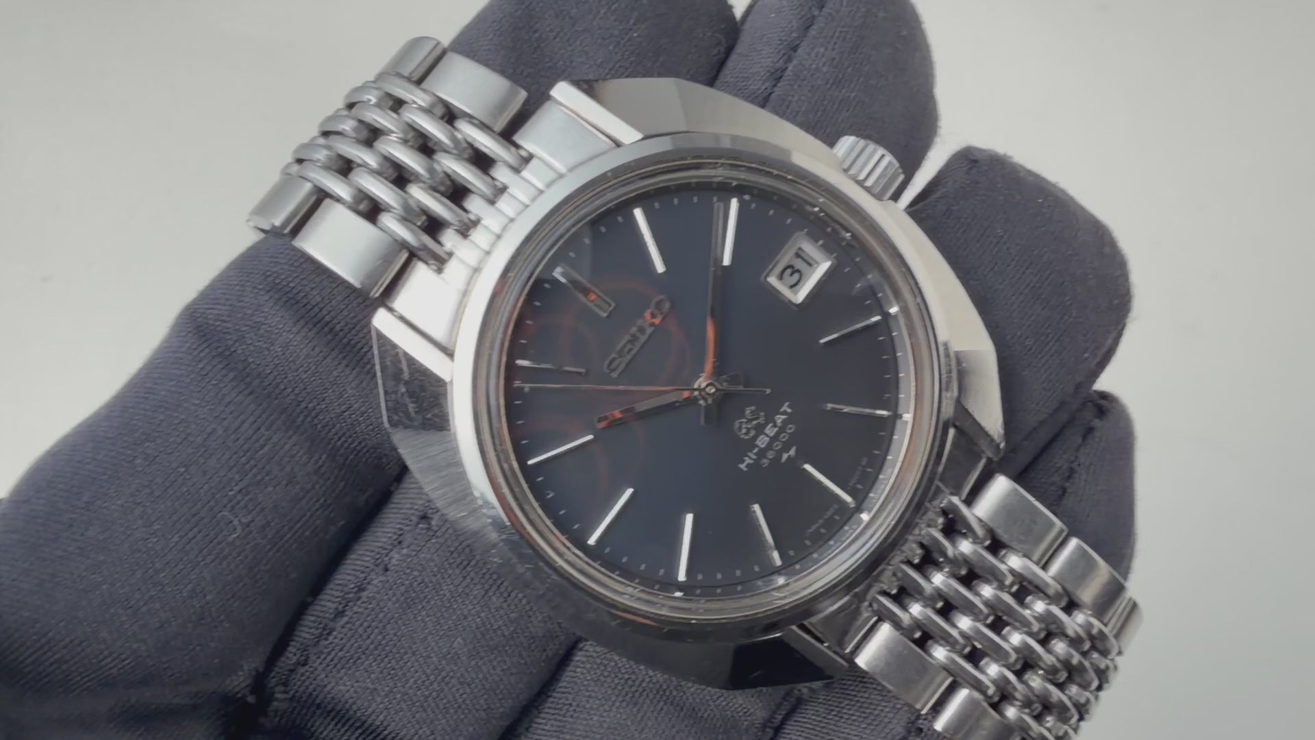 グランドセイコー オクタゴンケース 1969年製 10振動手巻 Ref.4522-7000 45GS セイコーブレスの入荷になります。グランドセイコーの中でも珍しいオクタゴンケースを採用しており、それまで海外の高級時計を意識したデザインから、セイコー独自のデザインへと移り変わっていった時代の一本です。当時の“スイスに負けない技術力”という自信が、デザインにも表情にも現れているように感じます。文字盤は深いネイビーの絶妙なカラーで、角度や光の当たり方によってさまざまな表情を見せてくれます。ムーブメントは手巻き36000振動の4522Aを搭載。カレンダーの早送り機能付きで、実用性も高いモデルです。ケースには小傷はありますが、大きなダメージはなく、裏蓋のメダリオンもきれいに残っています。手巻きや針回しの操作感もスムーズで、しっかり整備された印象です。ベルトはセイコーのステンレスブレスが取り付けられています。