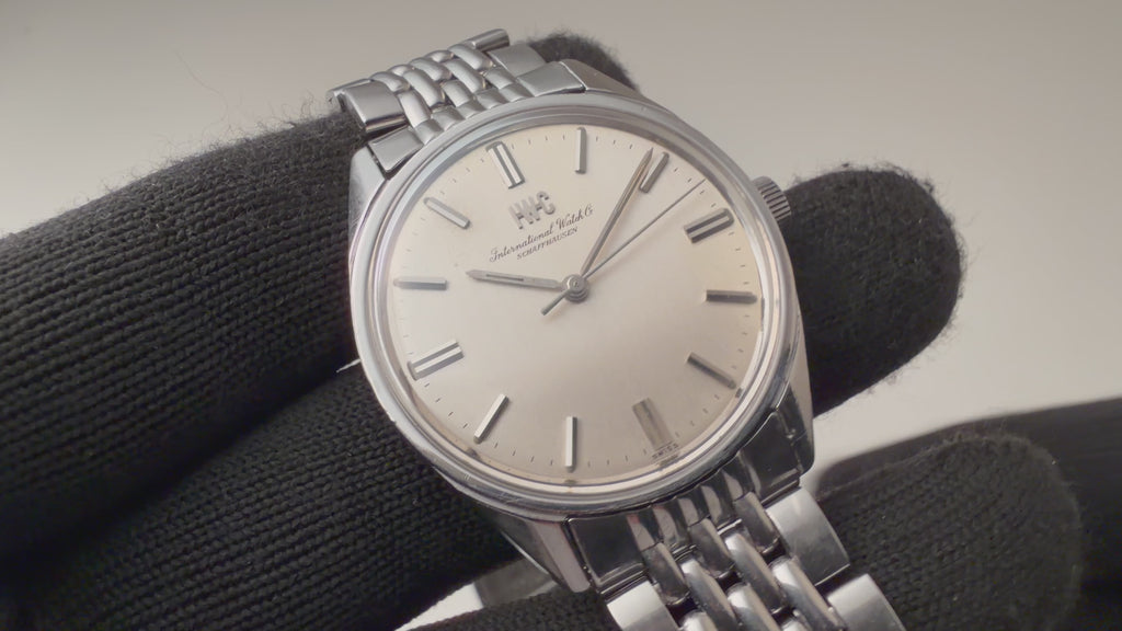 IWC ラウンド 1970年製(昭和45年製) Cal.89 手巻き オールドインター R810 純正メッシュブレス付きの入荷になります。搭載キャリバーはマークⅪ等の採用でも有名な手巻の名機Cal.89。ケースはシンプルなラウンド型で、ラグは70年代のカーデザインを彷彿とさせる直線デザインです。サイズは35mmとカジュアル・ビジネスで使いやすいサイズ。ケースは小傷が見られますが大きなダメージはありません。ベルトは純正ゲイフレアー社製のブレスが付いています。