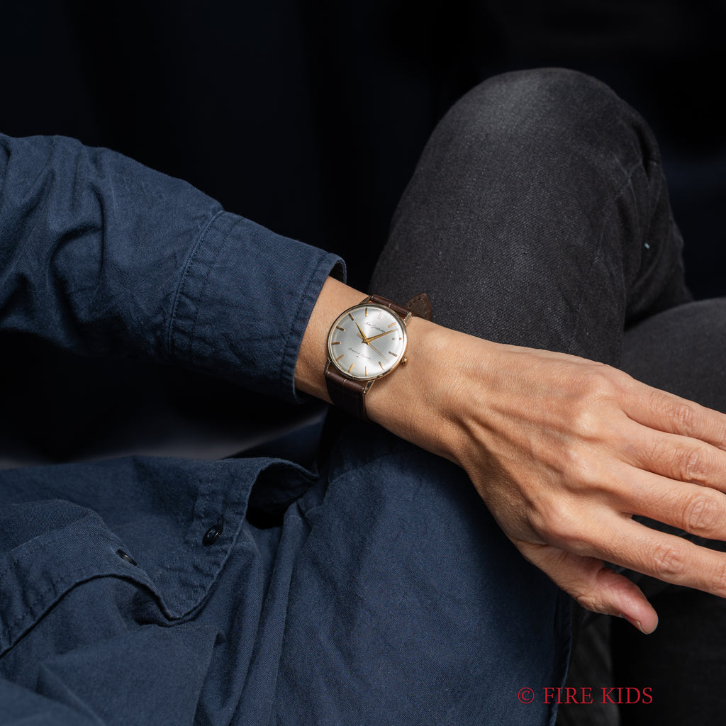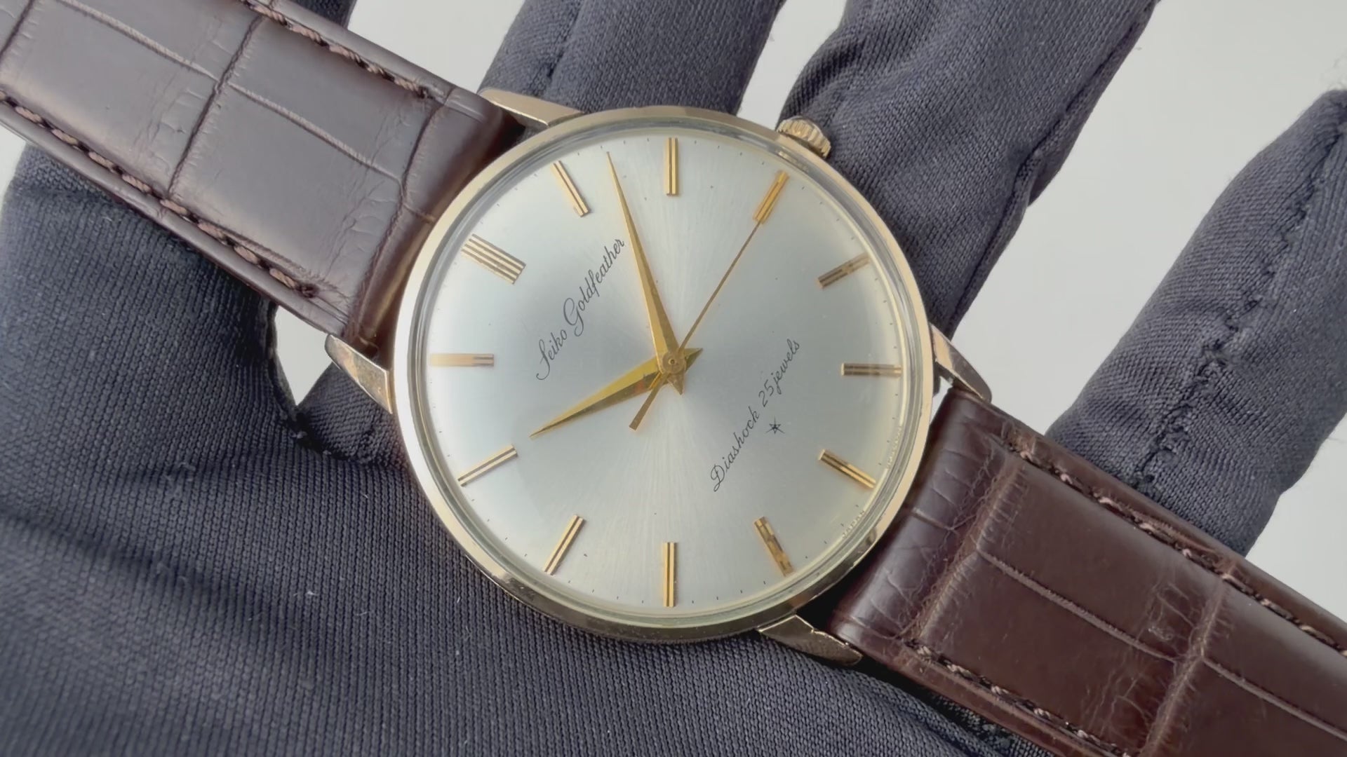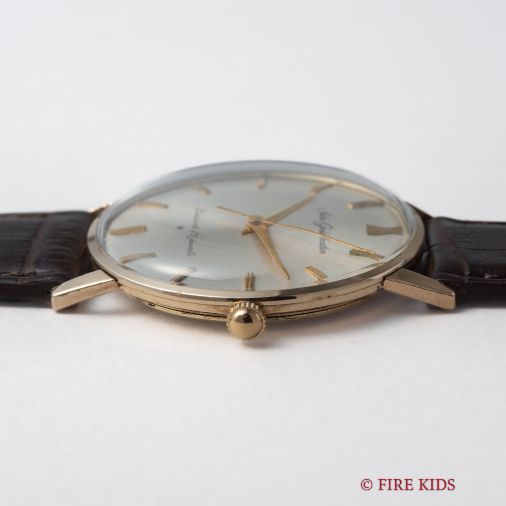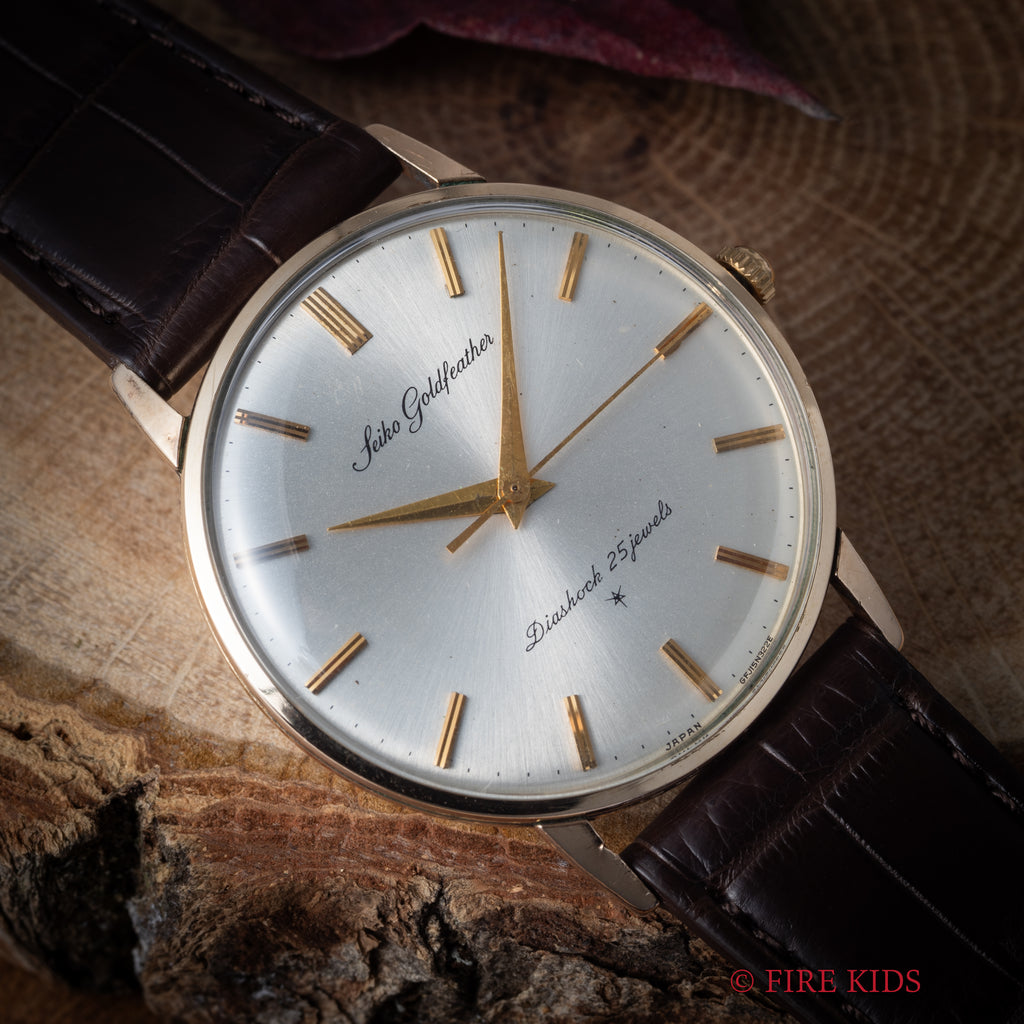 セイコー 1964年製 ゴールドフェザー 薄型手巻き Ref.15002 14金張りケースの入荷になります。2024年クレドールがら復刻され話題になったゴールドフェザーです。1960年に発表され、センターセコンド(中三針)としては当時の世界最薄のモデルです。ノンデイトのシンプルなデザインに、薄型の金張りケースはエレガント印象です。シルバーの文字盤は、経年がありますが概ね良好です。ムーブメントは手巻きの機械が搭載されています。手巻きや針回しの操作はスムースです。ベルトはファイアーキッズオリジナルのクロコダイル革ベルトが取り付けられています。