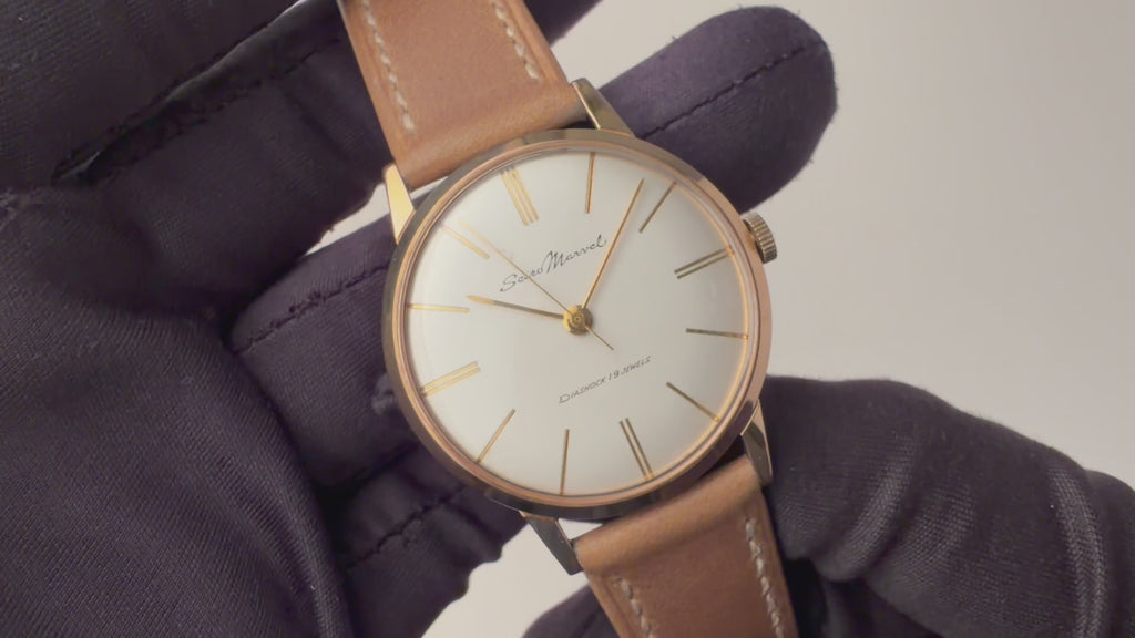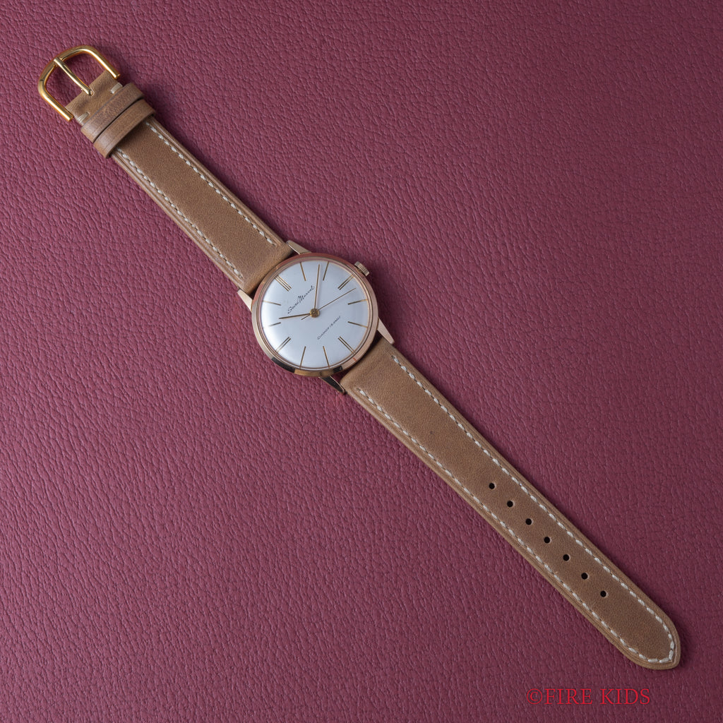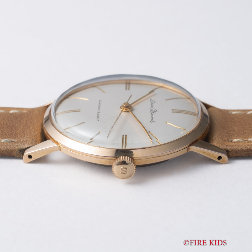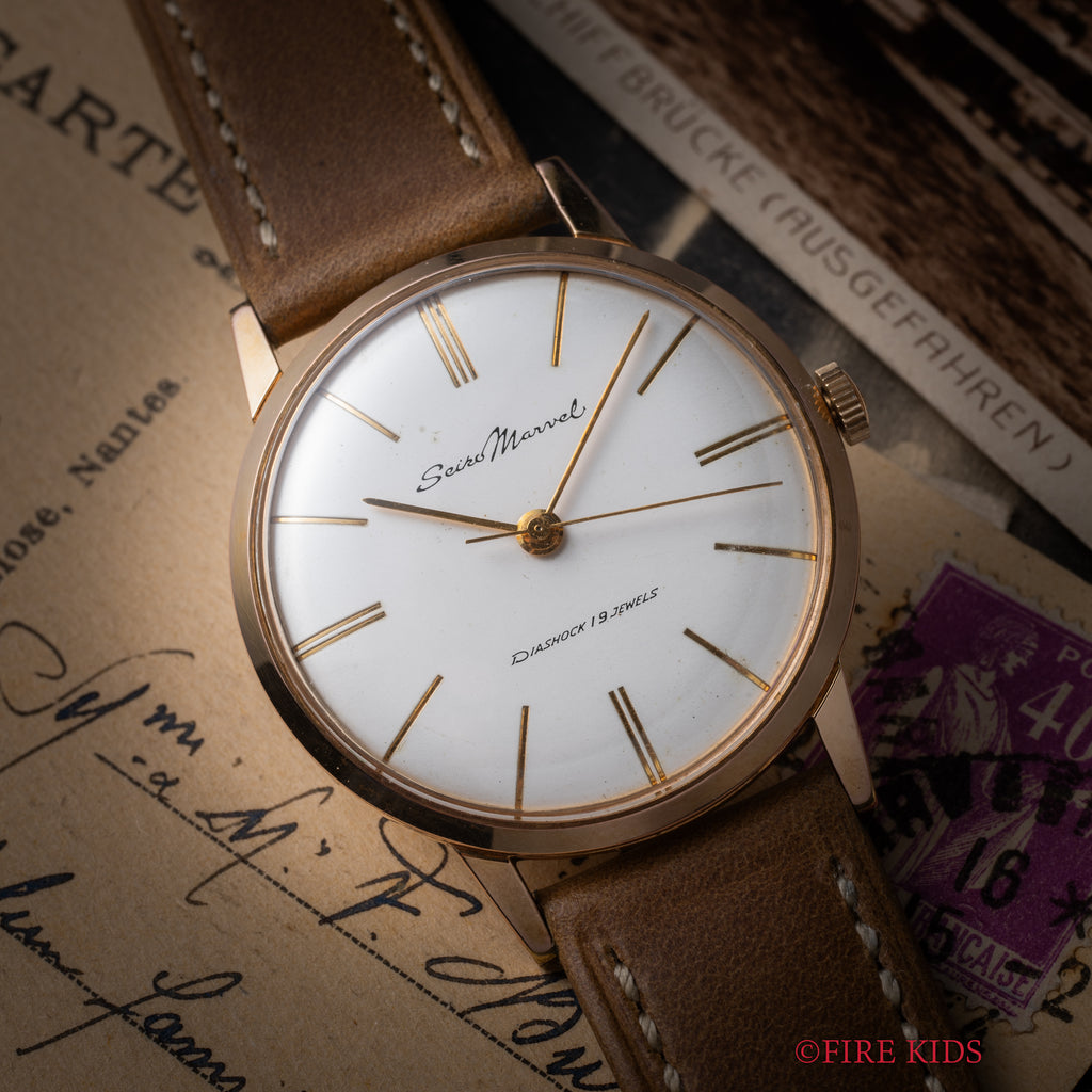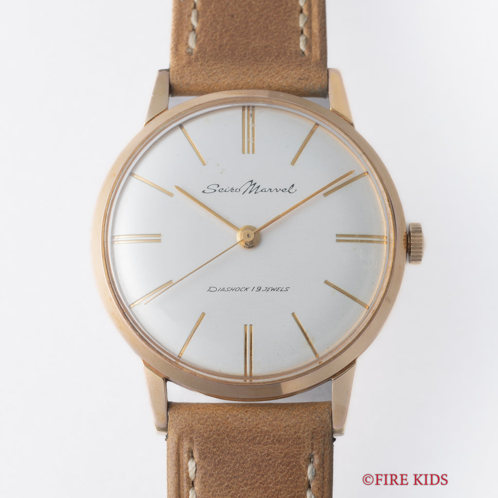 セイコー マーベル 19石 1959年製 手巻き Ref.J14044 EGPケースです。セイコーの名作マーベルです。ホワイトダイヤルは多少の経年はありますがしっかりと艶感は残っています。長めのインデックス、針と視認性に優れており実用時計としての本気度を感じます。社外の革ベルトを合わせています。EGPケースは小傷程度です。こちらは分解掃除済みです。