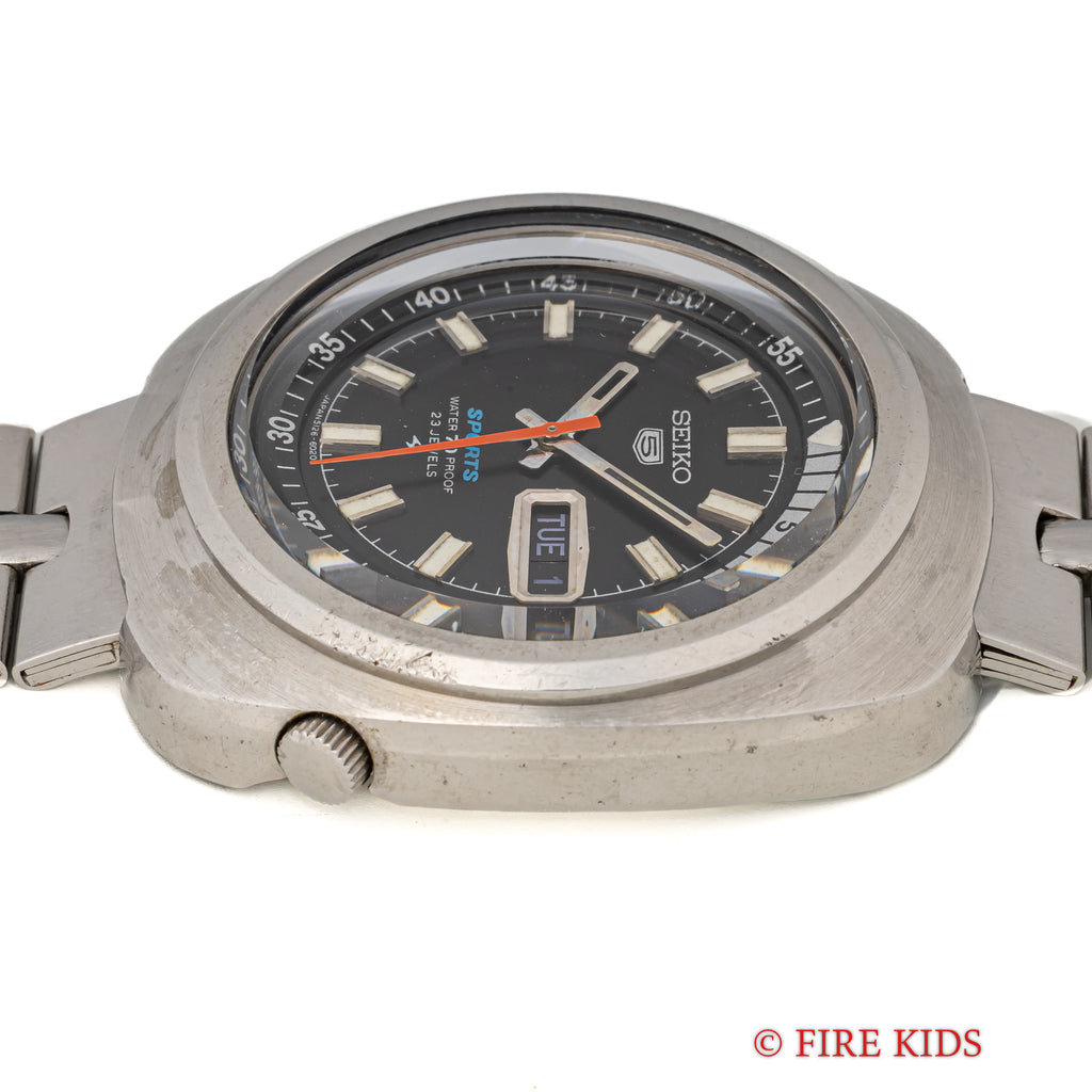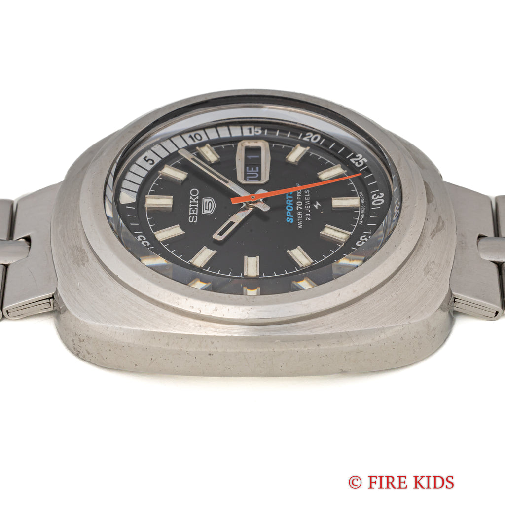 セイコー 5スポーツ 1969年製 インナー回転ベゼル デイデイト自動巻 純正ブレスの入荷になります。自動巻、日付、曜日、防水、耐衝撃の5大機能に加えてインナー回転ベゼルを装備した5スポーツです。文字盤はオリジナルの夜光に変色が見られますがシミ等無く綺麗です。ケースは小傷が見られますが大きなダメージはありません。インナー回転ベゼルの動きもスムーズです。日付はリューズを押し込むと送れる便利なタイプになっています。ベルトは純正のステンレスブレスが取り付けられています。