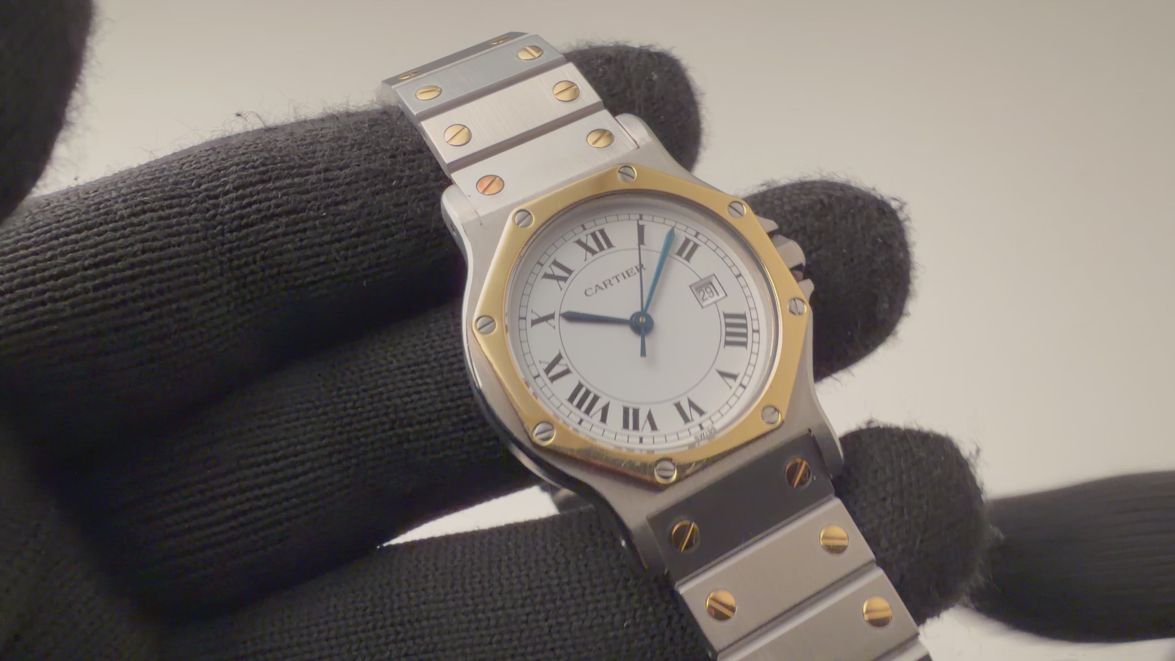 カルティエ サントスオクタゴン LMサイズ 1980年代製 自動巻 コンビ 純正ブレスの入荷になります。サントスシリーズでは現在生産終了している”オクタゴン”です。特徴的な「ビス」の装飾や、ベゼル、ベルトの直線的なデザインはとてもラグジュアリー感があります。時代背景からクォーツモデルは多く見られますが、機械式は比較的少なく、従って良品は減少傾向にあります。文字盤はカルティエらしいホワイトローマンダイヤル、7時位置に隠し文字が確認できます。経年によりひび割れが発生しているモノも多い中こちらはいキレイな状態です。