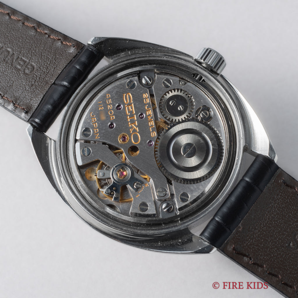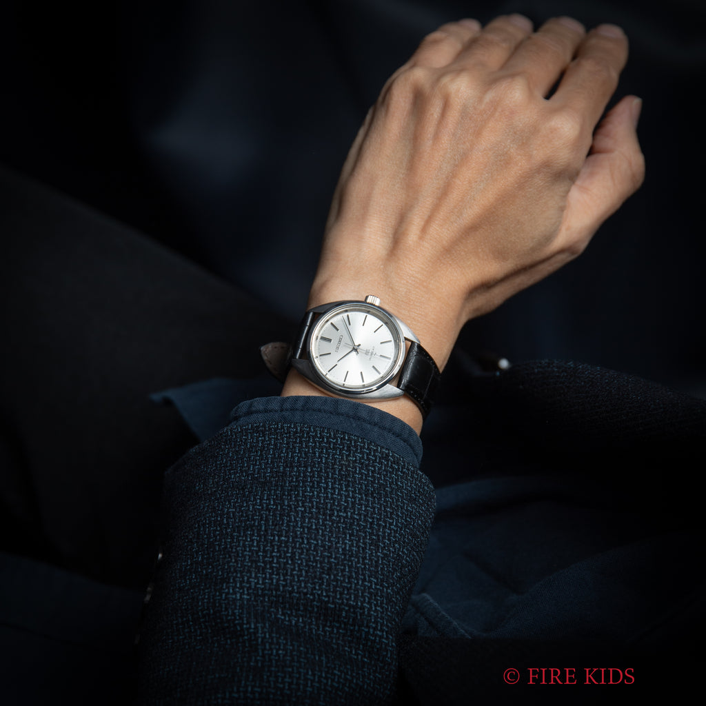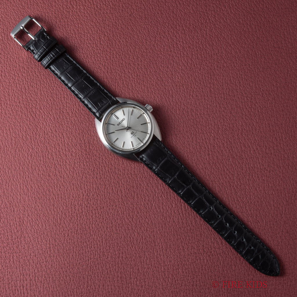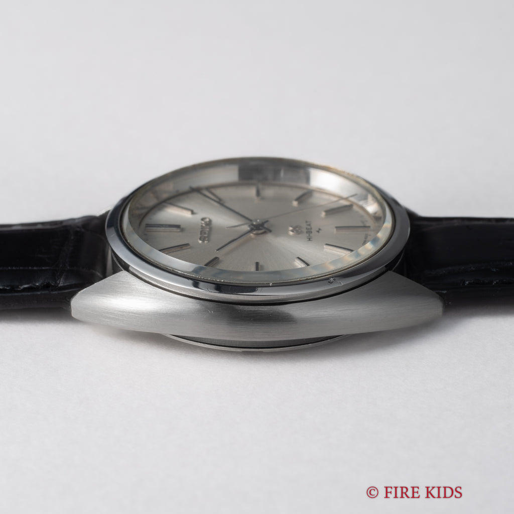 1970年製の45グランドセイコー手巻きモデルです。45GSといえばセイコースタイルと呼ばれるケースをイメージしますが、こちらはトノーケースとなっています。ノンデイトのシンメトリーなデザインも良いですね。ダイヤル、ケースとも少々使用傷はありますが大きなダメージはありません。ムーブメントは手巻き10振動/36000振動の4520Aを搭載、カレンダーの早送り付きで実用性もございます。手巻きや針回しの操作はスムースです。ベルトはファイアーキッズオリジナルクロコダイル革ベルトが取り付けられています。