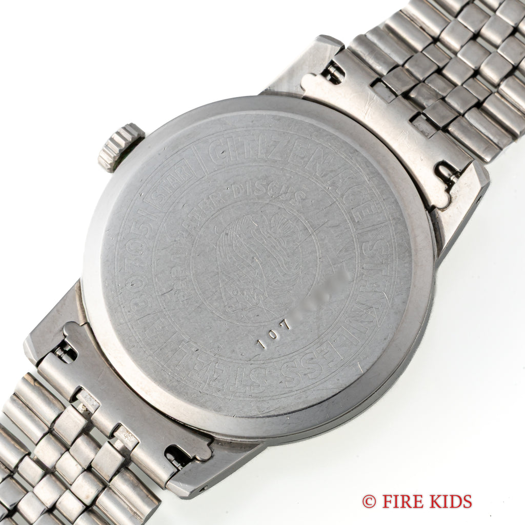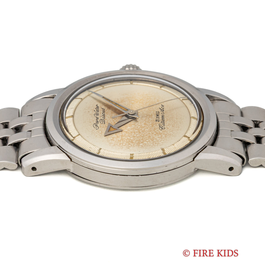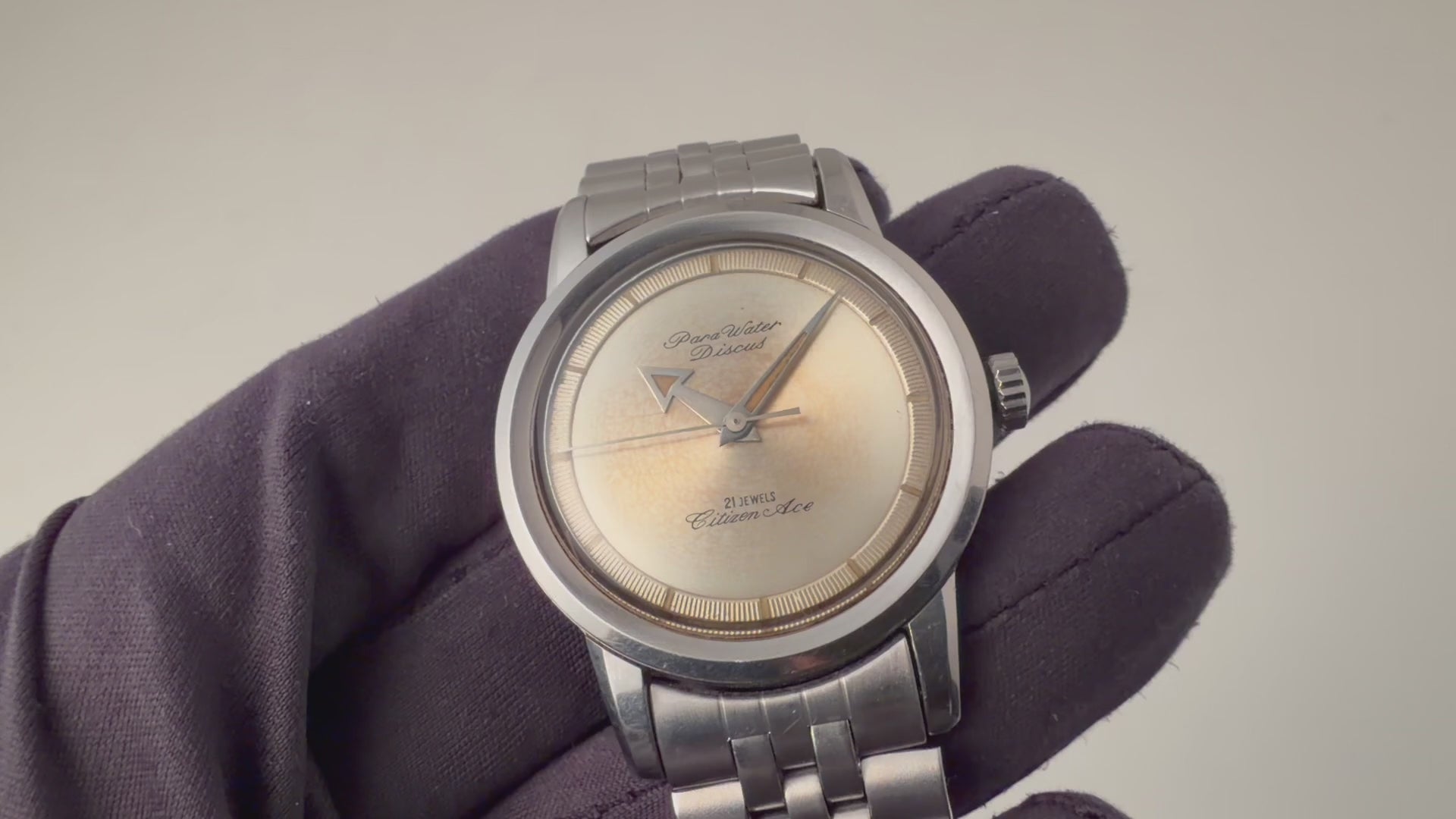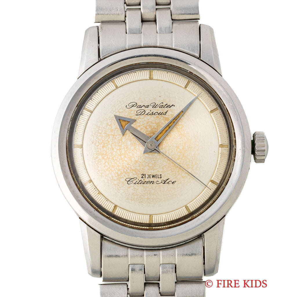 シチズン エース ディスカス 1961年製 アローハンド 21石手巻  純正ブレスです。防水ケースを採用したパラウォーターシリーズ。その中でもアローハンド付きでかなりカッコいいです。文字盤、ケースは小傷や多少の経年はありますが、大きなダメージはありません。裏蓋の薄い刻印も残っています。貴重な純正ブレス付きです。