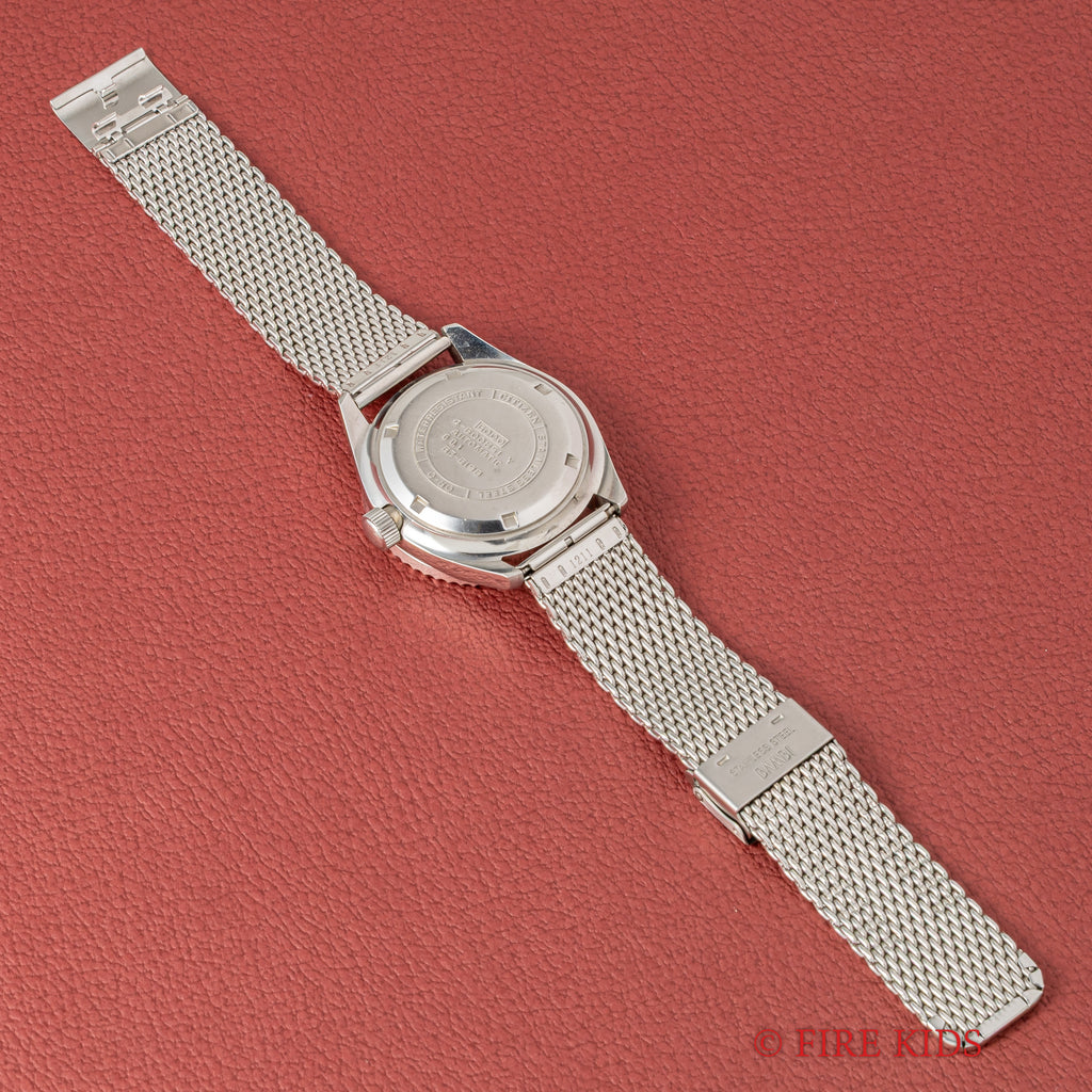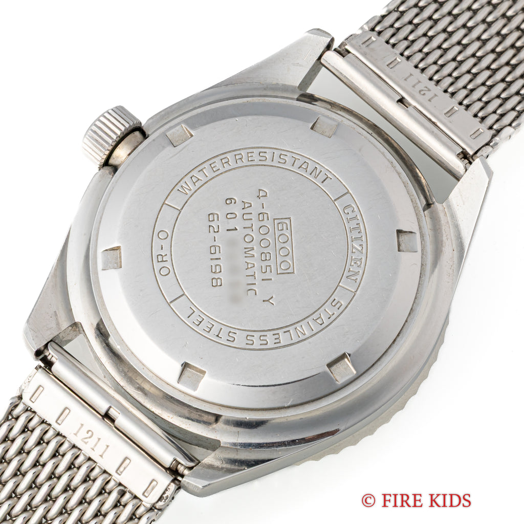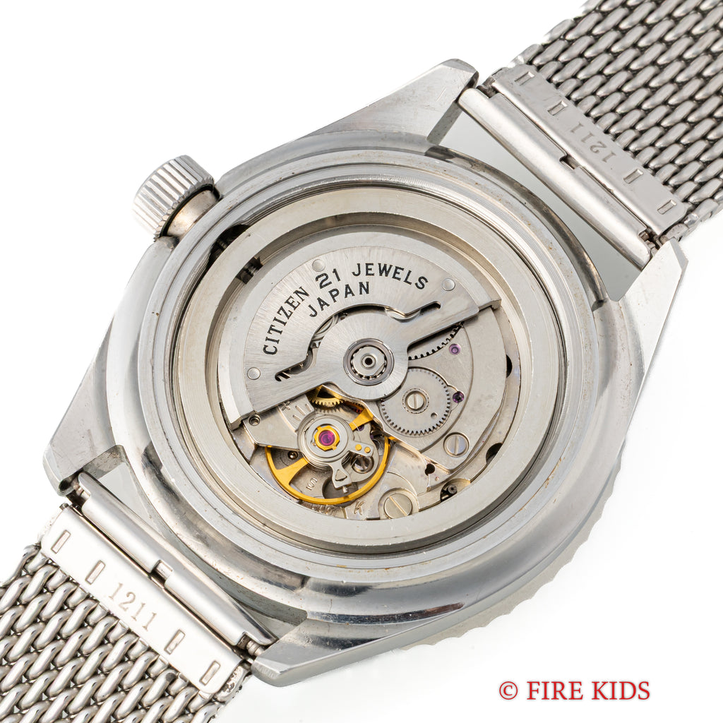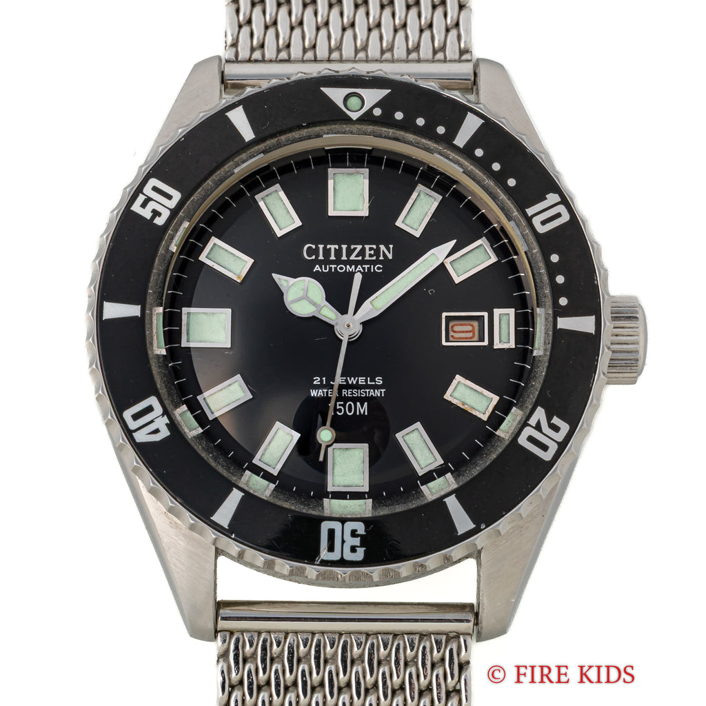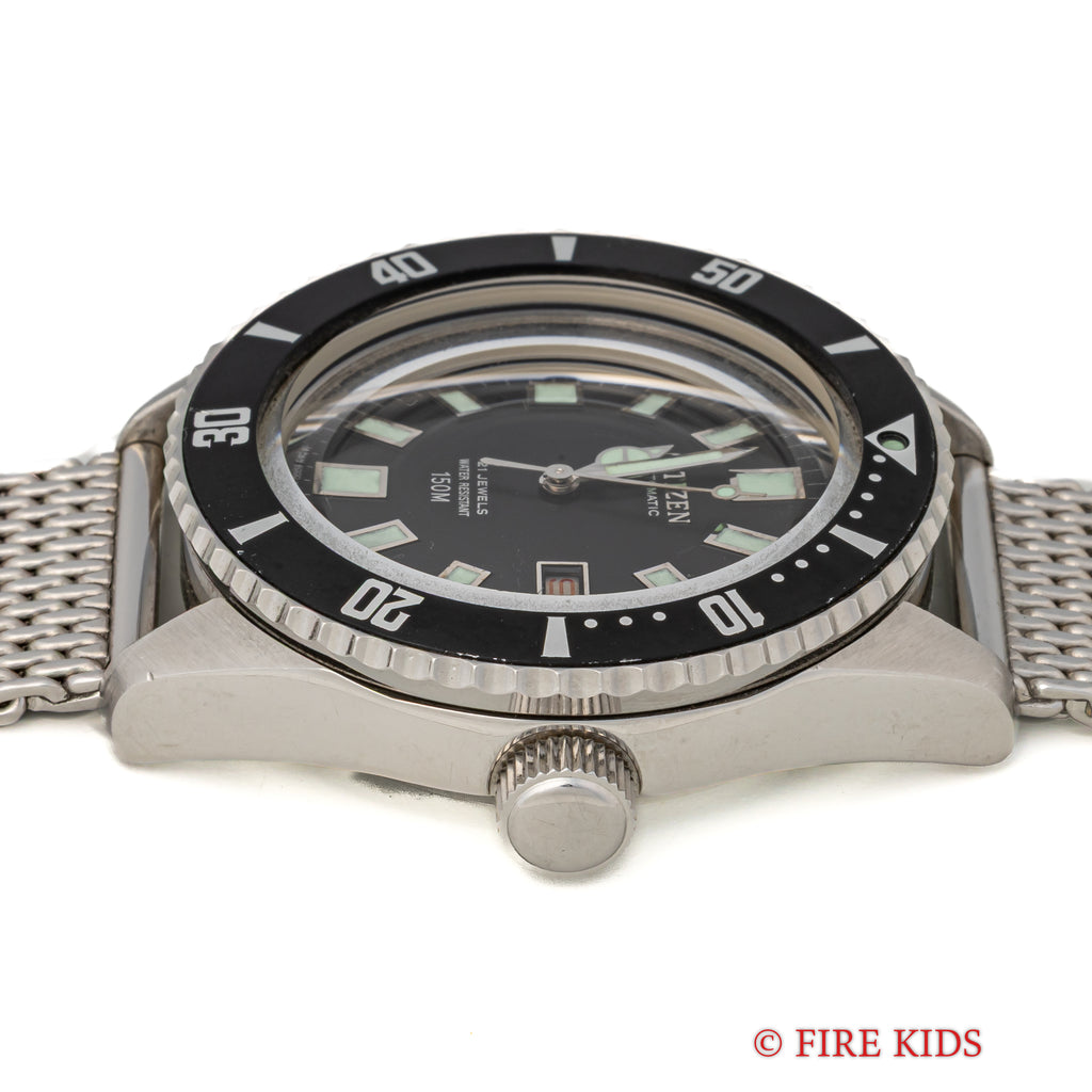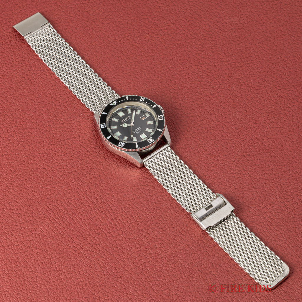 シチズン 150m チャレンジダイバー 1976年製 赤カレンダー 4‐600851Yです。シチズンの2代目のダイバーウォッチで同じ国産のセイコダイバーと比べると数が少なく、べンツ針や赤カレンダー、分厚いクリスタルガラス等が魅力的な時計です。ケースは小傷はありますが大きなダメージはありません。社外のメッシュブレスが付いています。手巻きや針回し、ねじ込みリューズ、ベゼルの操作はスムースです。