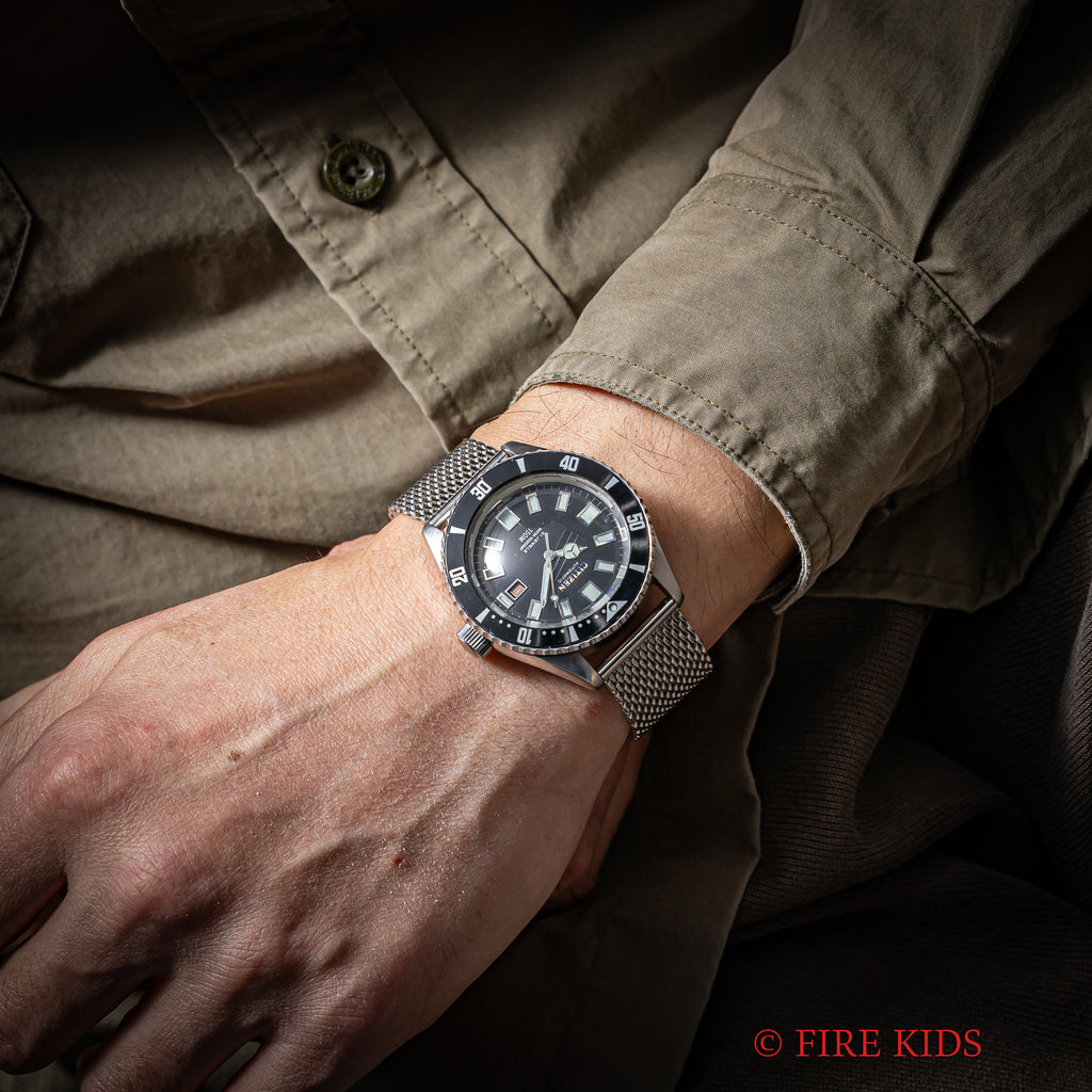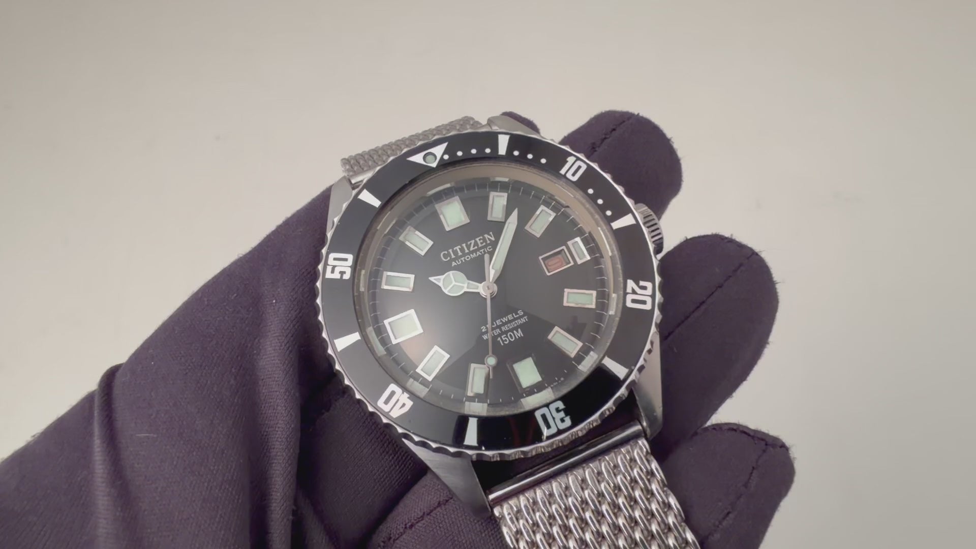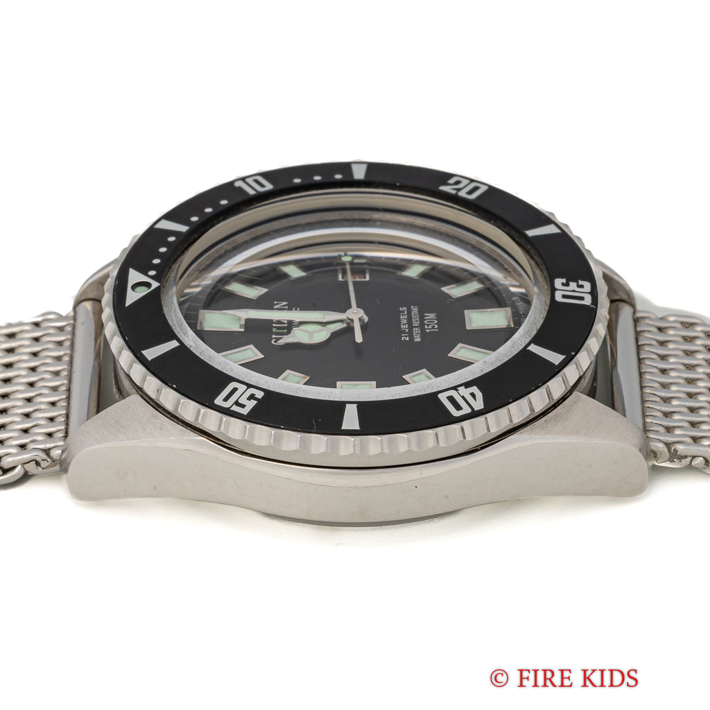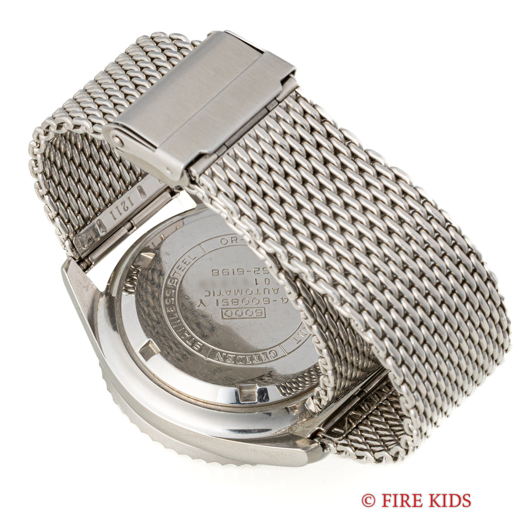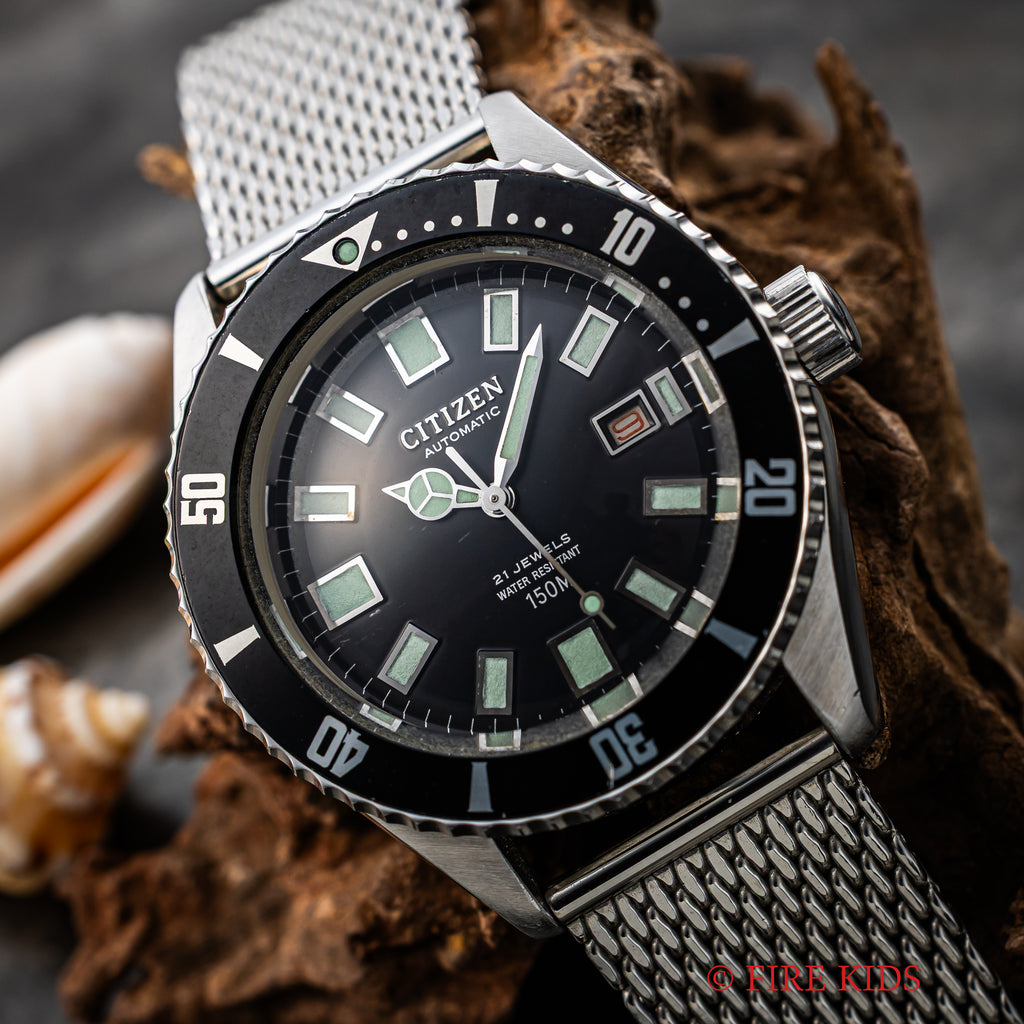 シチズン 150m チャレンジダイバー 1976年製 赤カレンダー 4‐600851Yです。シチズンの2代目のダイバーウォッチで同じ国産のセイコダイバーと比べると数が少なく、べンツ針や赤カレンダー、分厚いクリスタルガラス等が魅力的な時計です。ケースは小傷はありますが大きなダメージはありません。社外のメッシュブレスが付いています。手巻きや針回し、ねじ込みリューズ、ベゼルの操作はスムースです。