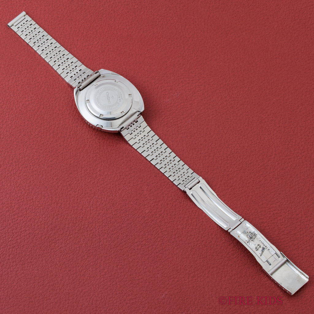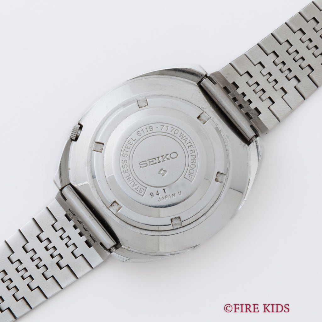 セイコー 5スポーツ チェッカー回転ベゼル 1969年製 Ref.6119-7170 自動巻 純正ブレスの入荷になります。存在感のある大振りなトノーケースにオレンジ秒針、チェッカーの回転ベゼルなど斬新なデザインが魅力的です。文字盤とケース共に良好なコンディションです。ムーブメントは自動巻きのみで使われているCal.6119Bを搭載、カレンダーは英語表記でリューズを押し込むことで日付の早送りができます。ベルトは純正のステンレスブレスが取り付けられています。