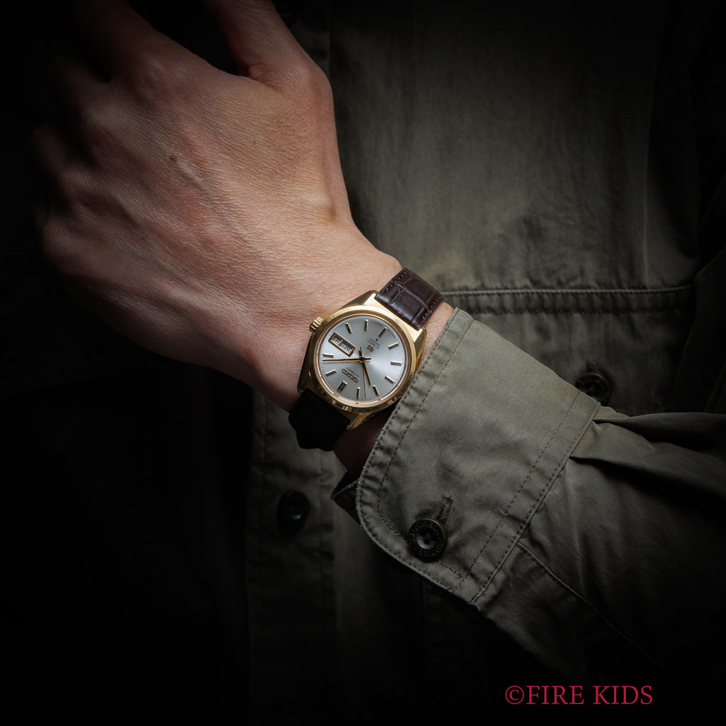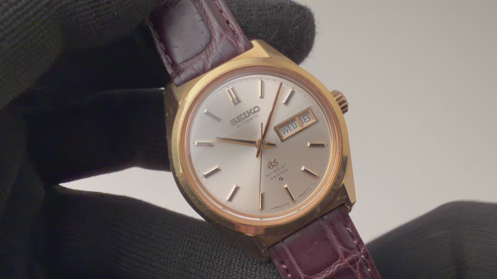 18金無垢グランドセイコー 1970年製 Ref.6146-8000 10振動自動巻きです。18金無垢イエローゴールドのセイコースタイルケースにデイデイト10振動のハイビート自動巻を搭載したスペシャルモデルです。それまで海外の高級時計を意識したデザインから独自デザインに変わった年代でセイコーの技術がスイス製に負けていないという自信がデザインにも現れている感じがします。61GSの中でも金無垢ケースは珍しく状態の良い個体は希少です。文字盤は若干経年がございますが綺麗な状態です。ケースも小キズが見られますが大きなダメージ無く良い状態です。手巻きや針回しの操作はスムーズです。ベルトはファイアーキッズオリジナルのクロコダイル革ベルトに純正尾錠が取り付けられています。