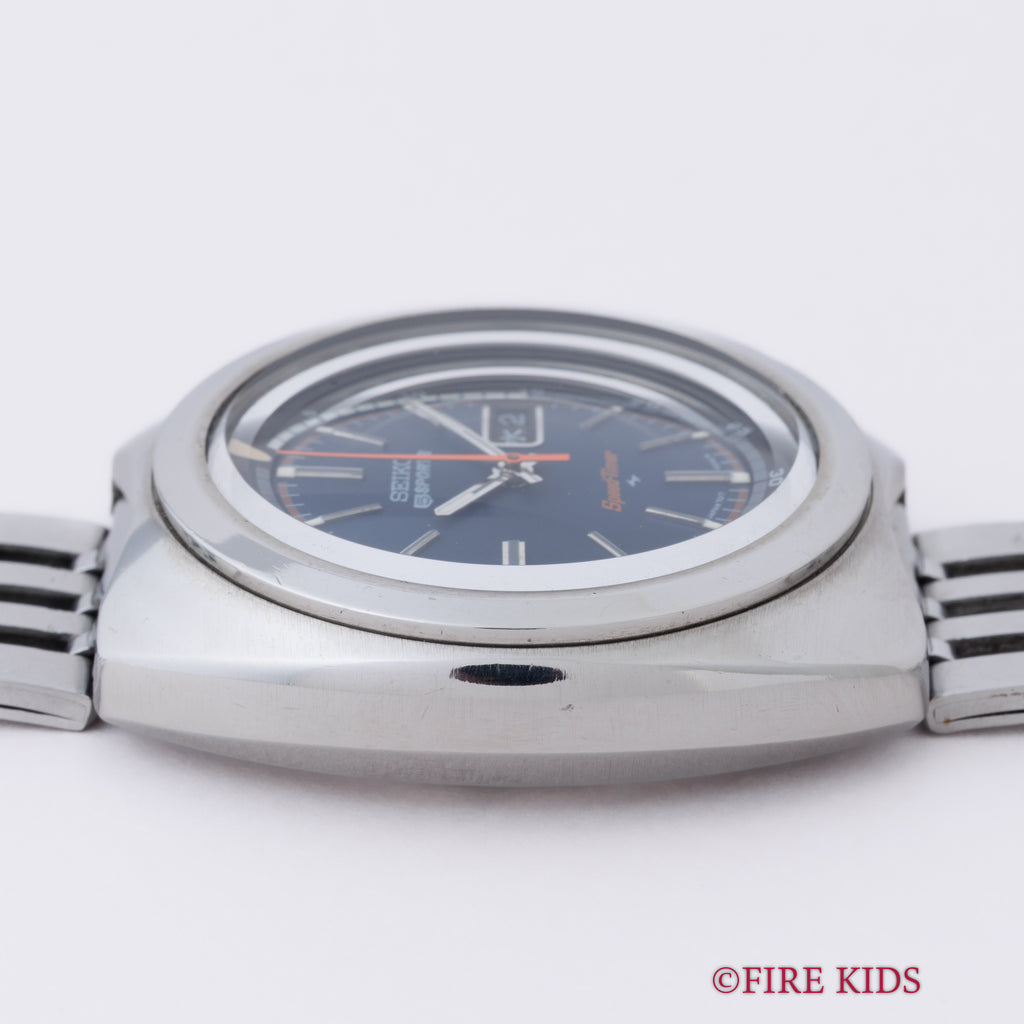 セイコー 5スポーツ スピードタイマー 1971年製 Ref.7017-6040 Cal.7017A 自動巻きクロノグラフです。文字盤の表記は12時間ではなく60秒の表記にしており、クロノグラフとしての視認性を上げたデザインになっております。インナー回転ベゼルで60分の積算をするクロノグラフです。曜日はリューズを押し込み早送りができます。日付の早送りはリューズ一段引いて回すとできます。小傷程度でケースや文字盤も綺麗で状態は良好です。ブレスレットは5スポーツ純正を装着しています。