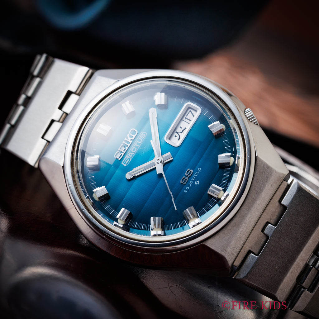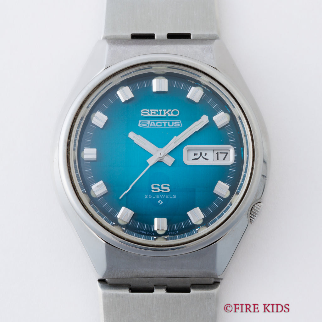 セイコー 5アクタス Ref.6106-7690 純正ブレス付き 1973年製 カットガラス グラデーションダイヤル 自動巻きです。1970年代に若者向けに登場したセイコーの自動巻き腕時計シリーズです。自動巻き、日付、曜日、防水、耐震装置の5つの機能を備えていることが「5」の由来です。使用感少なくカットガラスおよび、全体のコンディションは良好です。5アクタス純正ブレスが付いています。