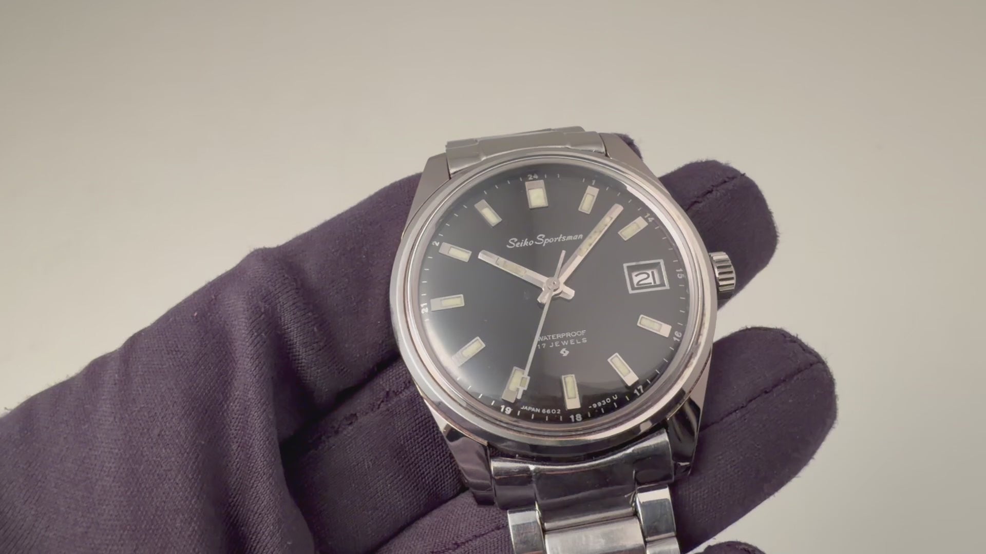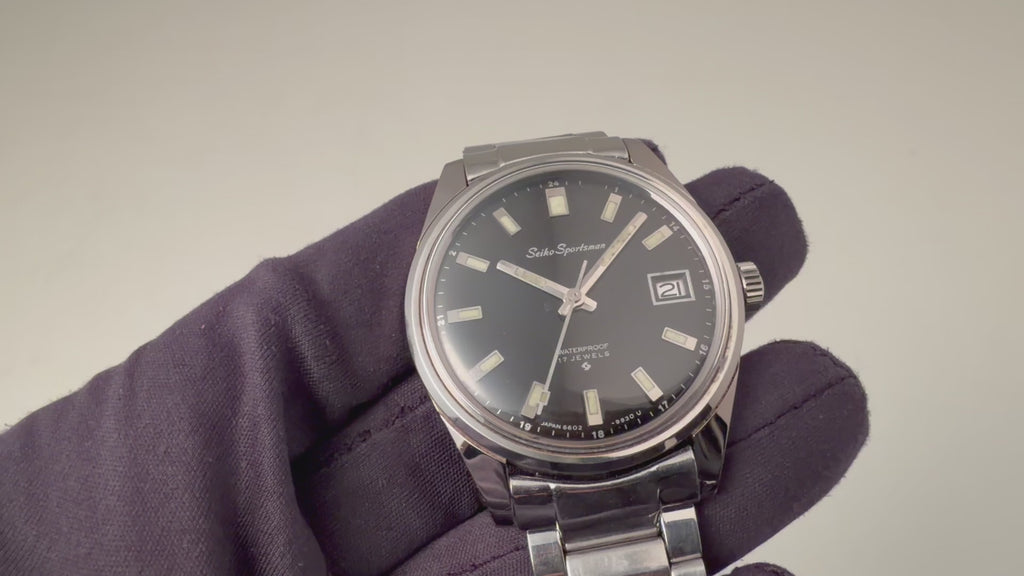 セイコー スポーツマン グレーダイヤル 1967年製 タツノオトシゴ 純正ブレス付きの入荷になります。シンプルなラウンドケースに光沢感のあるブラックダイヤルに人気の150mダイバーを思わせる文字盤デザインや針が印象的です。防水のスナップバックケースで小傷がありますが大きなダメージはありません。文字盤は年代なりの経年は見受けられますが艶感をしっかりと残しています。ベルトは純正のステンレスブレスが取り付けられています。