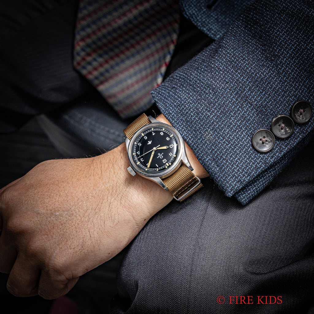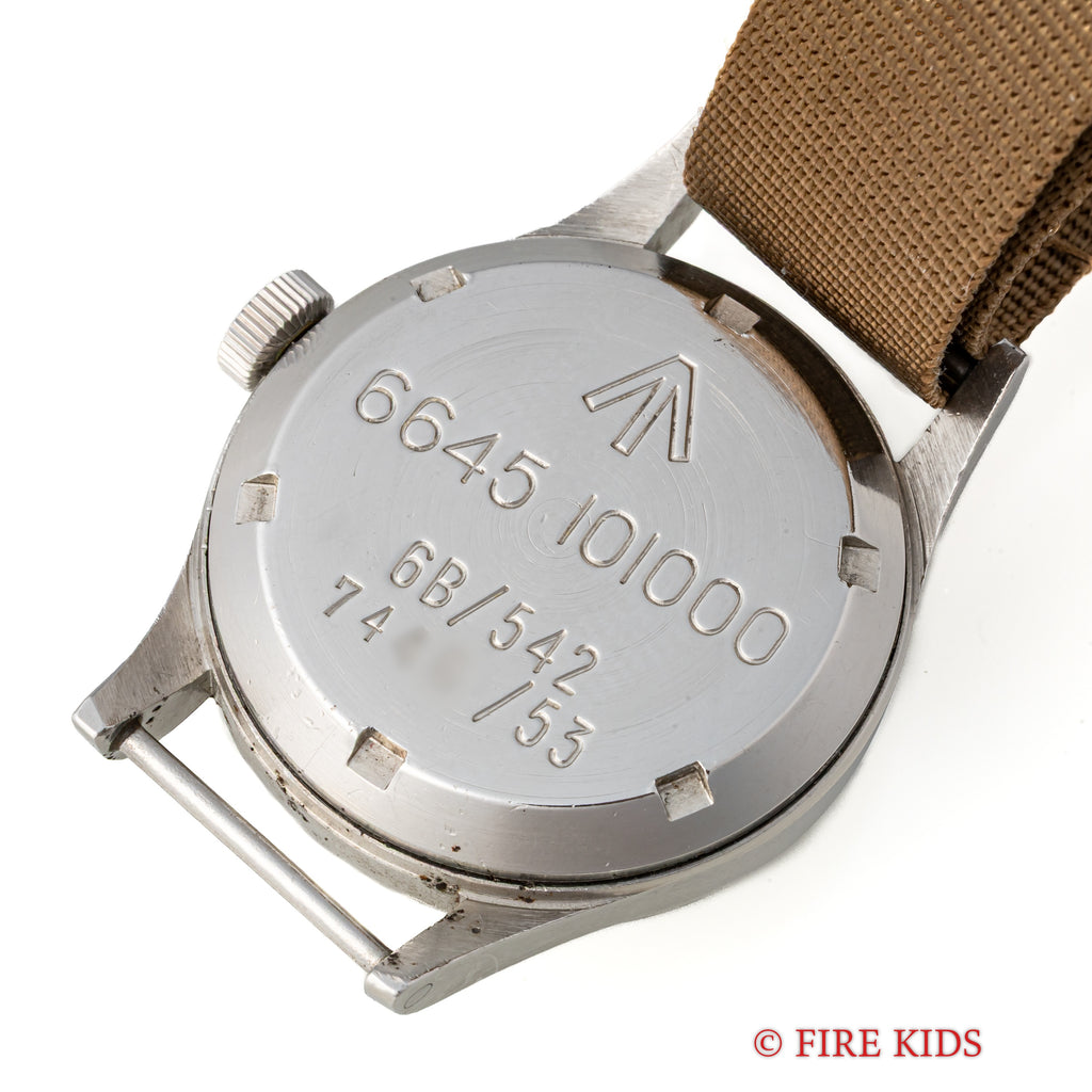 オメガ イギリス空軍 パイロットウオッチ Ref.2777‐1SC Cal.283 1953年製 ファットアローの入荷になります。1953年製でファットアローと呼ばれるトリチウム夜光文字盤です。ケースが二重構造で耐磁、耐衝撃に優れた本格空軍パイロットウオッチです。1953年の一年間しか導入されていない為に中々入手の難しいモデルになります。ケースは小傷がありますが大きなダメージはありません。夜光の変色や表面の荒れはありますがシミ等無く良い状態です。ムーブメントは30㎜キャリバーシリーズのセンターセコンドcal.283を搭載しています。機械も綺麗で手巻きや針回しの操作はスムーズです。ベルトはNATOタイプを装着しています。