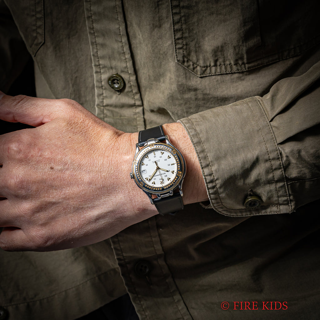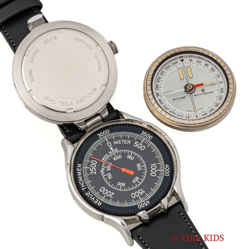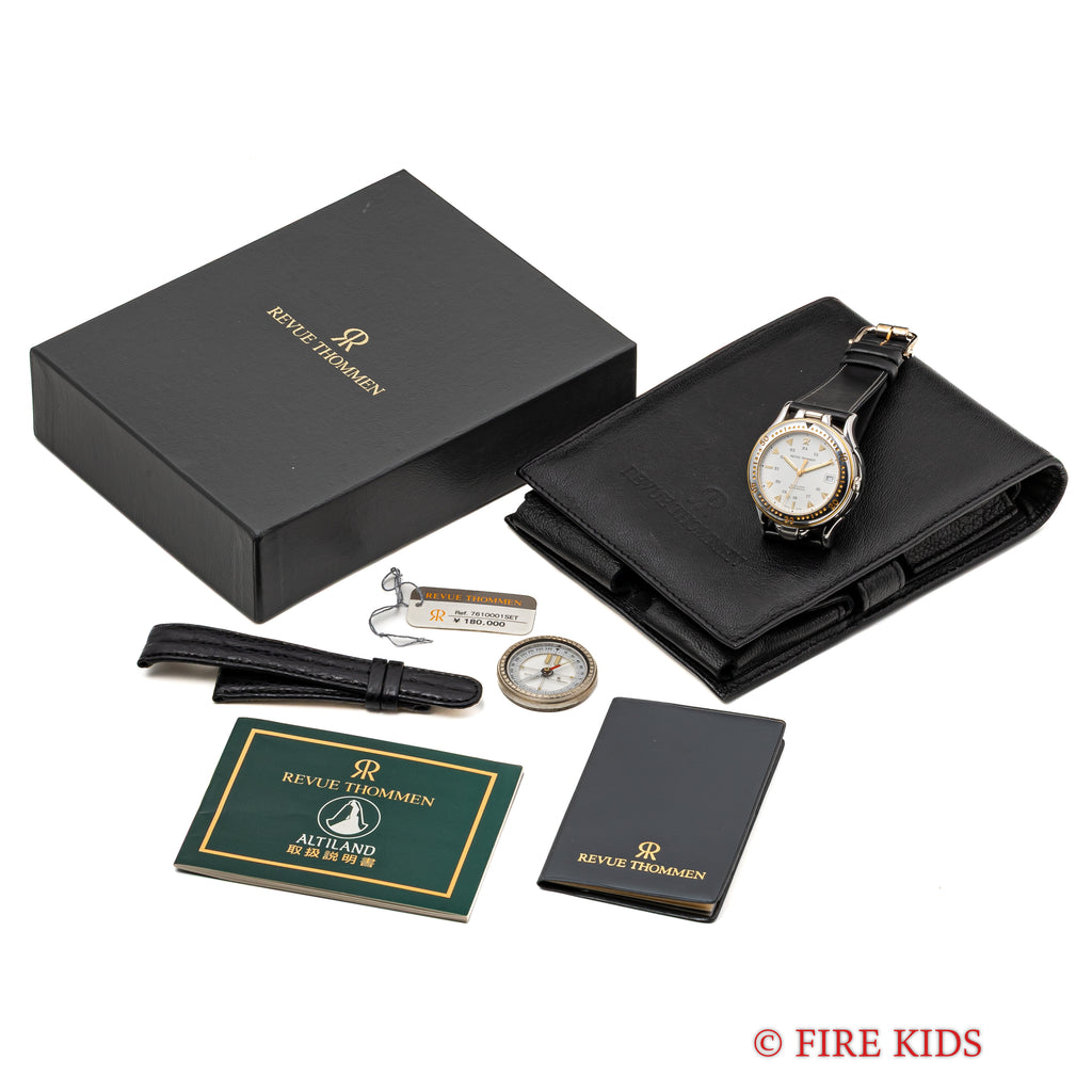 レビュートーメン アルティランド 1990年代製 自動巻 コンパス 高度計付きフィールドウオッチの入荷になります。自動巻腕時計の下にコンパスと高度計を装備したアウトドア用のフィールドウオッチです。時計裏面は鏡面加工されたミラーになっています。使用感が少ないオリジナル革ベルトが付属します。手巻きや針回しの操作はスムースです。ムーブメントはETAの2892A2を搭載しています。ベルトはファイアーキッズオリジナル、イタリアンレザーのブッテーロ(裏面ラバー)に純正尾錠が取り付けられています。