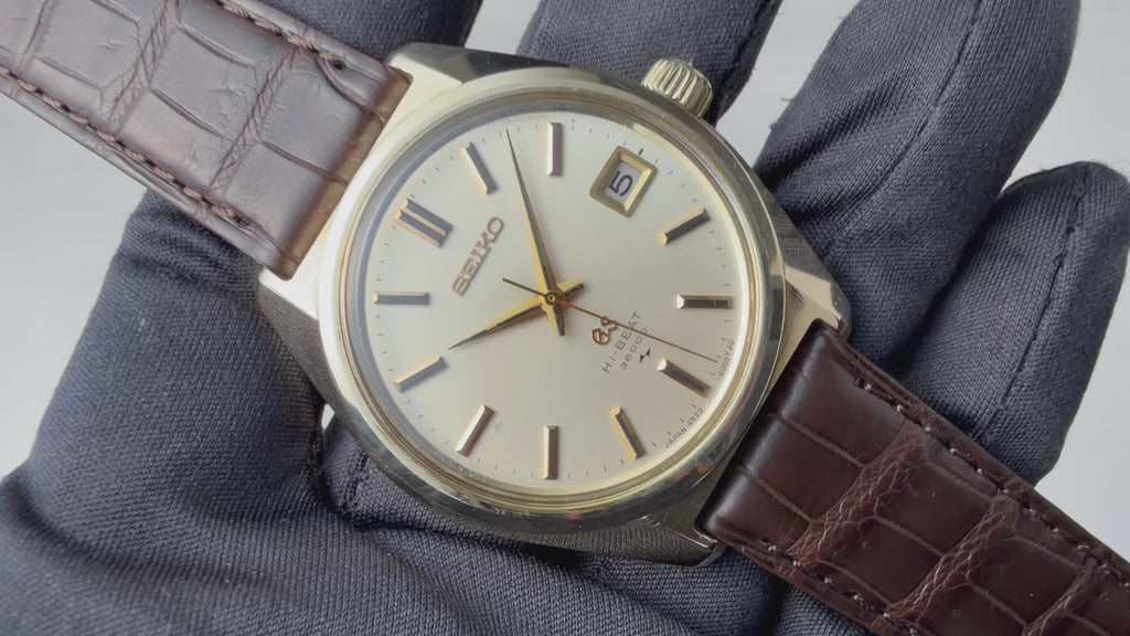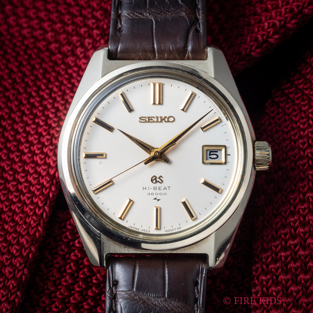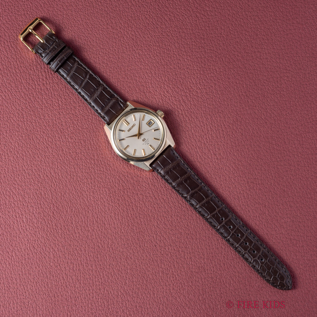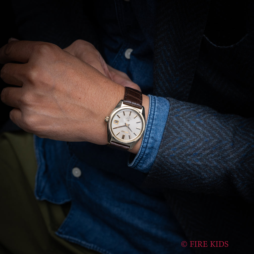 グランドセイコー 1968年製 手巻10振動 Ref.4522-8000 キャップゴールド 45GS パティーナダイヤルです。セイコースタイルと呼ばれる独自のケースデザインも魅力的なモデルで、それまで海外の高級時計を意識したデザインから独自のデザインに変わった年代です。セイコーの技術がスイス製に負けていないという自信がデザインにも現れている感じがします。文字盤は全体的に変色した良い雰囲気で、CAP GOLDのケースとも相性良しです。ムーブメントは手巻き36000振動の4522Aを搭載し、手巻きや針回しの操作はスムーズです。リューズは若干の傷みが見られますがオリジナルです。裏ブタのメダリオンもしっかり残っています。ベルトはファイアーキッズオリジナルのクロコダイル革ベルトが取り付けられています。