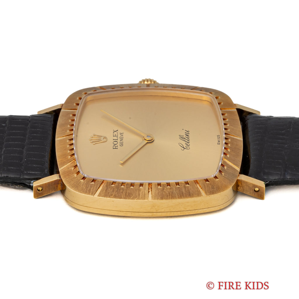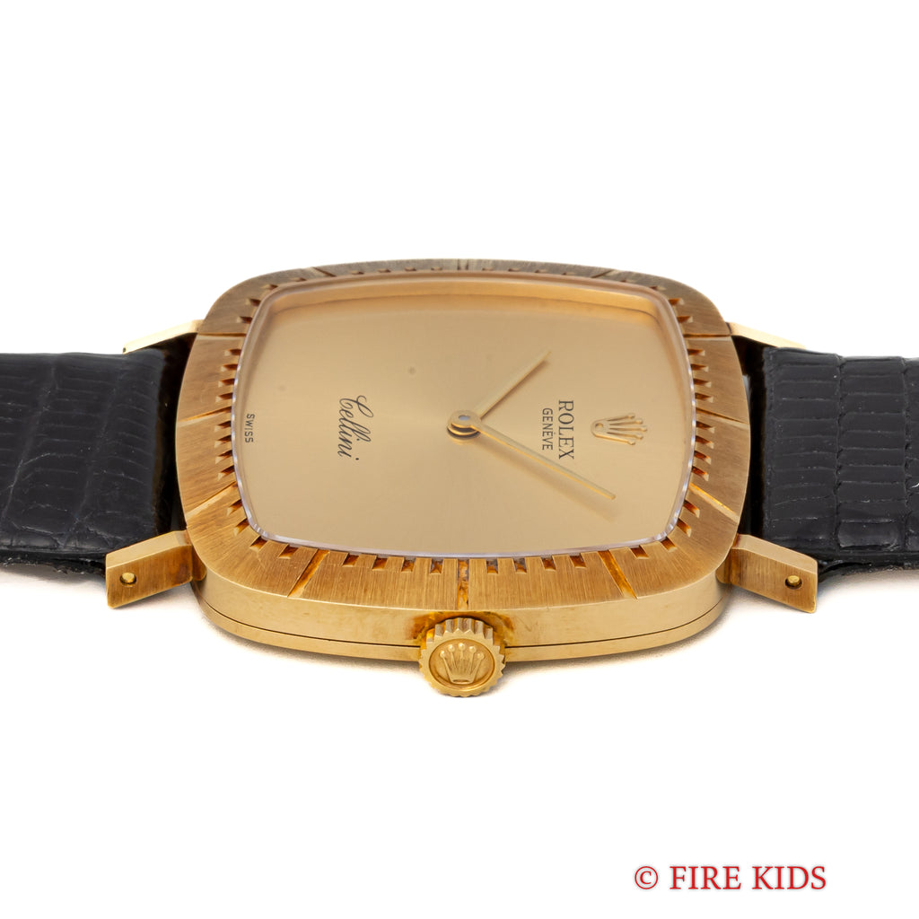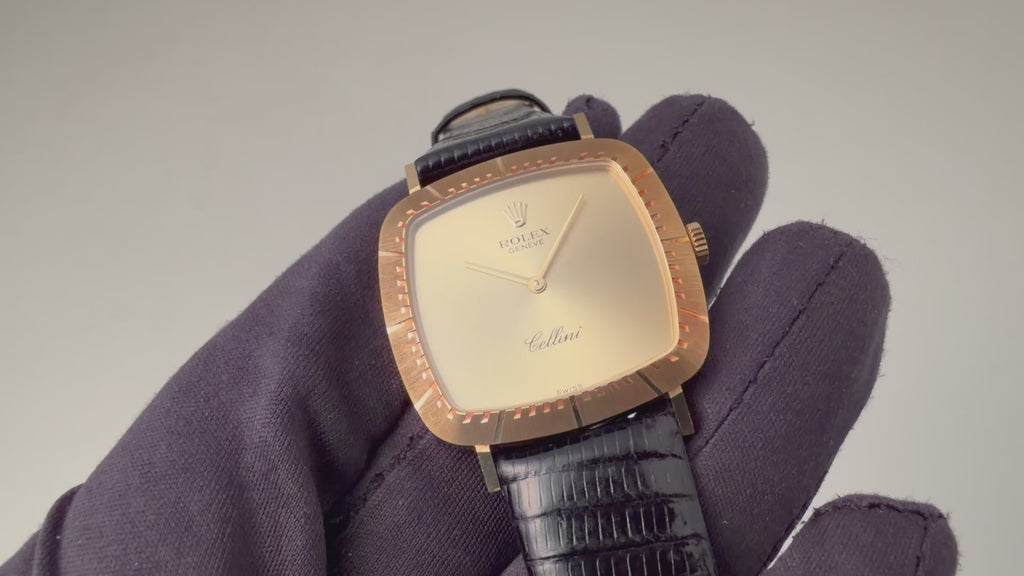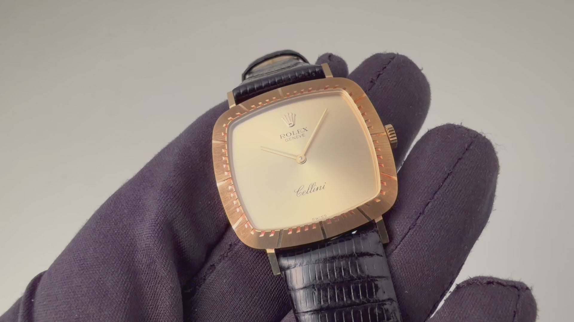 ロレックス 18金無垢チェリーニ 1990~1991年製 Ref.4084 純正18金無垢尾錠付き 手巻きです。18金無垢のケースにシャンパンゴールドダイヤルにミニッツの刻みがベゼルに彫られたデザインです。幅約30㎜(リューズ別)厚さ約5㎜と小ぶりで上品なサイズ感です。ムーブメントは手巻きのCal.1601を搭載。ケースは小傷はございますが大きなダメージはございません。手巻きや針回しの操作はスムーズです。ベルトは社外のリザードに純正の18金無垢尾錠が付いています。