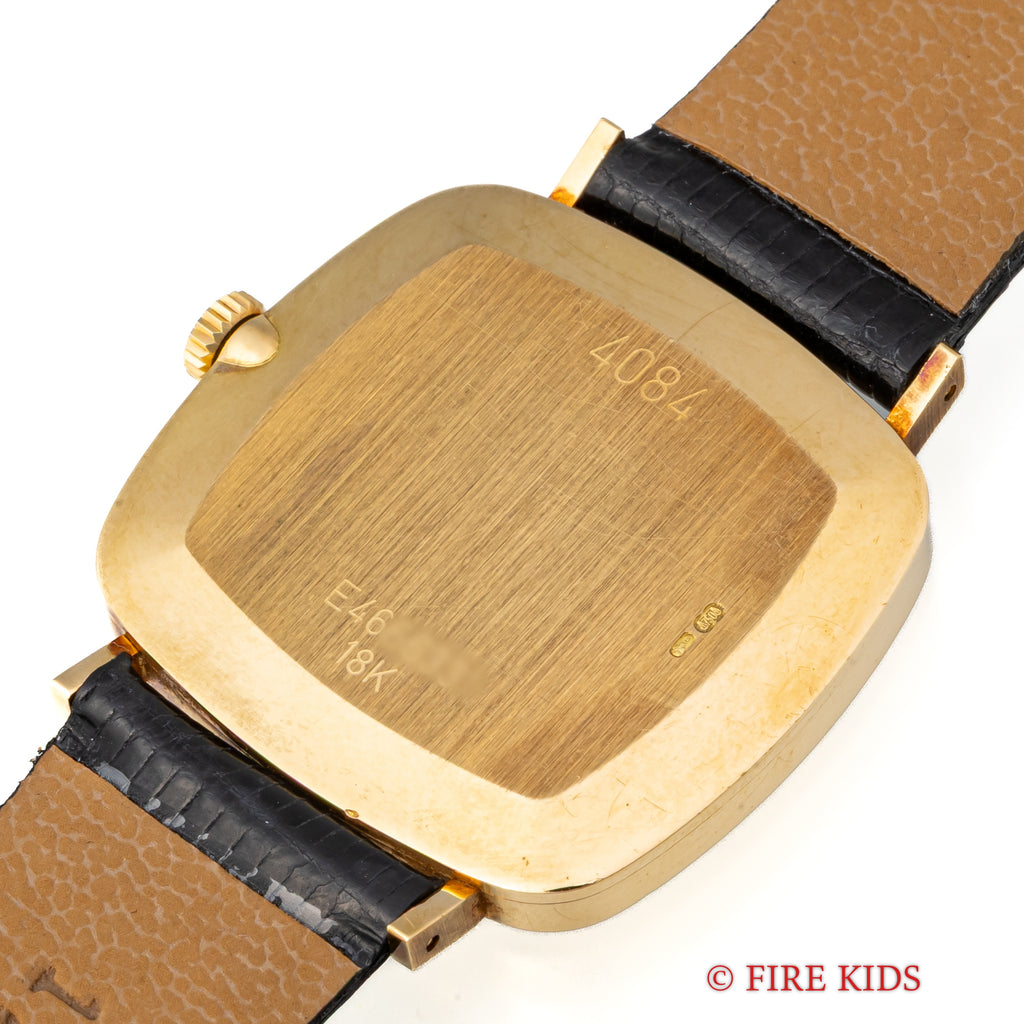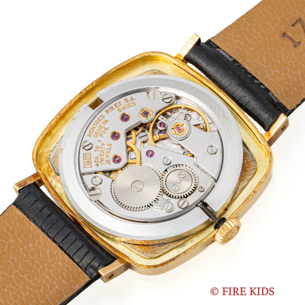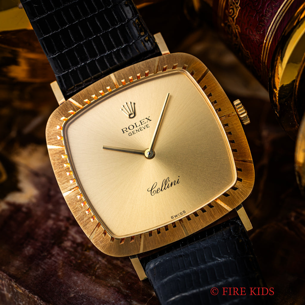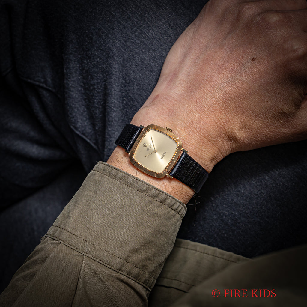 ロレックス 18金無垢チェリーニ 1990~1991年製 Ref.4084 純正18金無垢尾錠付き 手巻きです。18金無垢のケースにシャンパンゴールドダイヤルにミニッツの刻みがベゼルに彫られたデザインです。幅約30㎜(リューズ別)厚さ約5㎜と小ぶりで上品なサイズ感です。ムーブメントは手巻きのCal.1601を搭載。ケースは小傷はございますが大きなダメージはございません。手巻きや針回しの操作はスムーズです。ベルトは社外のリザードに純正の18金無垢尾錠が付いています。