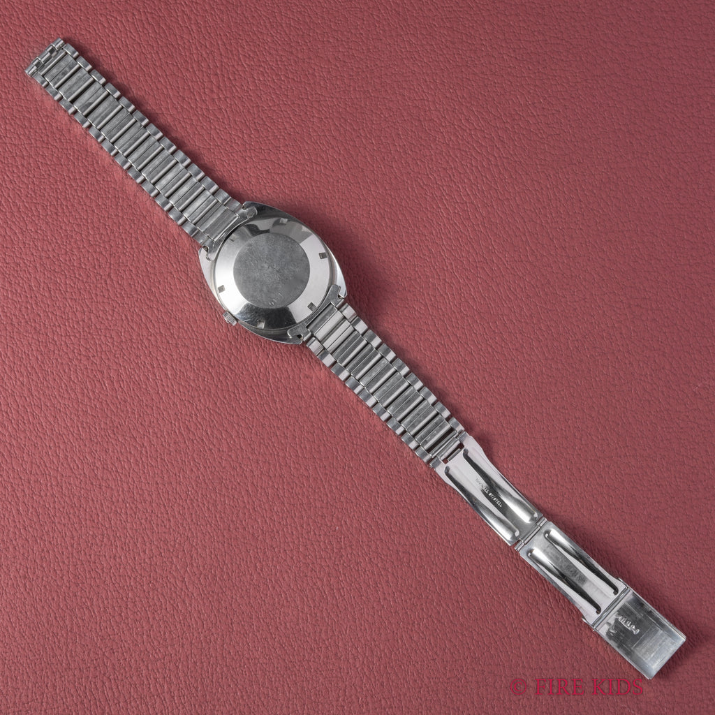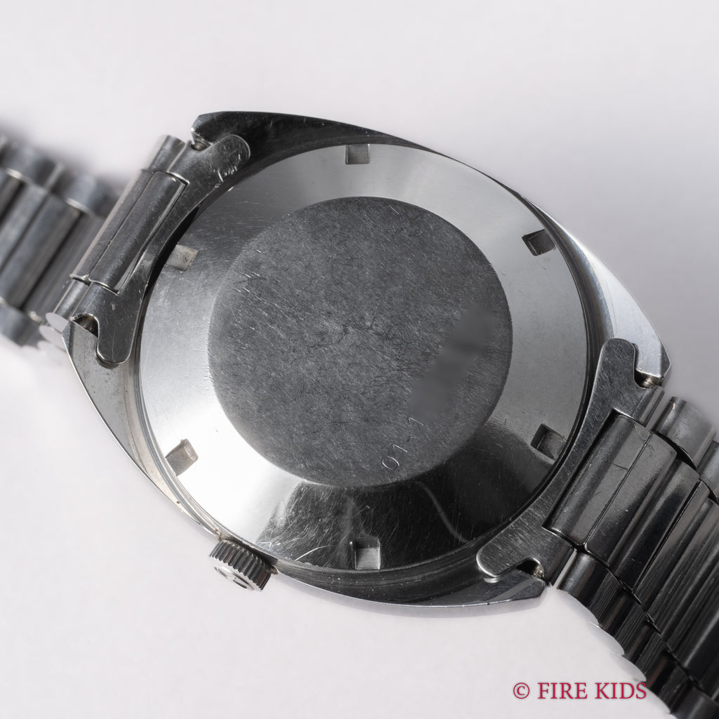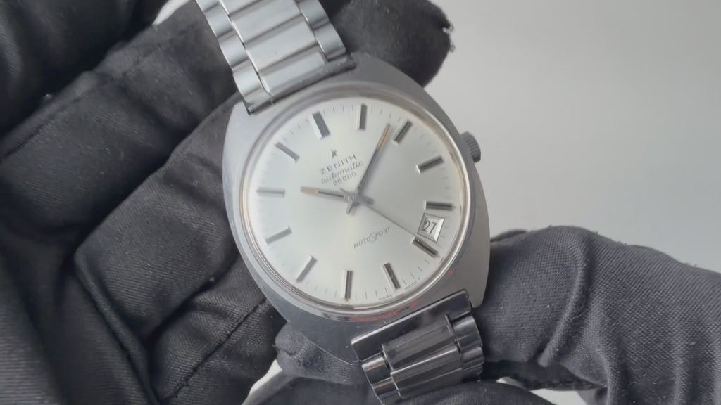ゼニス オートスポーツ 28800 1970年代製 ハイビート自動巻 Cラインケース 純正ブレスです。Cラインケースの70年代付近の良い雰囲気の一本です。4時位置デイトもユニークです。文字盤はシミ等無く綺麗です。小傷はありますが大きなダメージはありません。ムーブメントは8振動自動巻きのcal.2562PCを搭載しています。純正ステンレスブレス付きです。