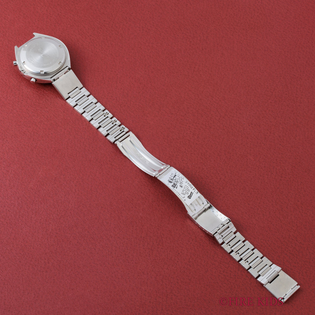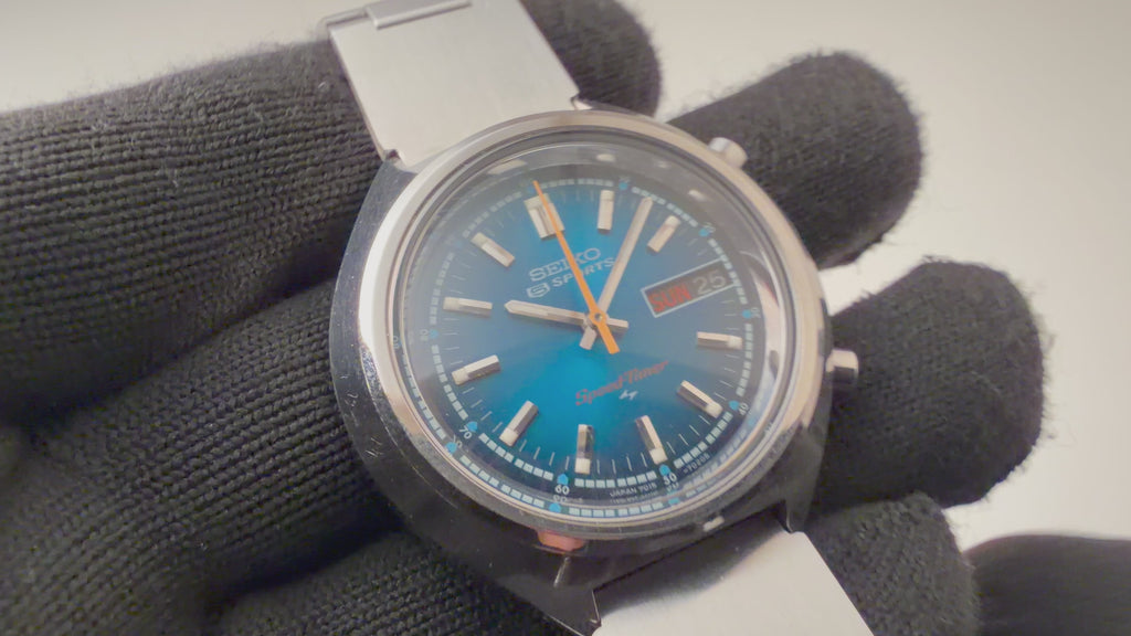 セイコー 5スポーツ スピードタイマーRef.7015-7000 1973年製です。積算計無しのシンプルなクロノグラフで、ブルーのグラデーションが目を引くスポーツウオッチです。全体的にダメージは少なく、とても良いコンディションです。外周の数字は珍しいデシマルメーターになっています。 デシマルメーターとは航空・航海で距離を測る際の「デシメートル」という単位で「100デシメートル(=10メートル)」を差しています。こちらは未使用品いわゆるNew Old Stock品です。純正ブレスが付いています。日付の早送りやクロノグラフの機能は可動確認済です。