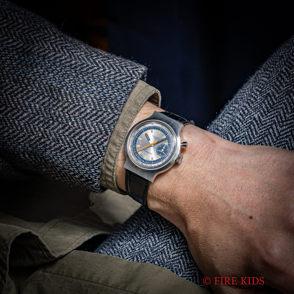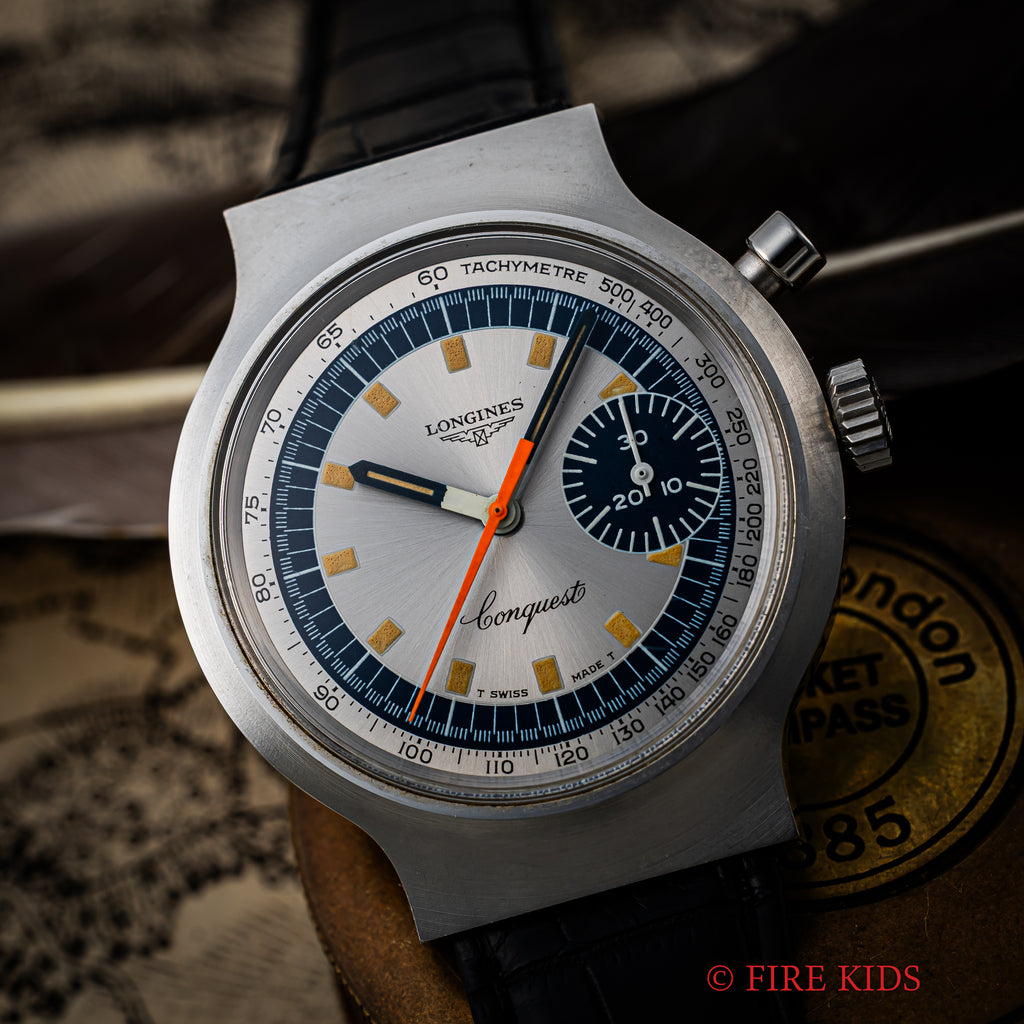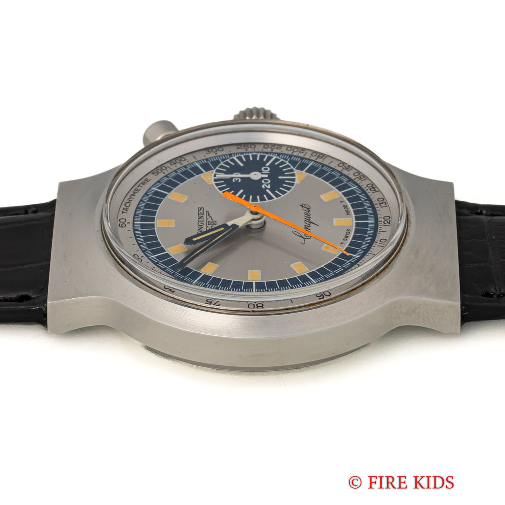 ロンジン コンクエスト 1972年製 ミュンヘンオリンピック記念モデル ワンプッシュクロノグラフ 純正尾錠の入荷になります。1972年のミュンヘンオリンピック記念モデルで70年代らしい近未来デザインになっています。使用感の無い美品です。ムーブメントはバルジュー23(72の12時間計無し)ベースのcal.236(ロンジン cal.334)を搭載しています。ベルトはファイアーキッズオリジナルのクロコダイル革ベルトに純正尾錠が取り付けられています。