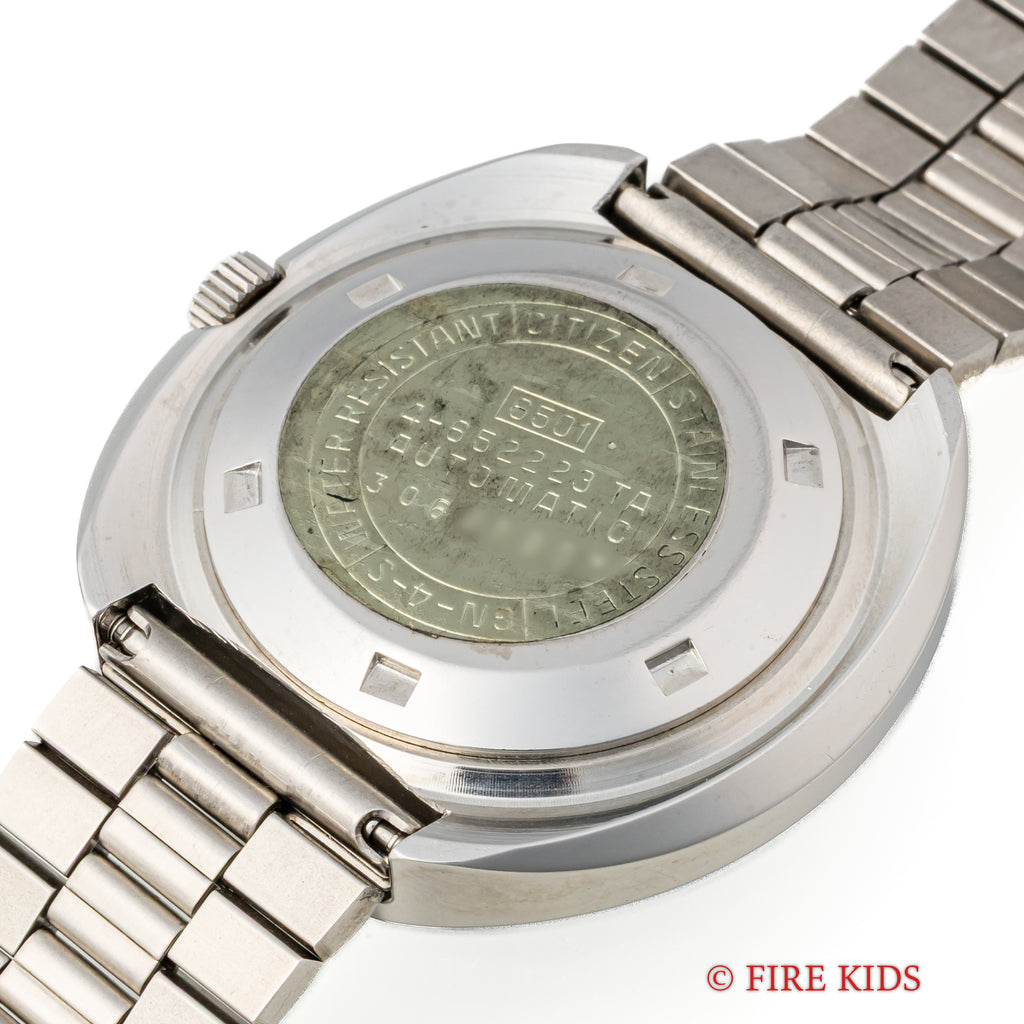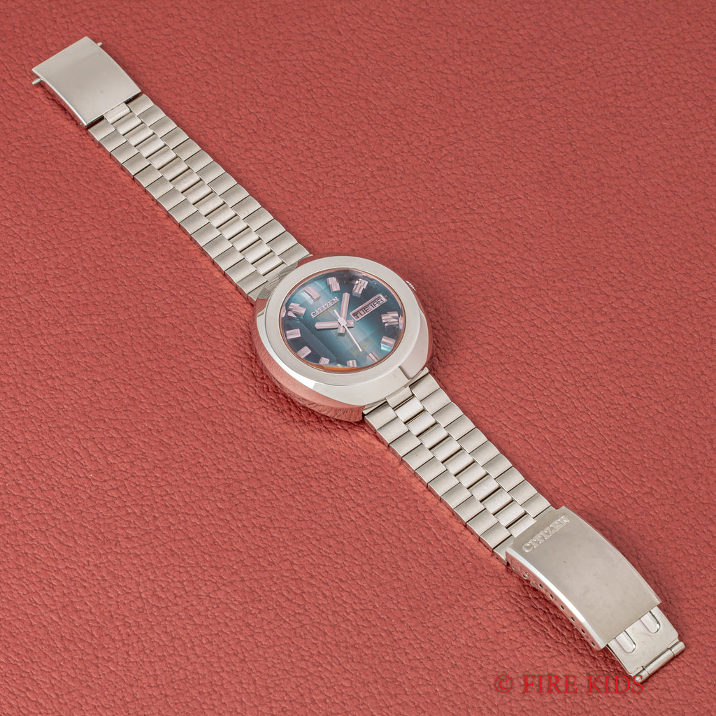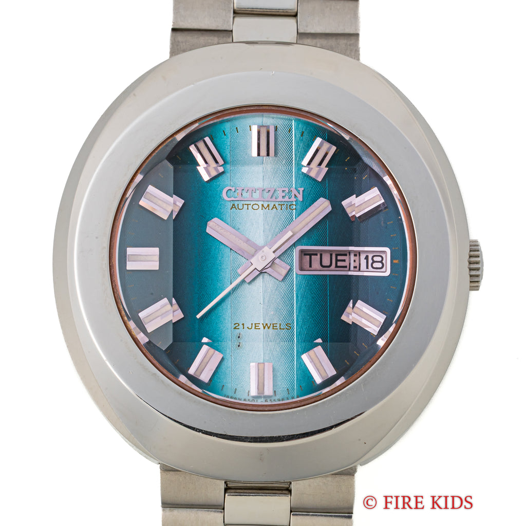 1973年製のシチズンセブンスターV2です。シチズンがセイコー5に対抗して作り上げた7つの機能を持つ時計として販売されました。カットガラスにブルーグラデーションダイヤルの1970年代の雰囲気を感じる組み合わせの一本です。ケースは、ステンレスケースとなっており、保管スレ程度の小傷はございますが大きなダメージ等なくきれいな状態です。ほとんど使用した形跡は無く裏ブタのシールもそのまま残って、当時のタグも付いたN.O.S(ニューオールドストック)状態です。ブレスは純正のブレスレットが取り付けています。