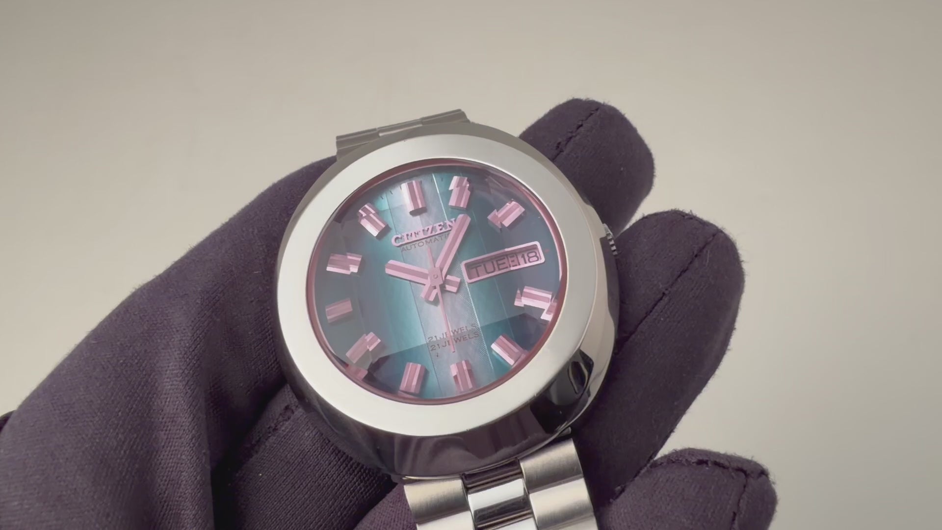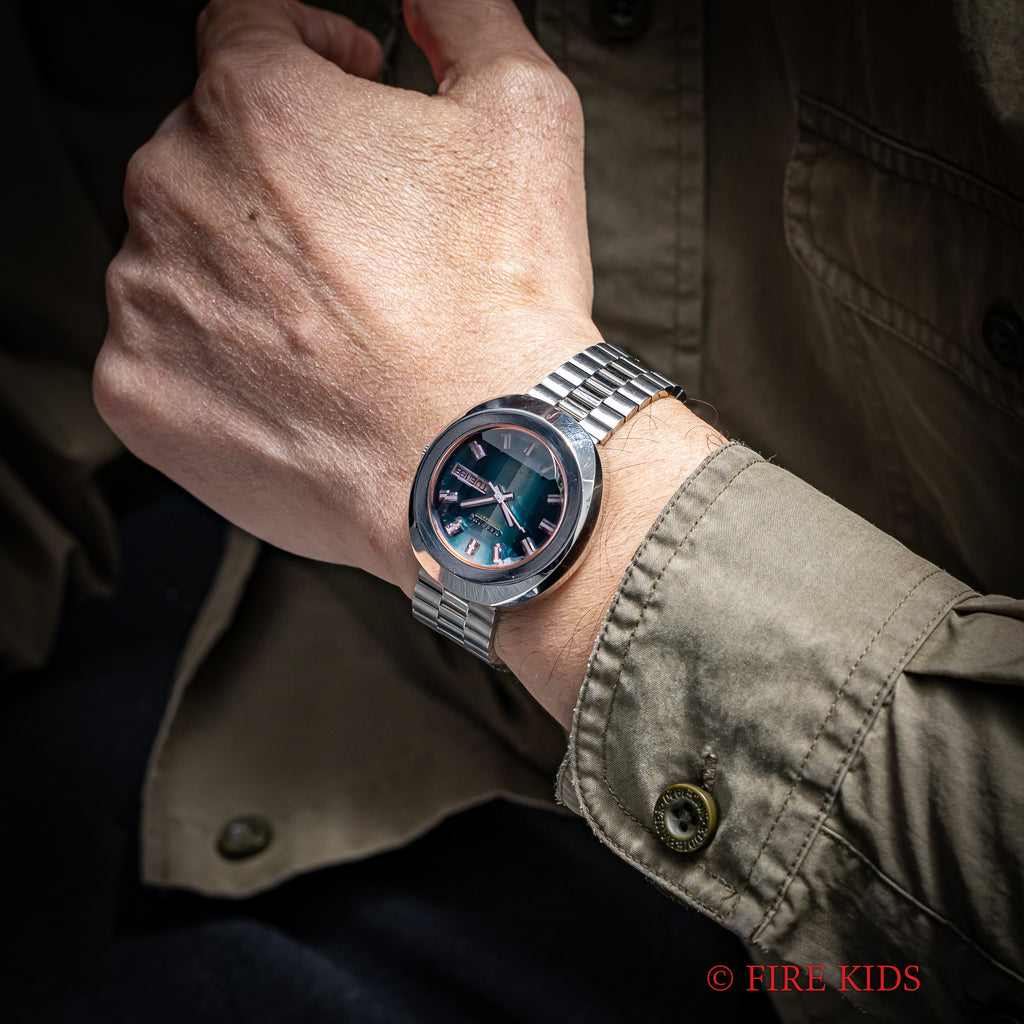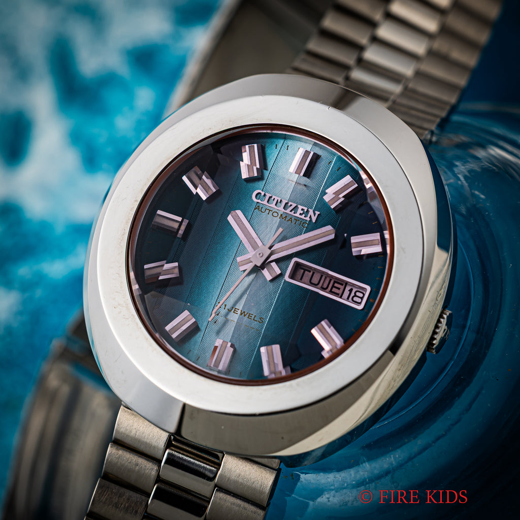 1973年製のシチズンセブンスターV2です。シチズンがセイコー5に対抗して作り上げた7つの機能を持つ時計として販売されました。カットガラスにブルーグラデーションダイヤルの1970年代の雰囲気を感じる組み合わせの一本です。ケースは、ステンレスケースとなっており、保管スレ程度の小傷はございますが大きなダメージ等なくきれいな状態です。ほとんど使用した形跡は無く裏ブタのシールもそのまま残って、当時のタグも付いたN.O.S(ニューオールドストック)状態です。ブレスは純正のブレスレットが取り付けています。