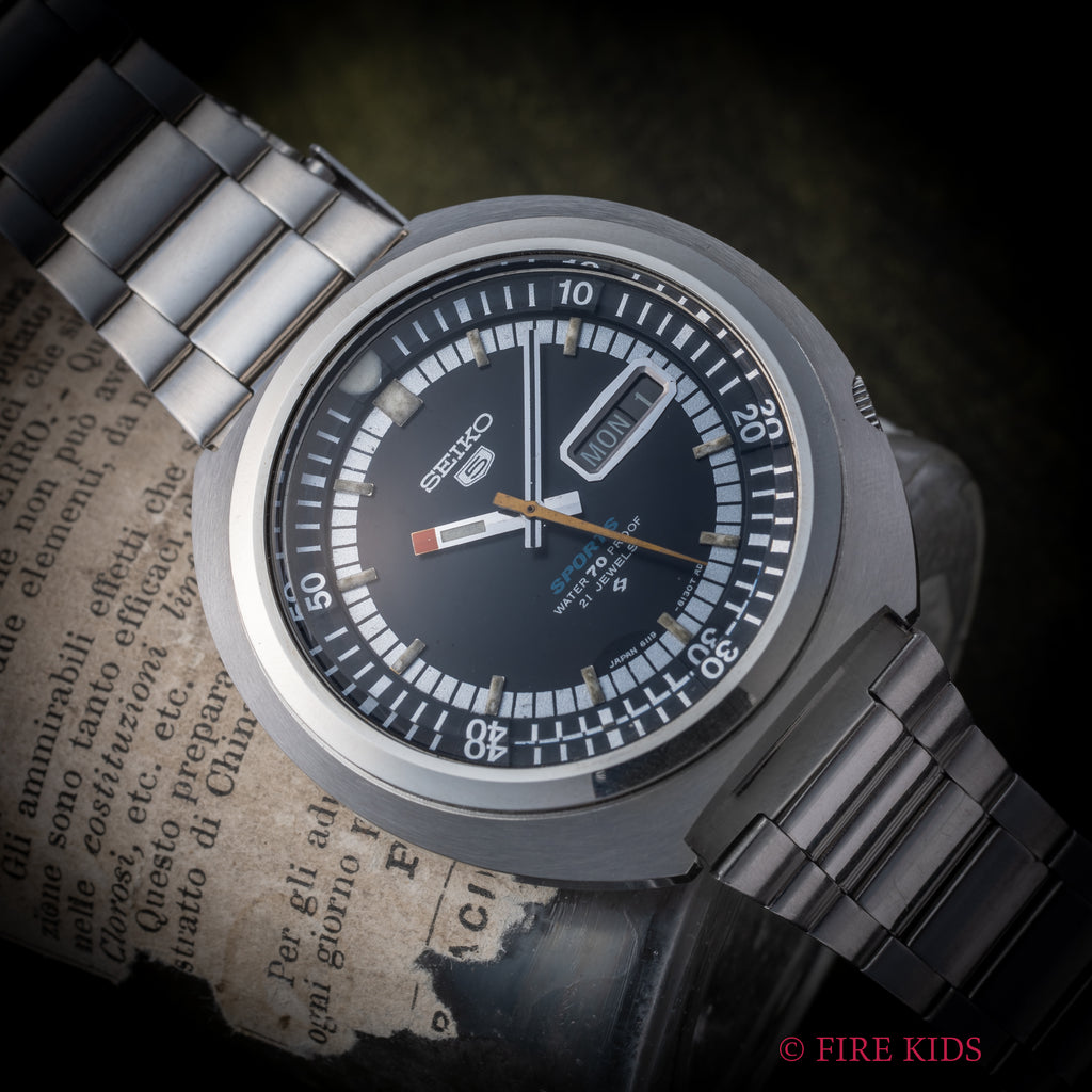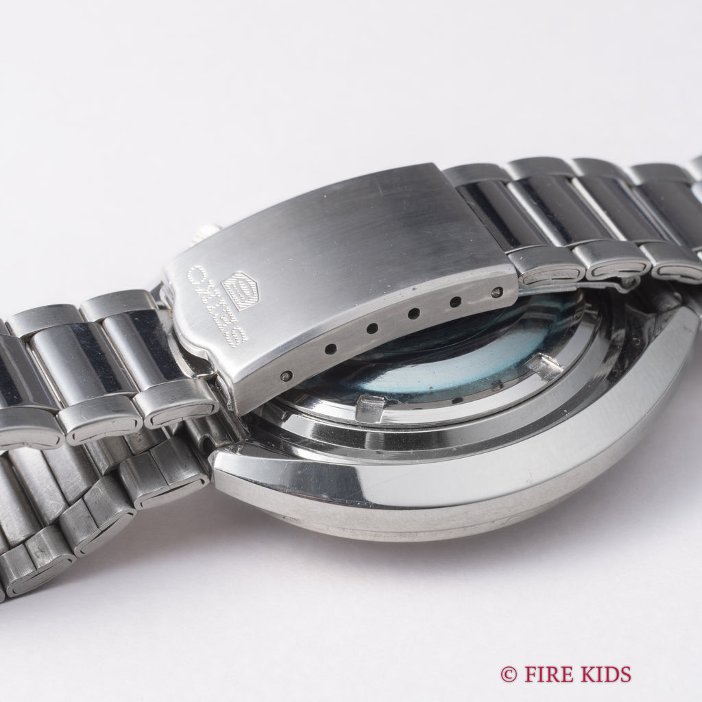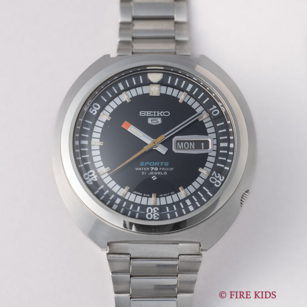 セイコー5スポーツ 1969年製 Ref.6119-7160です。インナー回転ベゼルを装備したスポーティーなモデルです。直径約43mmのステンレススチール製で、当時としては大型の樽型ケース(トノー型)を採用しており、その形状から「UFO」という愛称で呼ばれることもあります。文字盤、ケースは保管時の小傷がわずかにありますがとてもきれいなコンディションを保っています。裏シールも残っています。リューズ操作はスムースです。純正のブレスレットが付いております。
