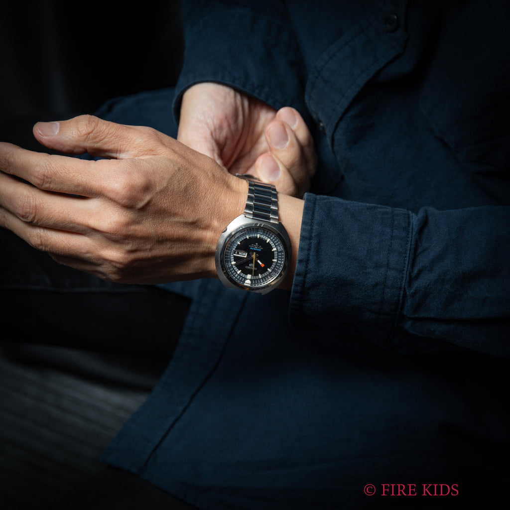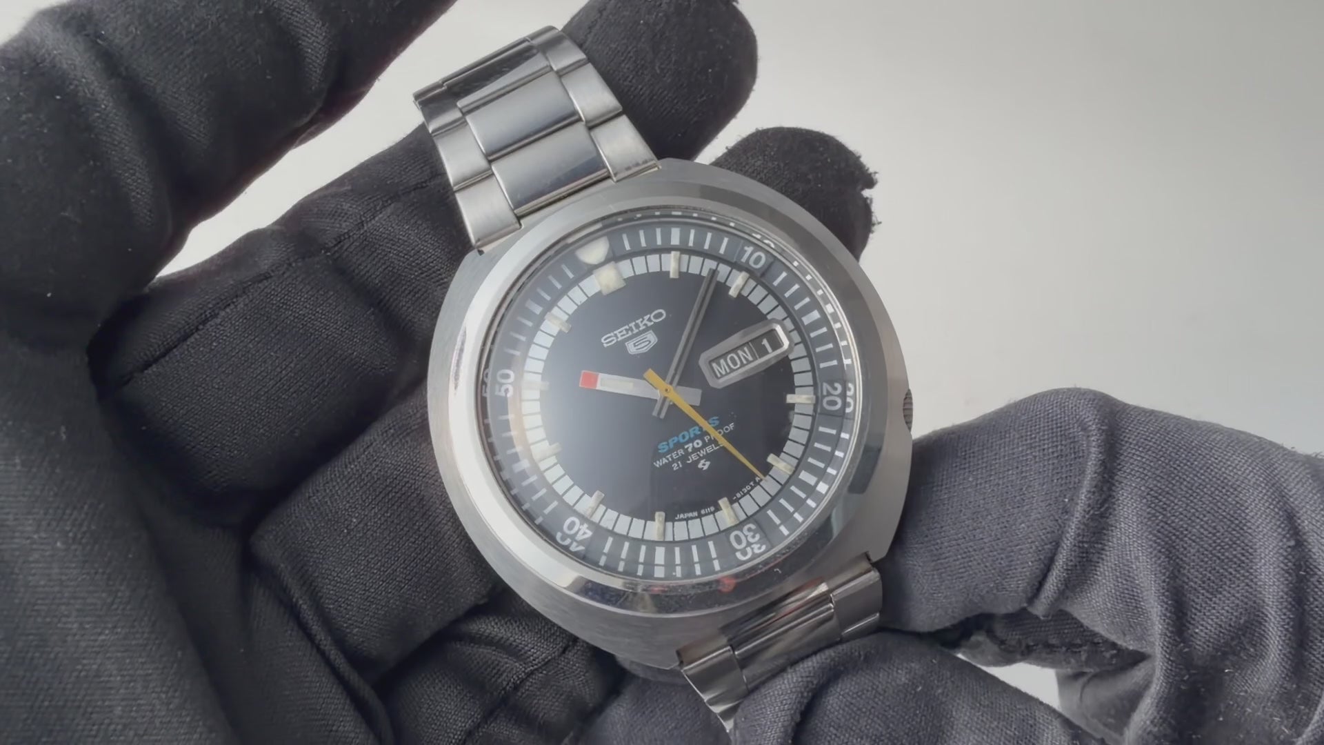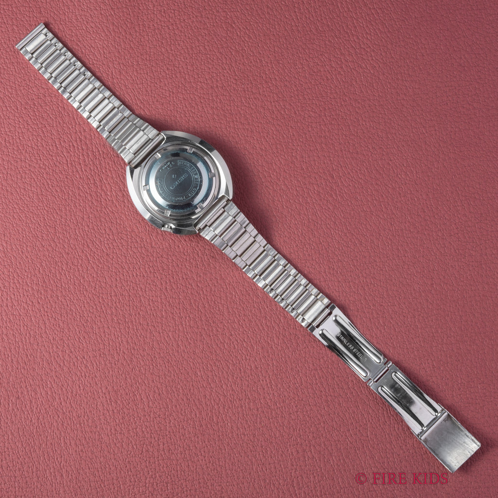 セイコー5スポーツ 1969年製 Ref.6119-7160です。インナー回転ベゼルを装備したスポーティーなモデルです。直径約43mmのステンレススチール製で、当時としては大型の樽型ケース(トノー型)を採用しており、その形状から「UFO」という愛称で呼ばれることもあります。文字盤、ケースは保管時の小傷がわずかにありますがとてもきれいなコンディションを保っています。裏シールも残っています。リューズ操作はスムースです。純正のブレスレットが付いております。