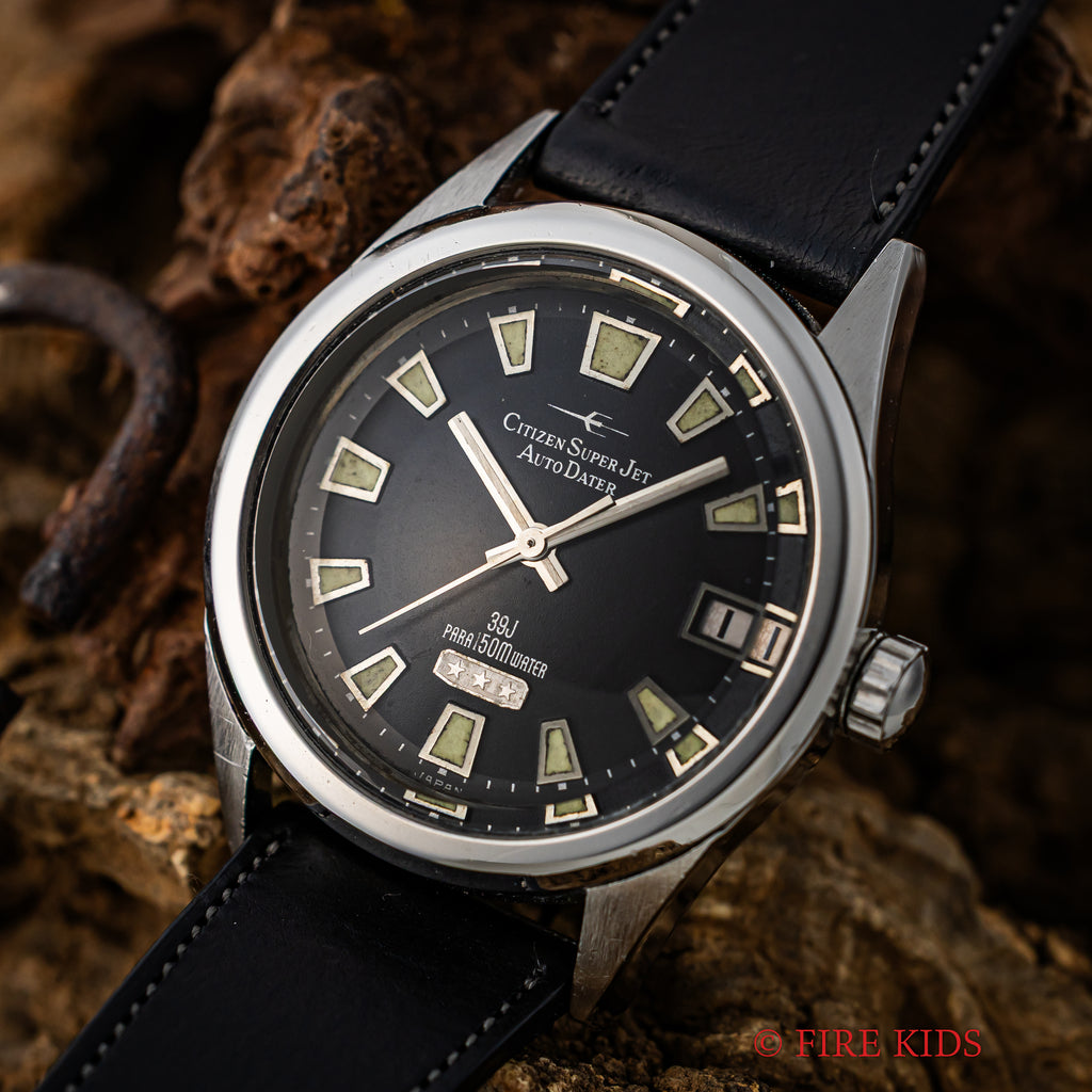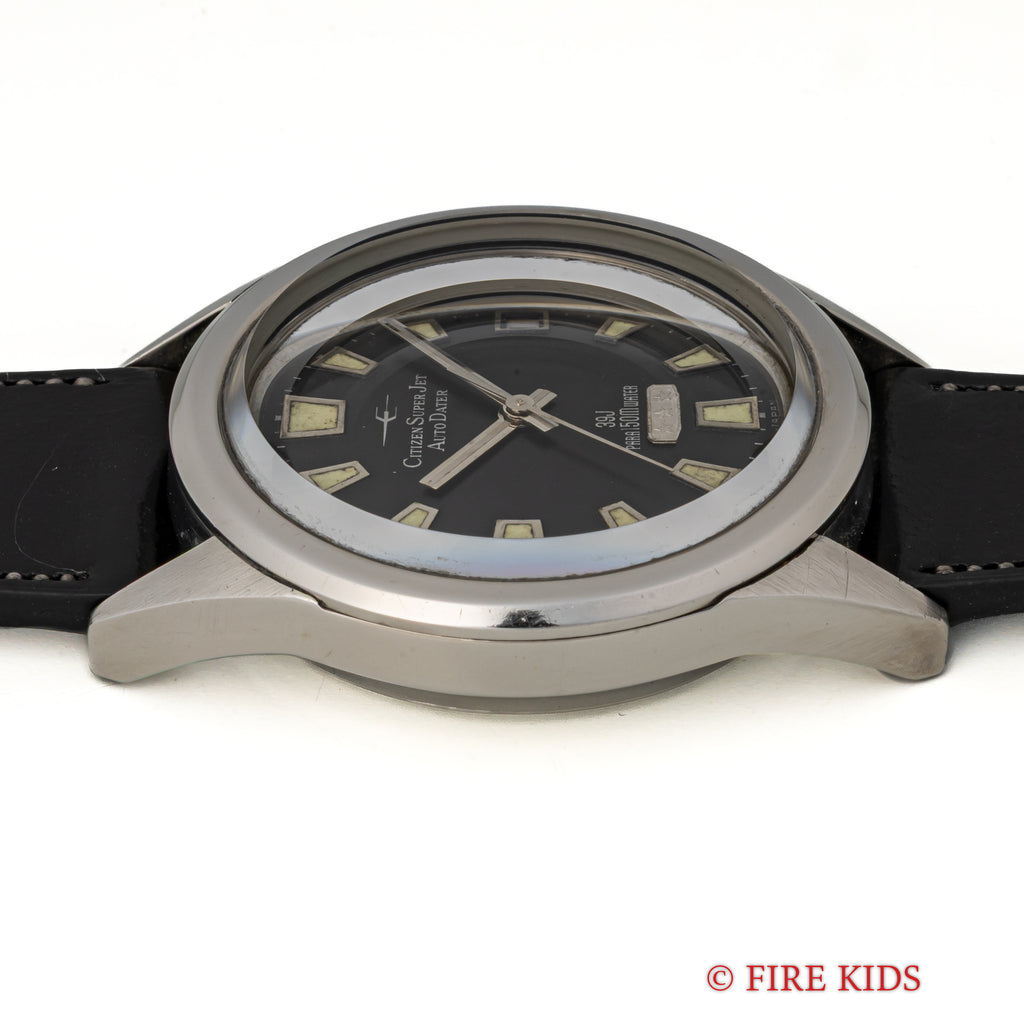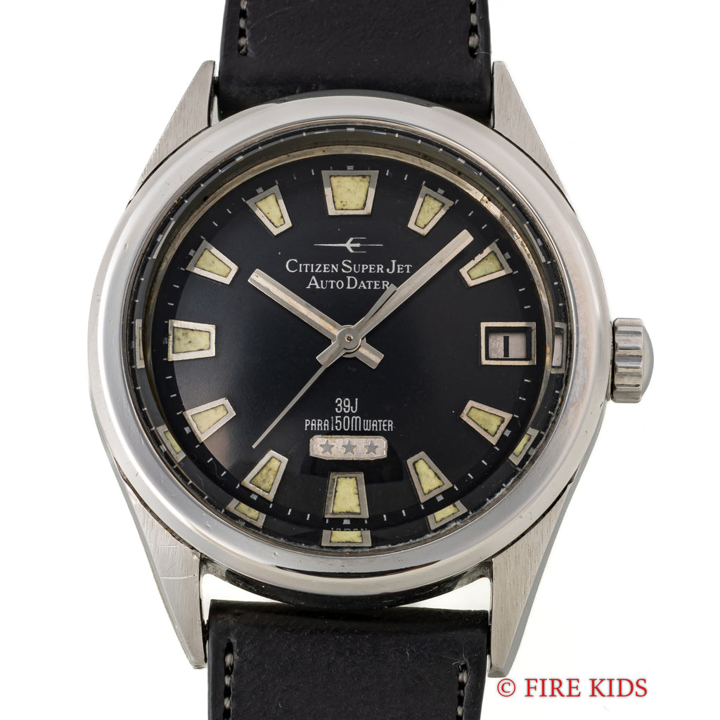 シチズン スーパージェット オートデーター 150mダイバー 1966年製 ブラックダイヤルの入荷になります。シチズンの初期自動巻きモデルのジェットに日付を追加したオートデーターで150m防水仕様のスペシャルモデルです。シチズンではスーパーが付くモデルは特別調整が施されたモデルになります。夜光入りの文字盤針で艶のあるブラックダイヤル、分厚いガラスも魅力的です。文字盤はシミ等無く綺麗です。ケースは小傷が見られますが大きなダメージはありません。ムーブメントは39石の高級仕様です。手巻きや針回しの操作はスムースです。ベルトはファイアーキッズオリジナルのイタリアンレザーのブッテーロ(裏面ラバー)が取り付けられています。