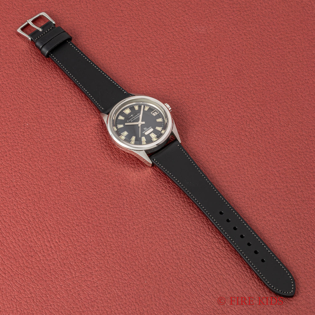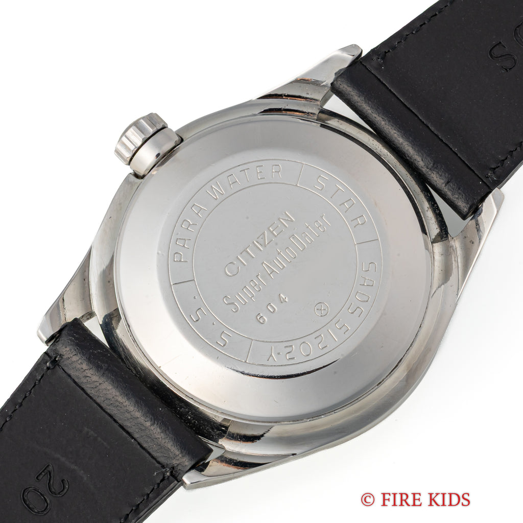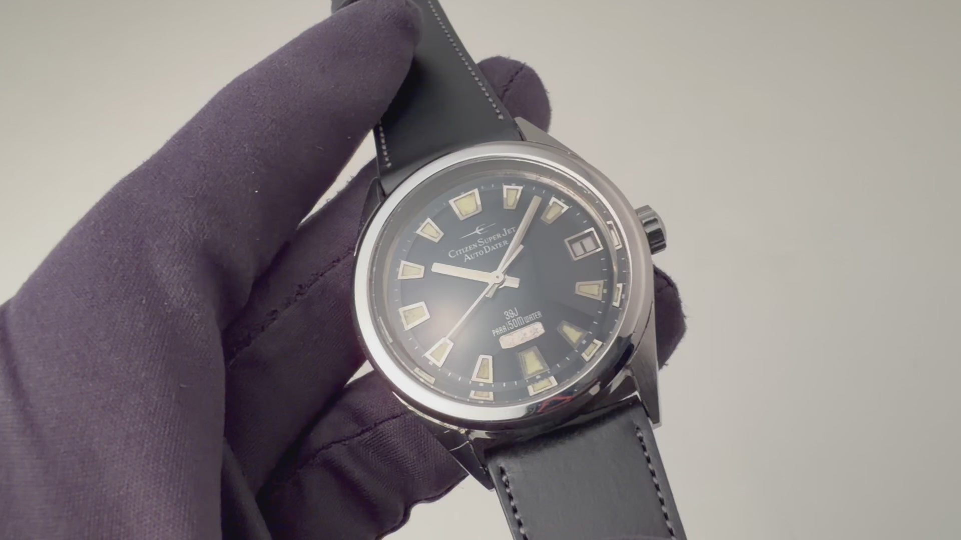 シチズン スーパージェット オートデーター 150mダイバー 1966年製 ブラックダイヤルの入荷になります。シチズンの初期自動巻きモデルのジェットに日付を追加したオートデーターで150m防水仕様のスペシャルモデルです。シチズンではスーパーが付くモデルは特別調整が施されたモデルになります。夜光入りの文字盤針で艶のあるブラックダイヤル、分厚いガラスも魅力的です。文字盤はシミ等無く綺麗です。ケースは小傷が見られますが大きなダメージはありません。ムーブメントは39石の高級仕様です。手巻きや針回しの操作はスムースです。ベルトはファイアーキッズオリジナルのイタリアンレザーのブッテーロ(裏面ラバー)が取り付けられています。