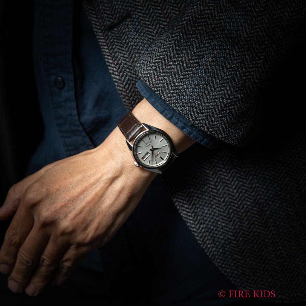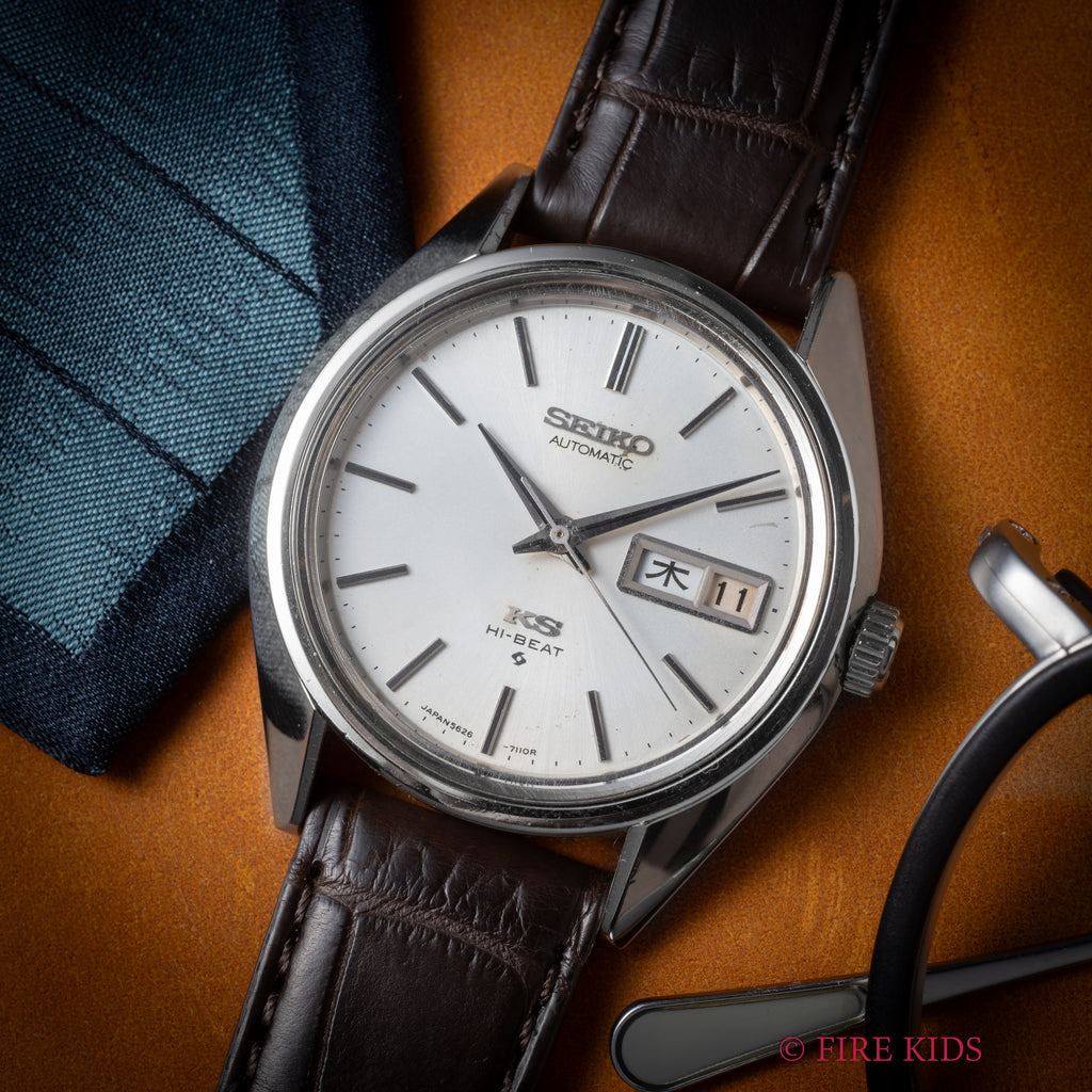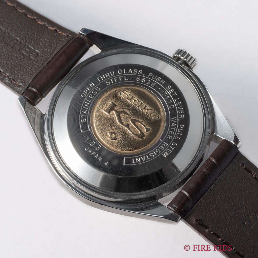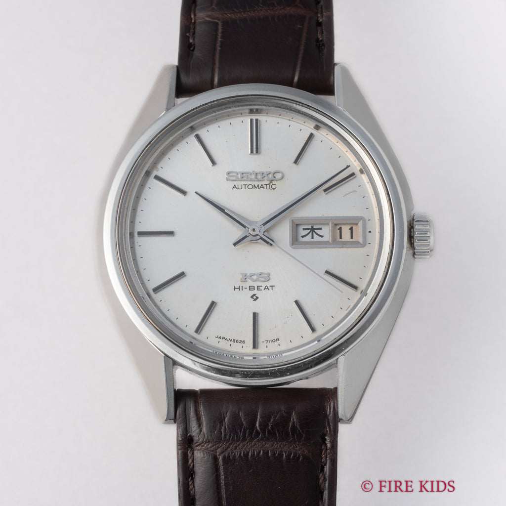 キングセイコー 1971年製 Ref.5626-7110 56KS ハイビート自動巻きです。こちらは前期型でケースがワンピースケースになっているタイプで、少々小傷はございますが裏のメダリオンもキレイに残っています。ムーブメントはハイビートにハック機能(秒針規制)とカレンダー早送りを備えた5626を搭載。手巻きや針回しの操作はスムースです。ベルトはファイアーキッズオリジナル、クロコダイルが取り付けられています。
